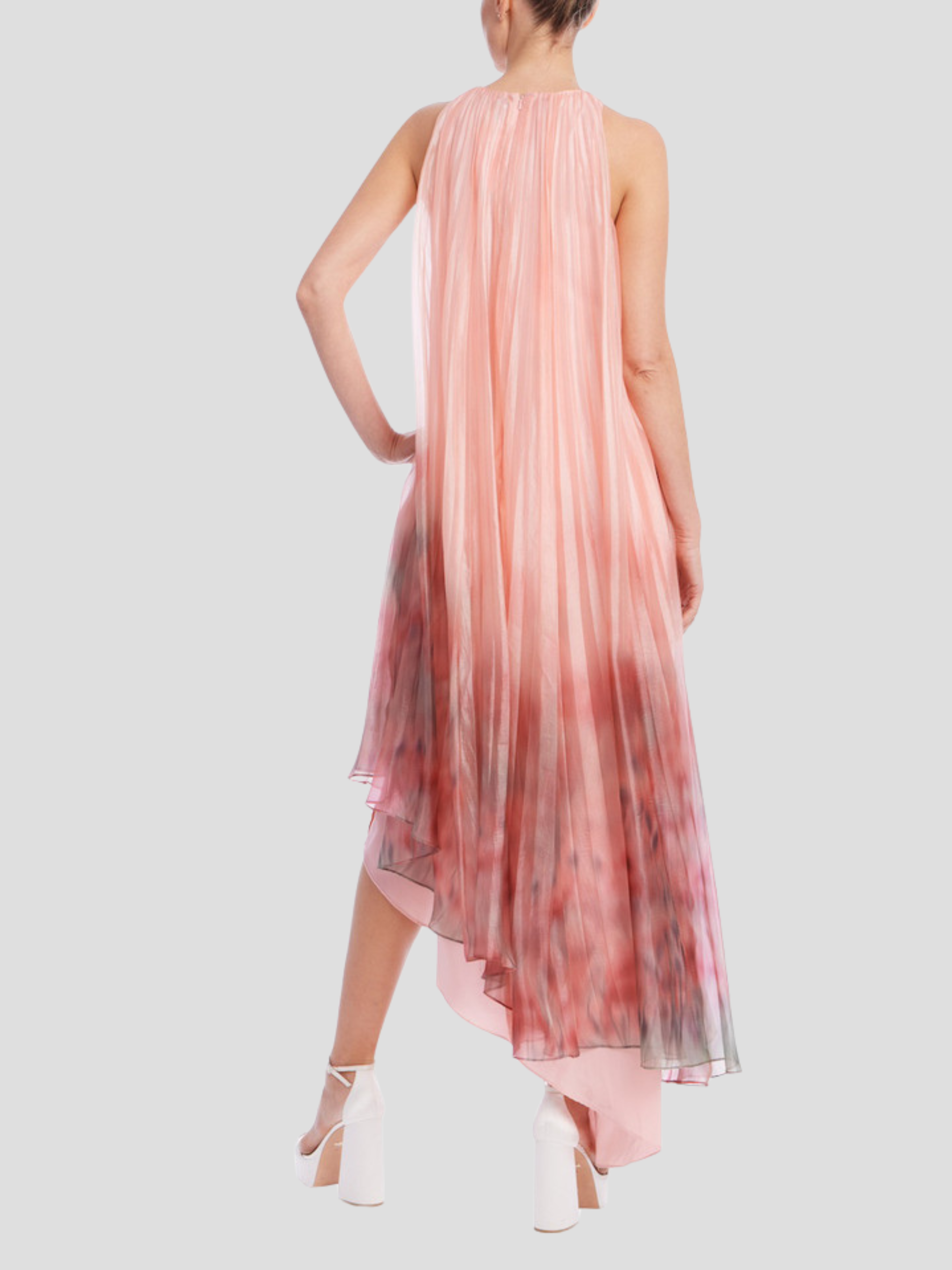 Effortlessly ethereal, the Ombre Pleated High-Low Dress captivates with its airy silhouette and dreamy color palette. This sleeveless chiffon dress features a soft rose hue that deepens into a romantic, watercolor-inspired ombré at the hem. The high neckline and delicate pleating offer graceful movement, while the asymmetric hem adds a modern edge. Perfect for garden parties, destination weddings, or any occasion that calls for subtle sophistication with a twist.