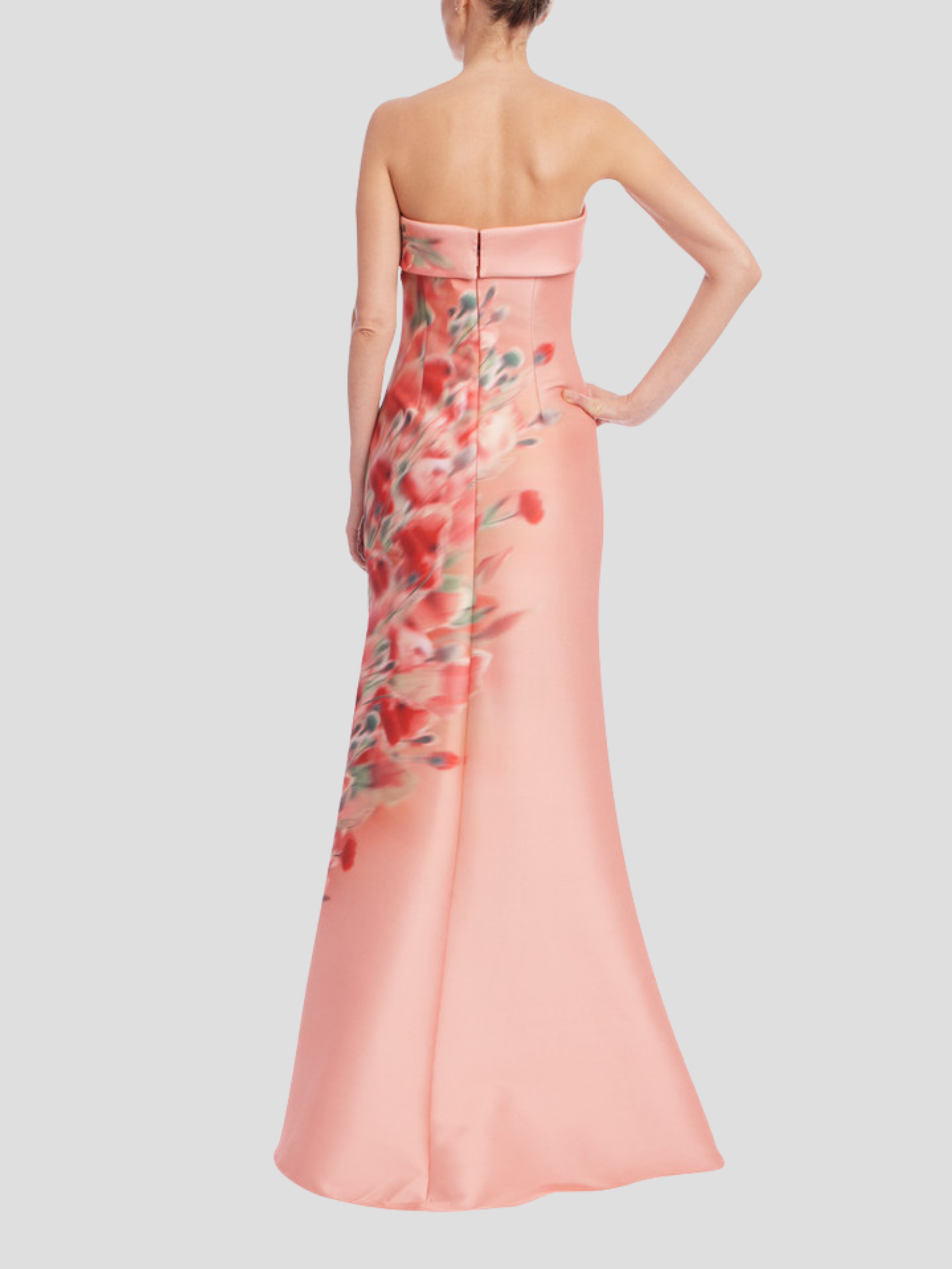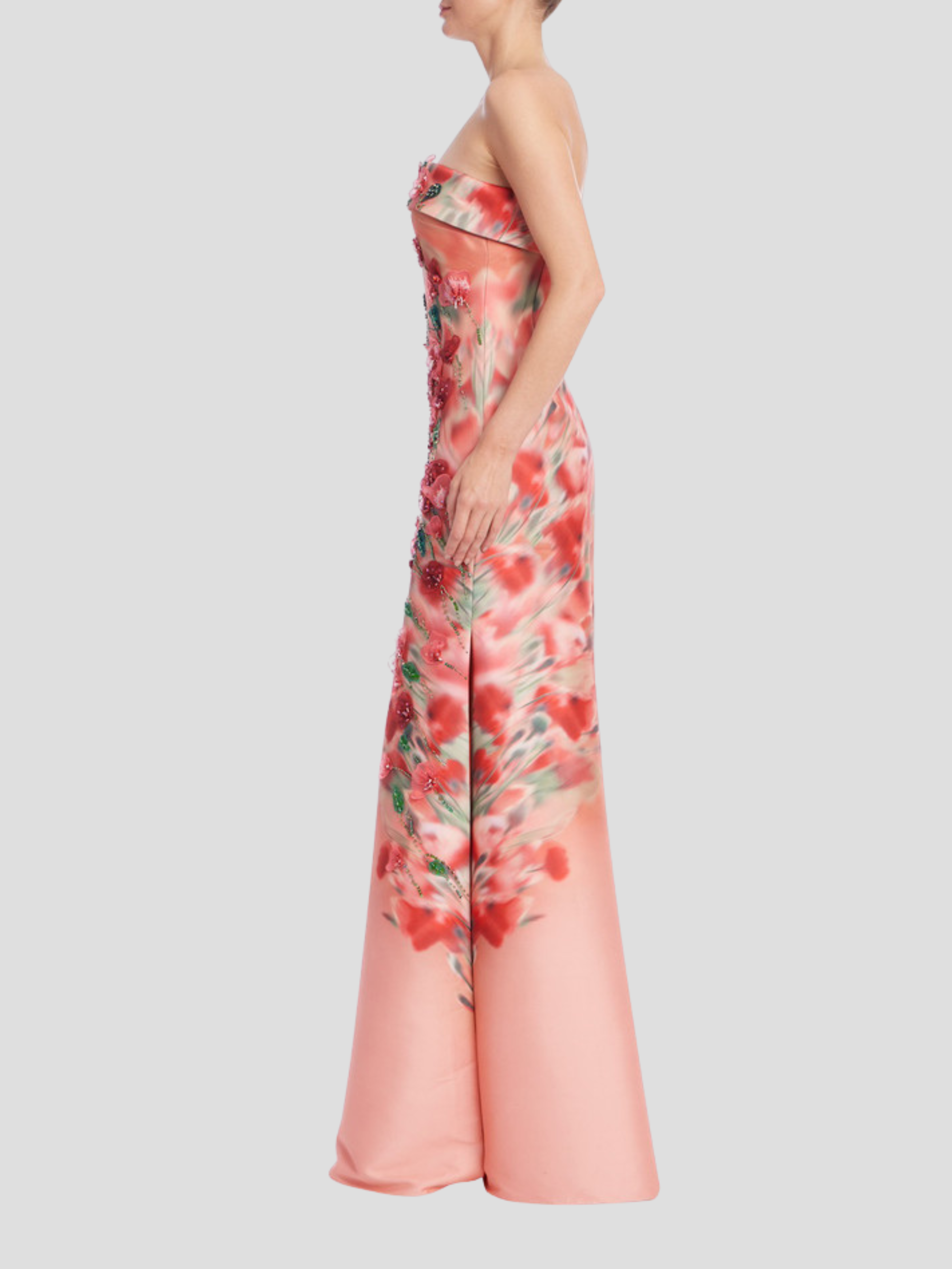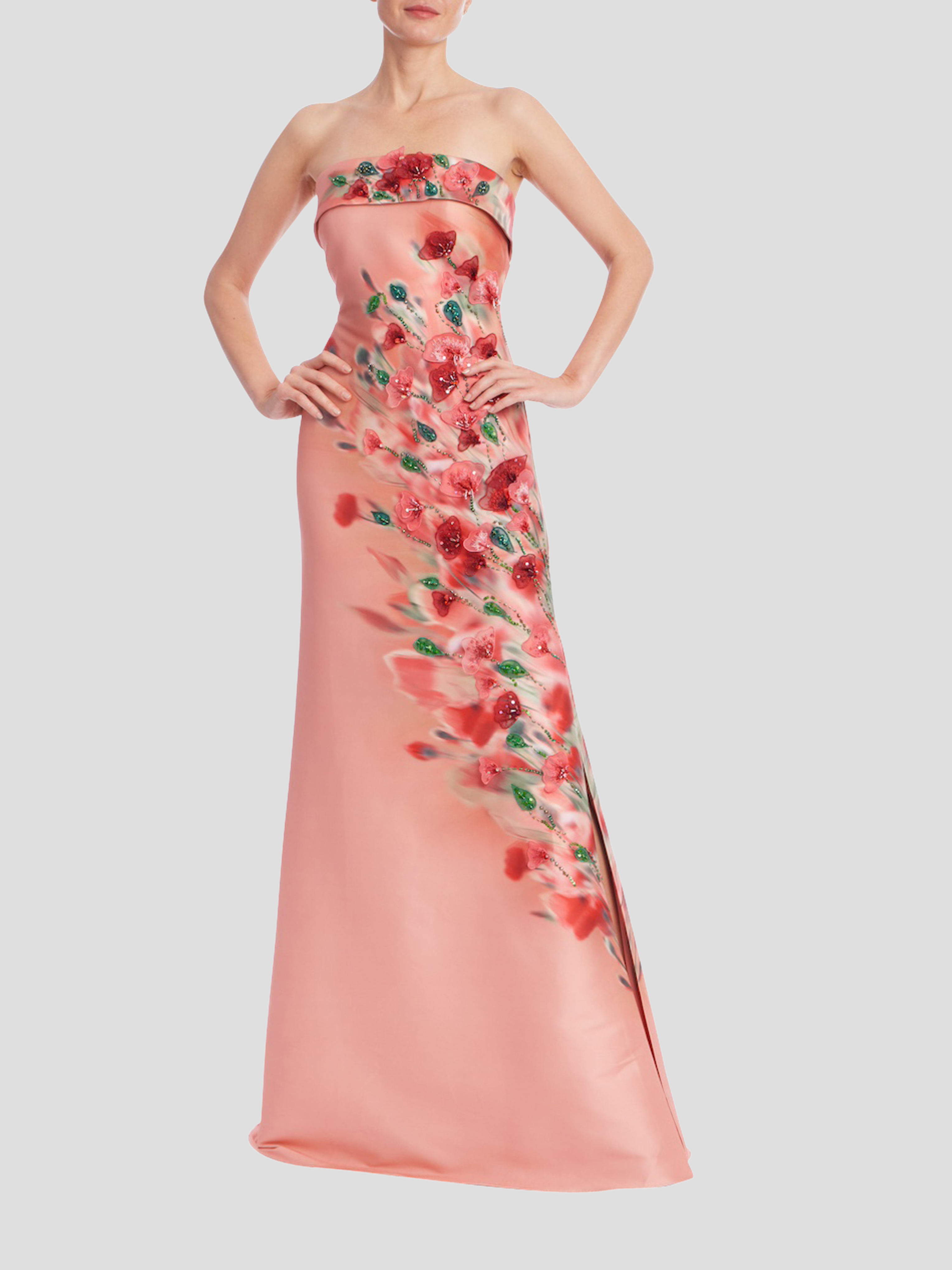 Emanate refined romance in the Blossom Drift Strapless Gown, a stunning creation that blends artistry with elegance. Crafted in a soft blush hue, this floor-length satin gown features a sculpted strapless neckline and a sleek, column silhouette. Hand-applied floral embellishments in shades of pink, red and green cascade diagonally across the bodice and skirt, creating a graceful, painterly effect reminiscent of petals swept by a spring breeze. A perfect choice for weddings, formal galas, or any occasion where timeless beauty is the dress code.