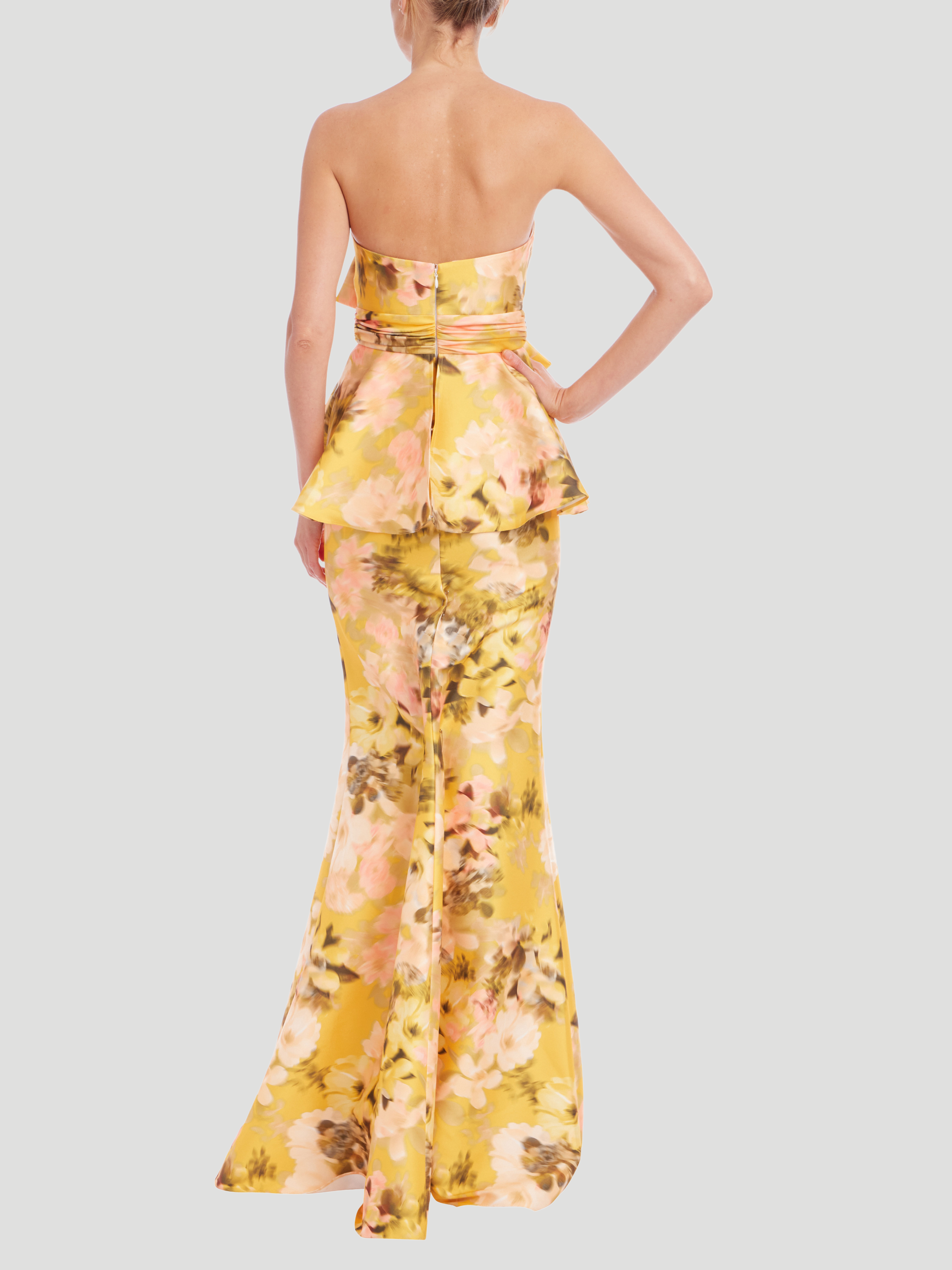 Dress to impress in the Bow Peplum Printed Gown from Badgley Mischka. With its charming floral print and eye-catching details, this dress is sure to turn heads. The stretch Mikado fabric offers a perfect balance of structure and comfort, while the oversized bow and playful peplum add a touch of drama. The curve-loving mermaid skirt completes the look for a sleek and elongating silhouette.