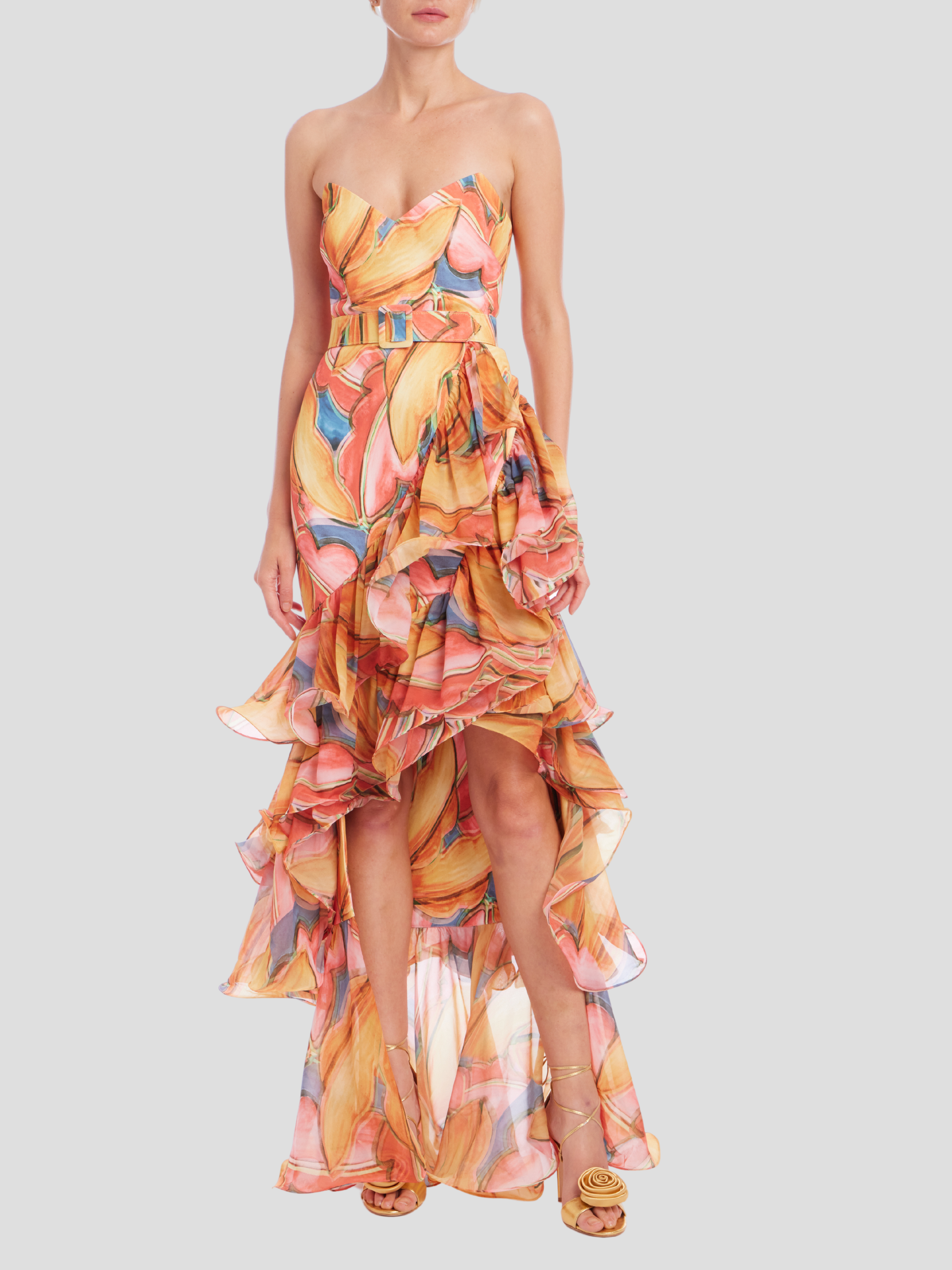 This strapless print tiered dress adds a pop of color to any wardrobe. The multi-colored design showcases a fun and vibrant print, while the tiered layers provide a flattering and feminine silhouette. Perfect for any occasion, this dress ensures both style and comfort.