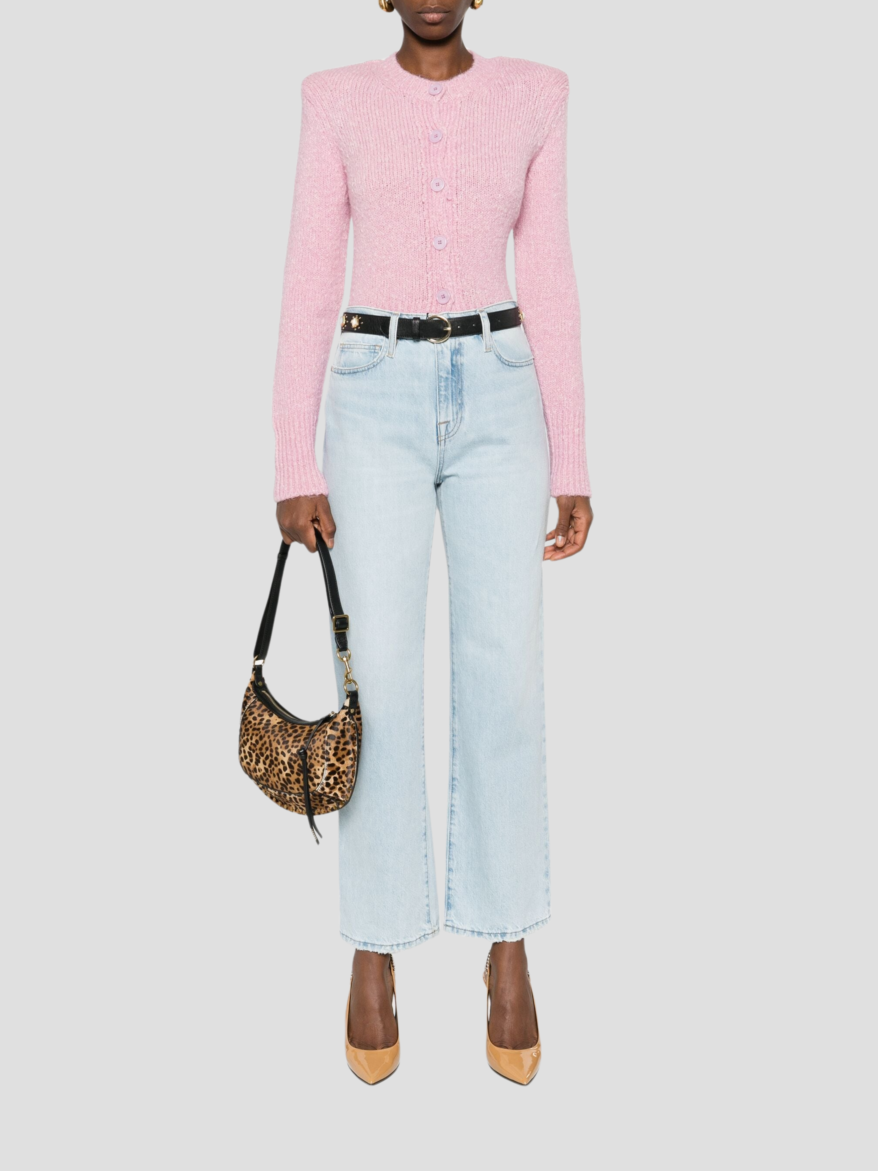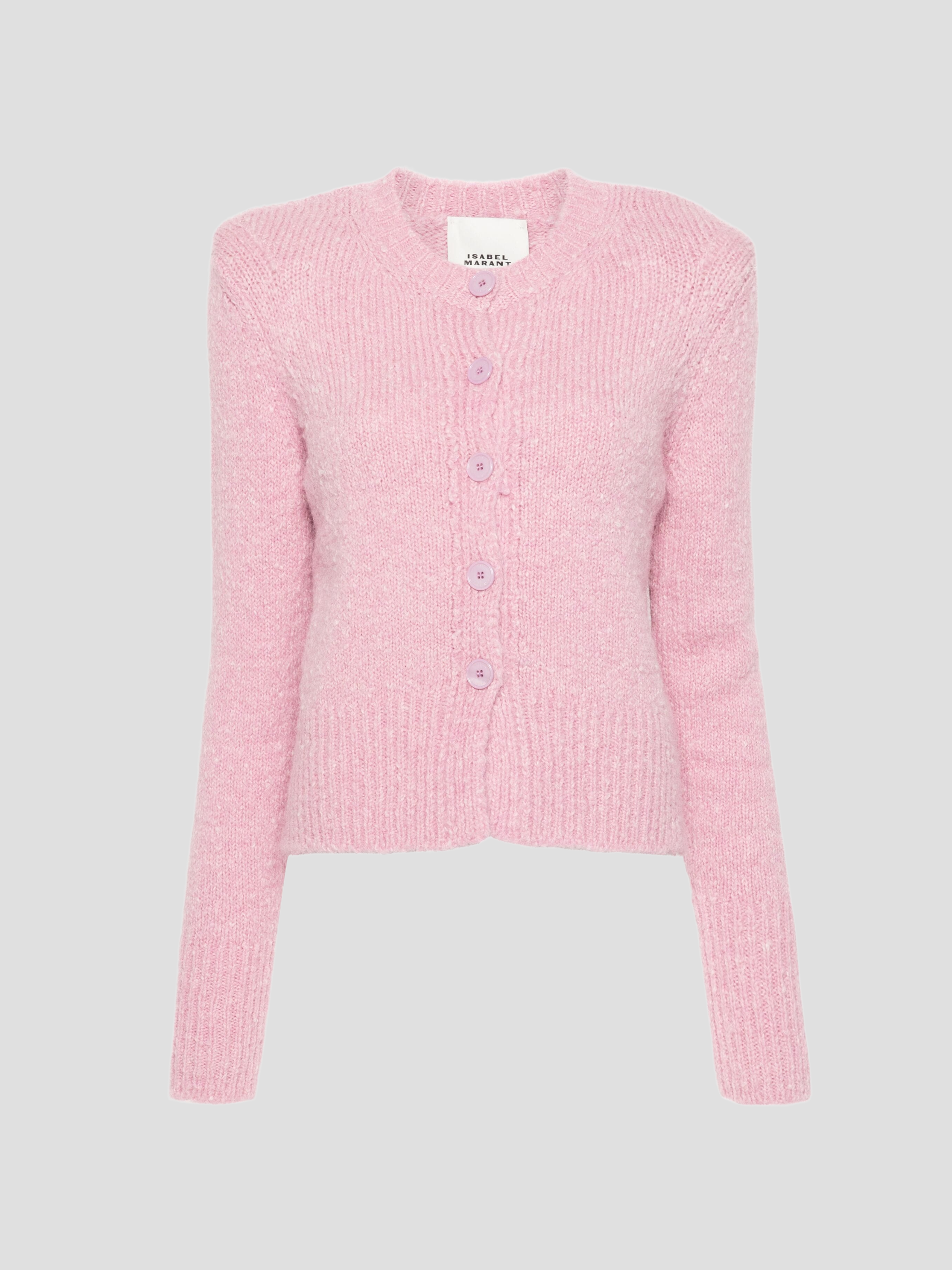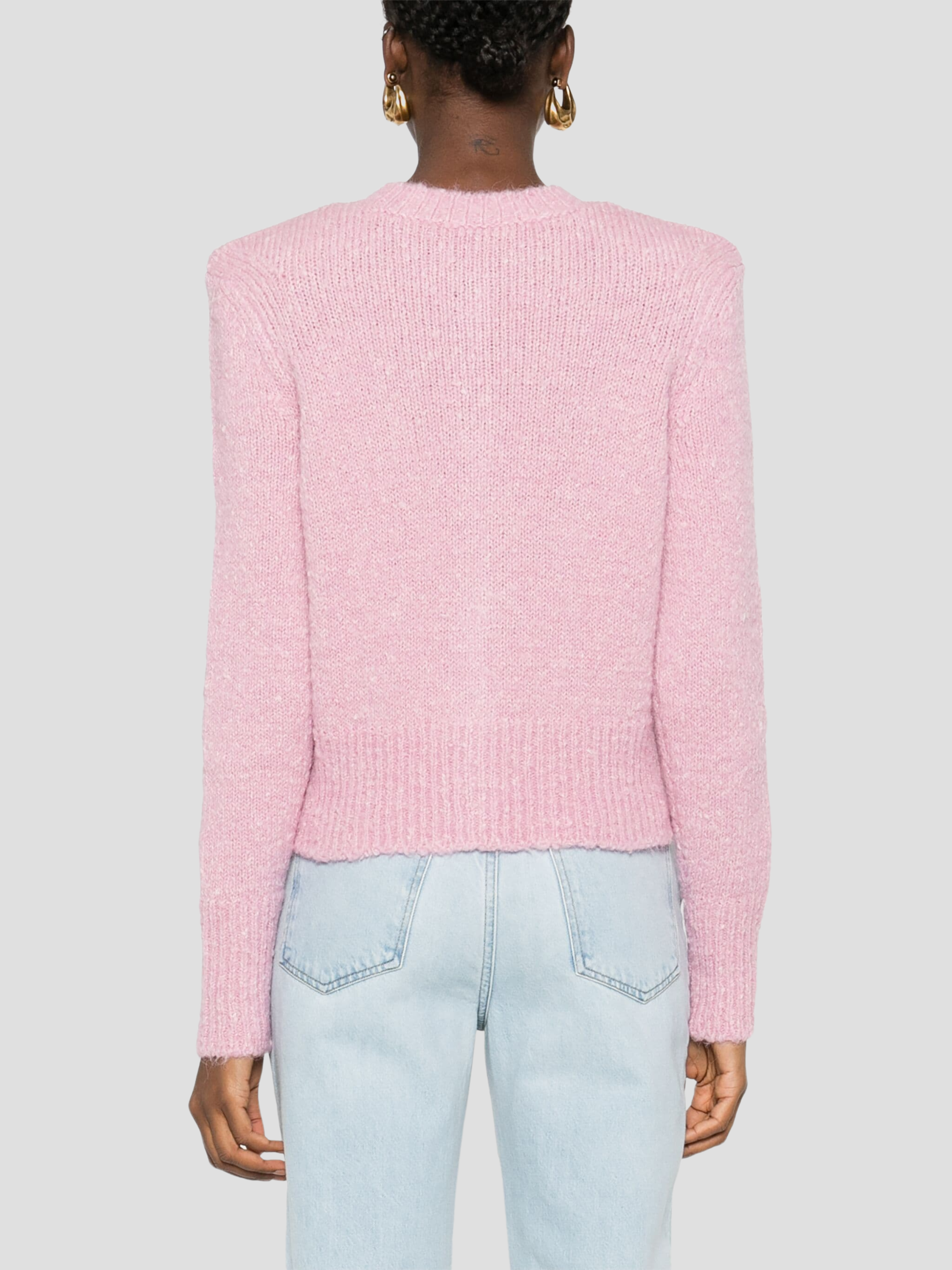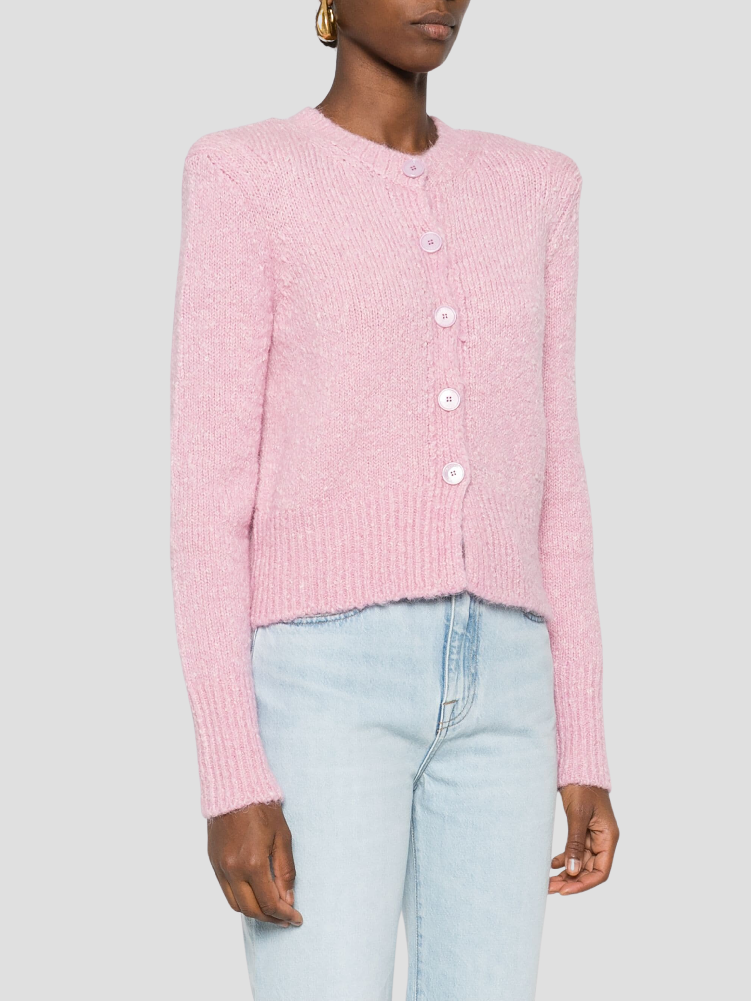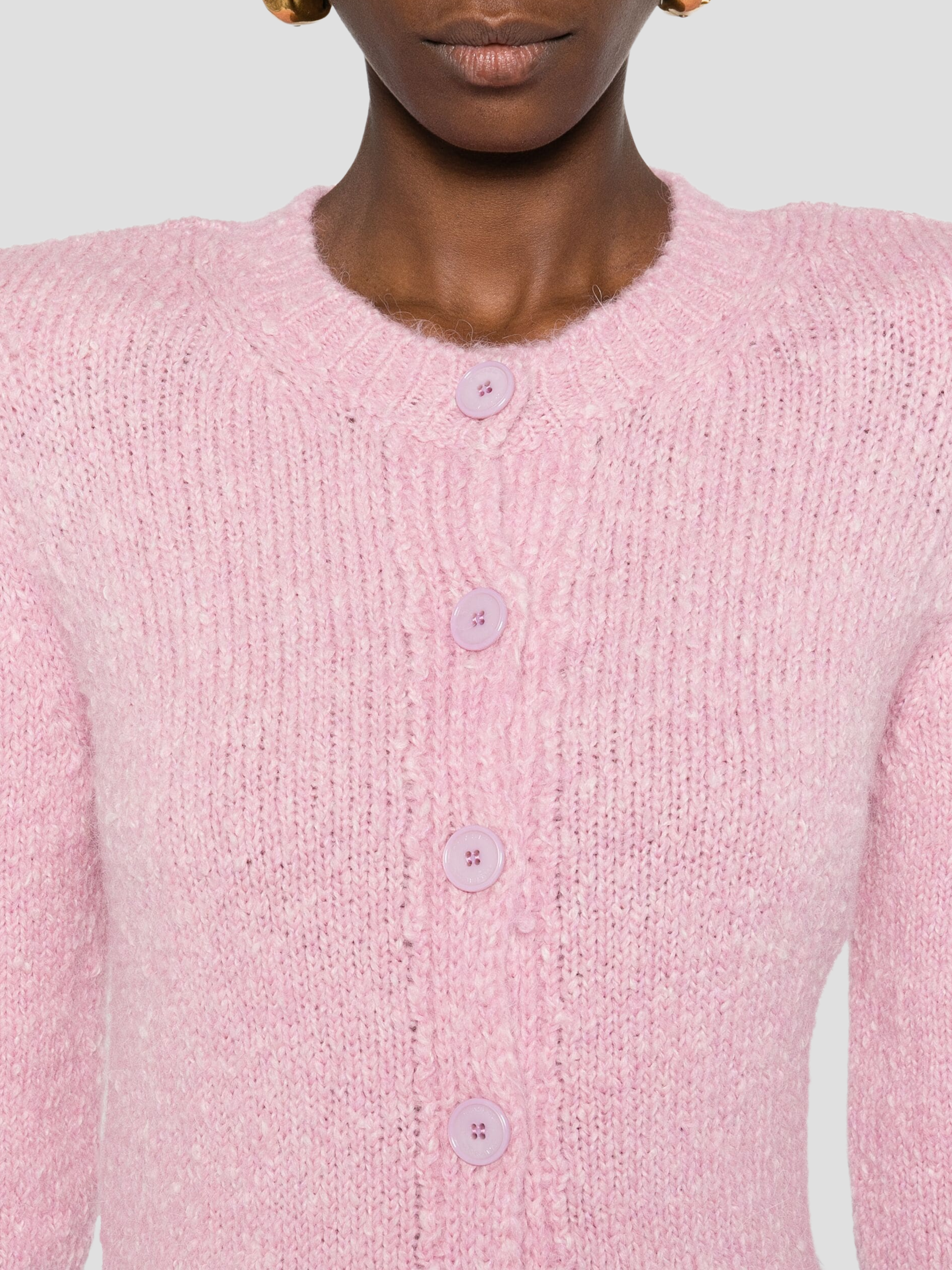 light pink alpaca-cotton blend knitted construction crew neck front button fastening shoulder pads long sleeves ribbed cuffs and hem