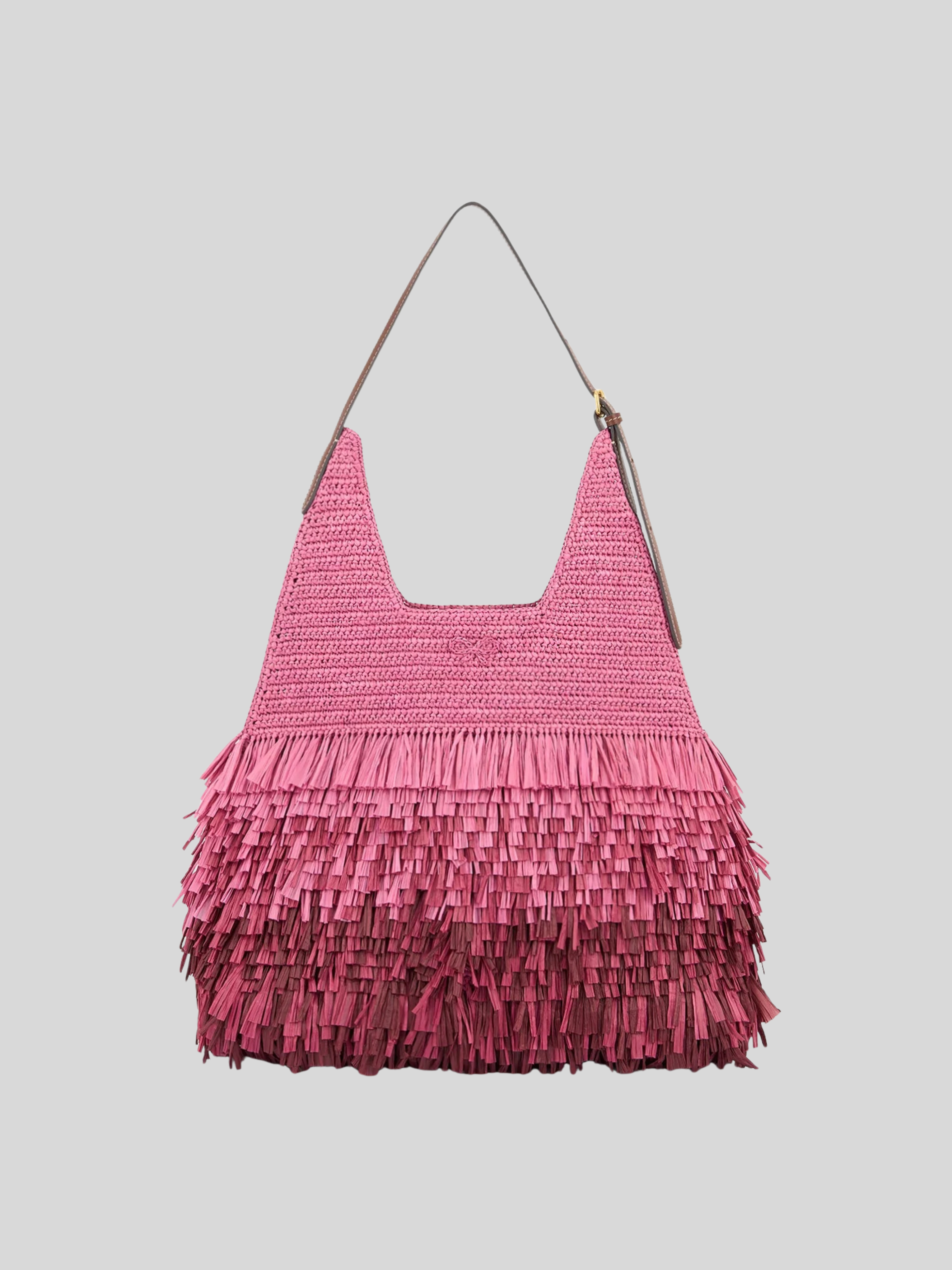 Handwoven from bubblegum-hued raffia, the Bow Hobo Bag is made for summer days. It features fringing in graduating shades of pink, with our bow motif woven into the design. The adjustable shoulder strap and interior are both made from eco leather, and it is roomy enough for everything you may need while on holiday or at home.