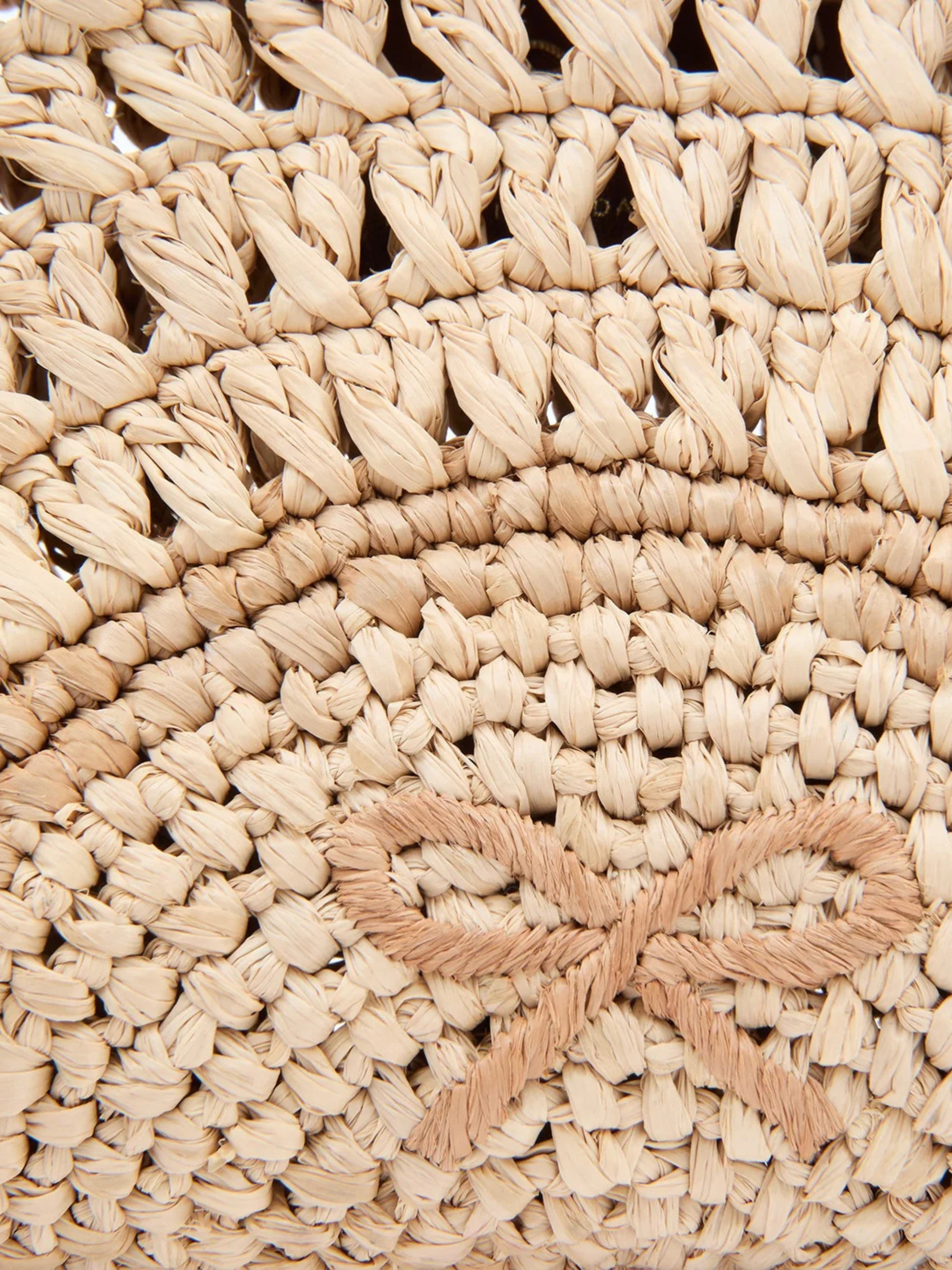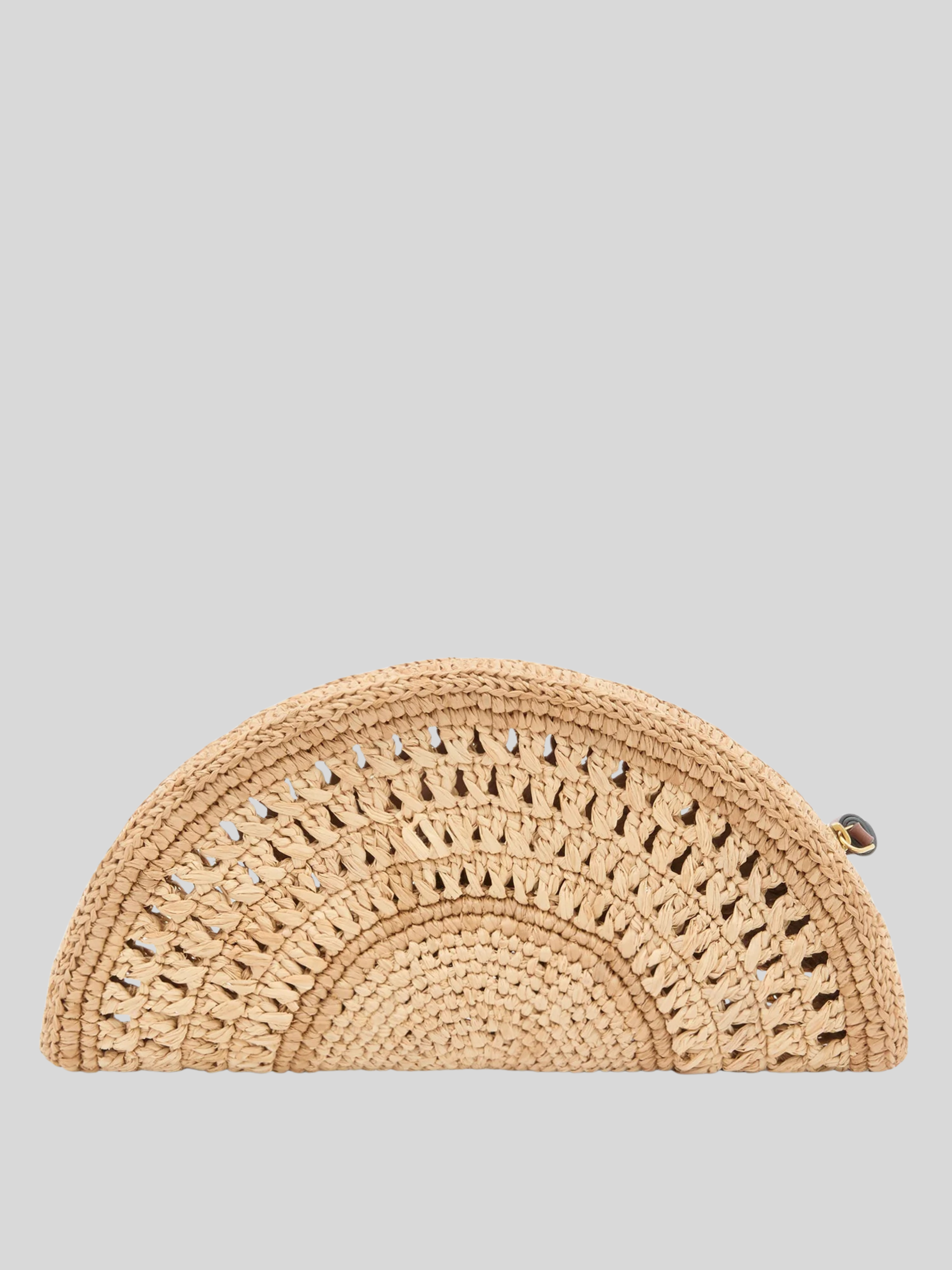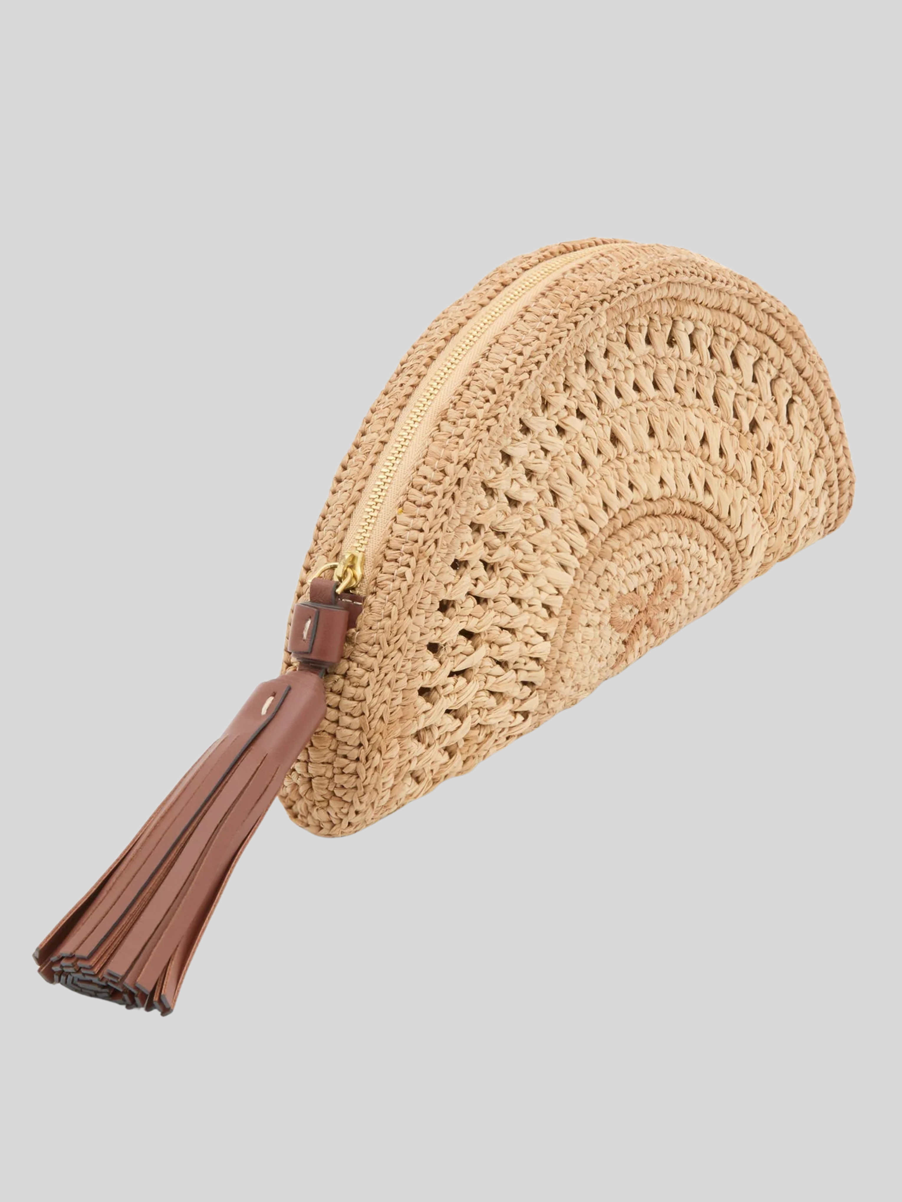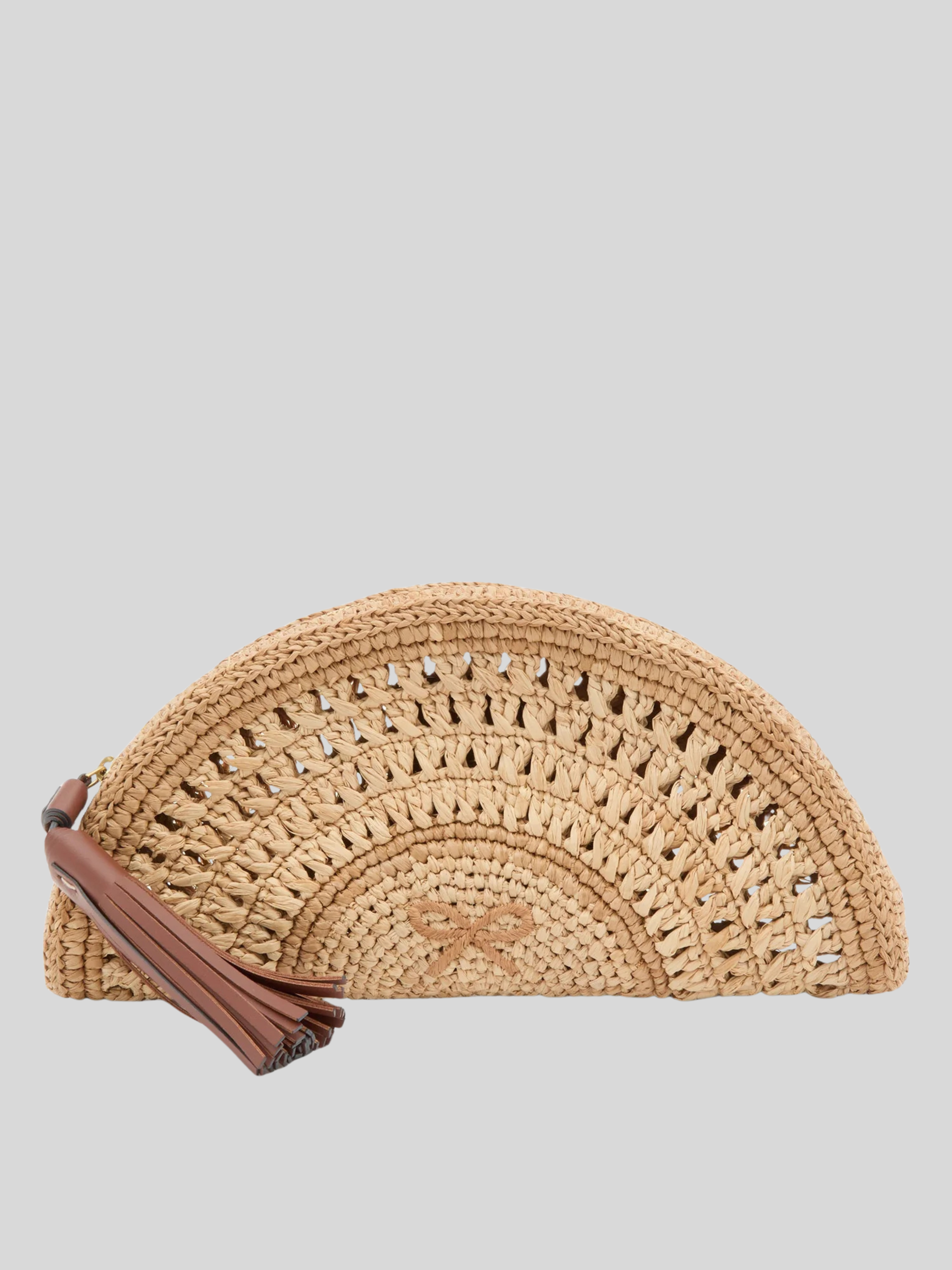 In natural raffia with capra-leather detailing, the Half Moon Bow Clutch is perfect. It is detailed with contrasting stitching and woven bow, as well as a handmade, oversized tassel.