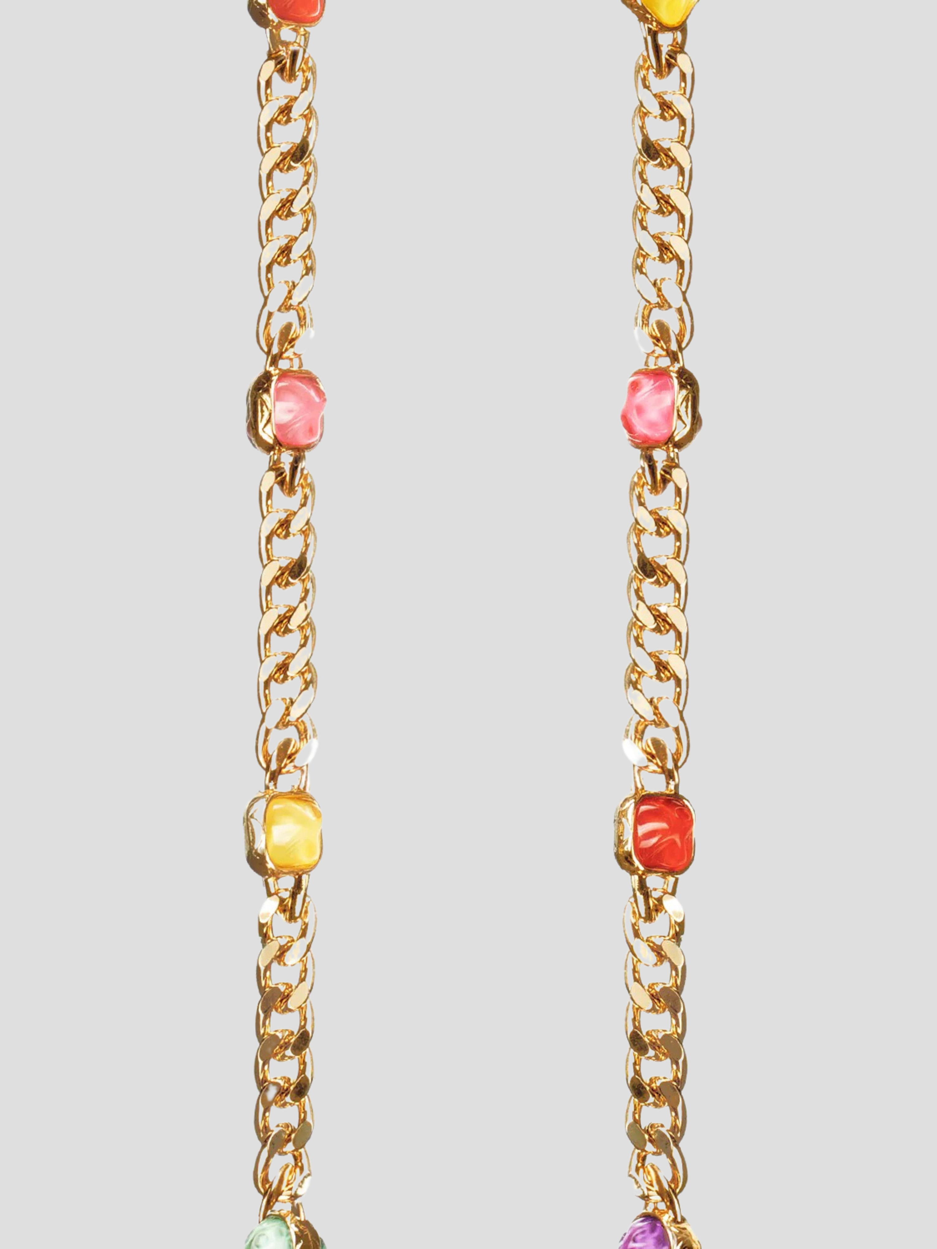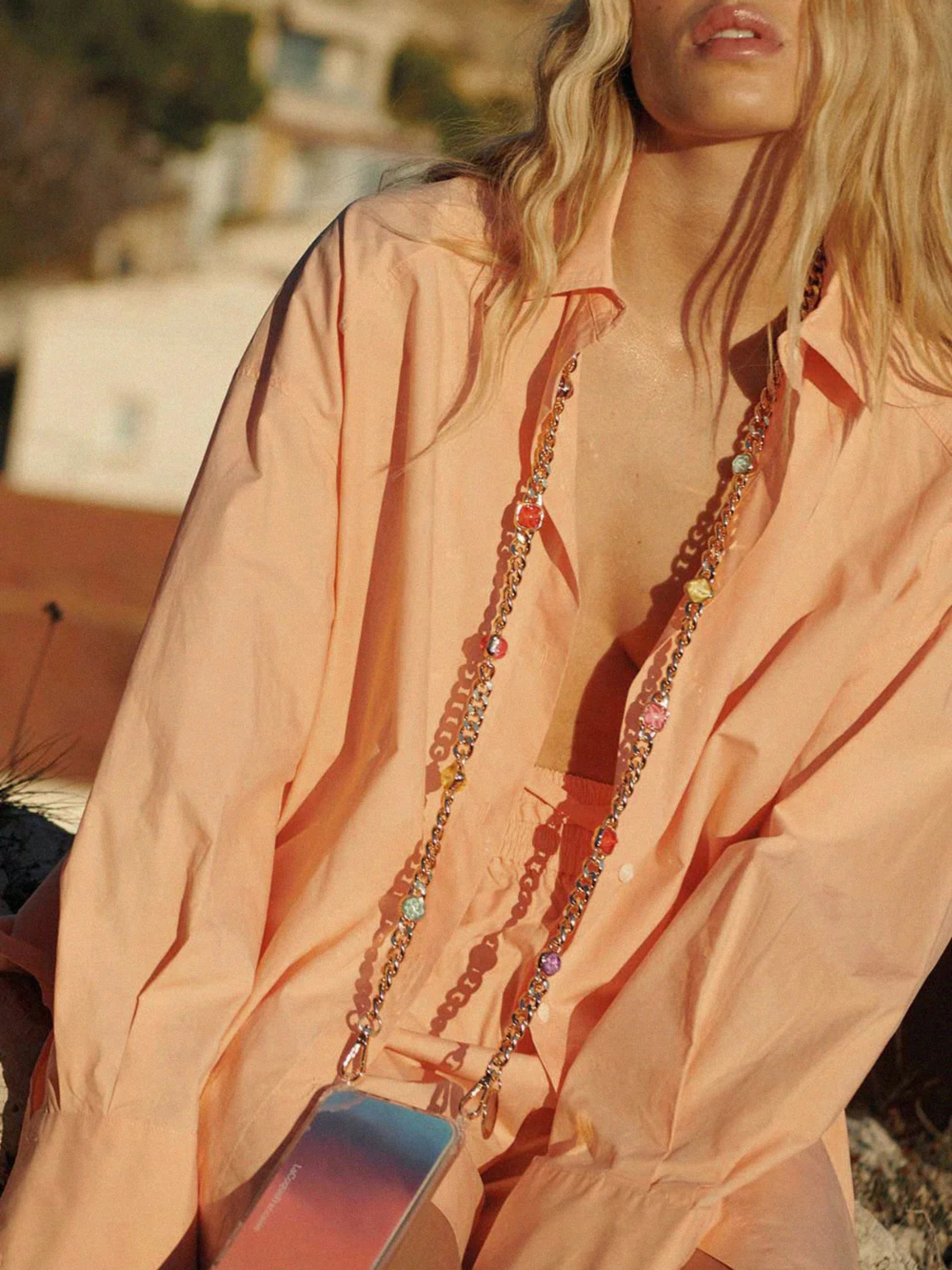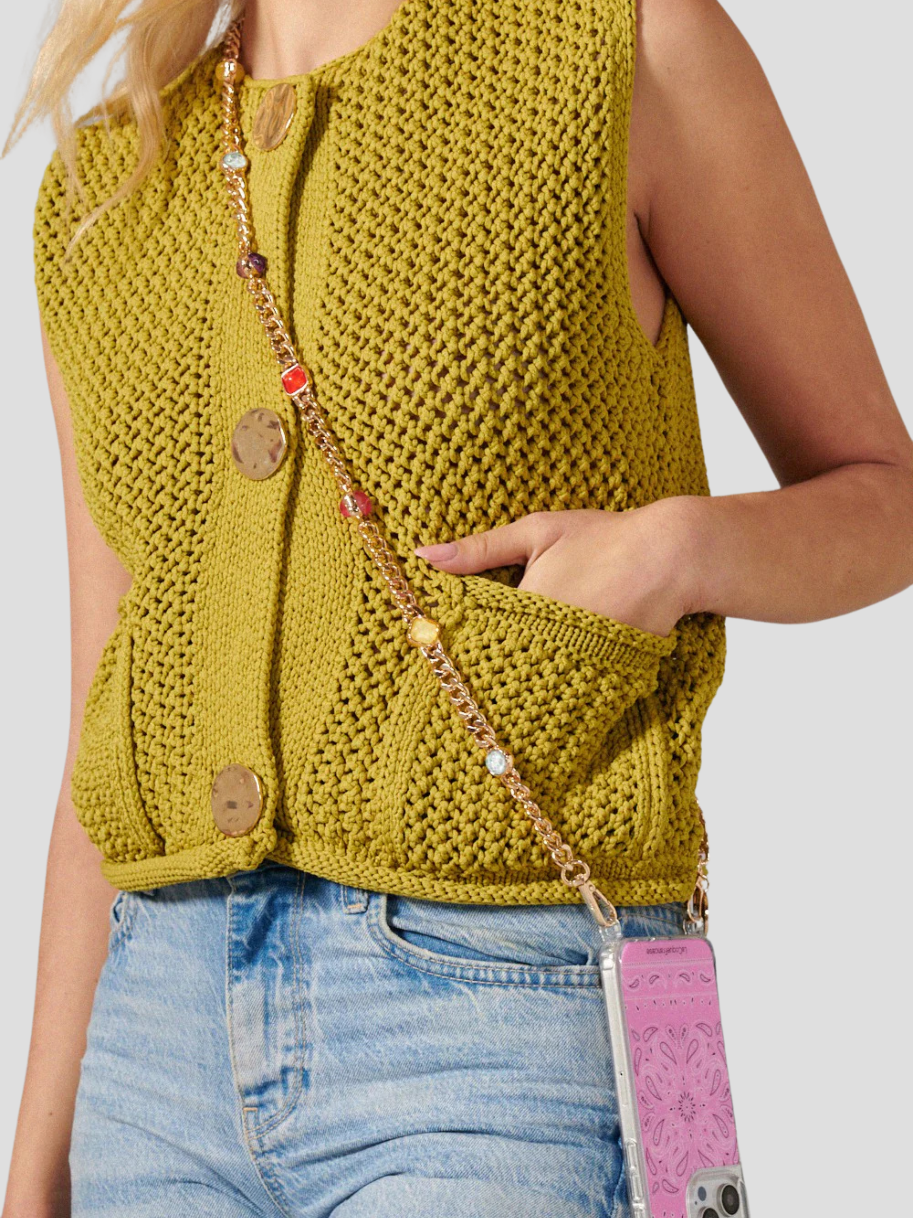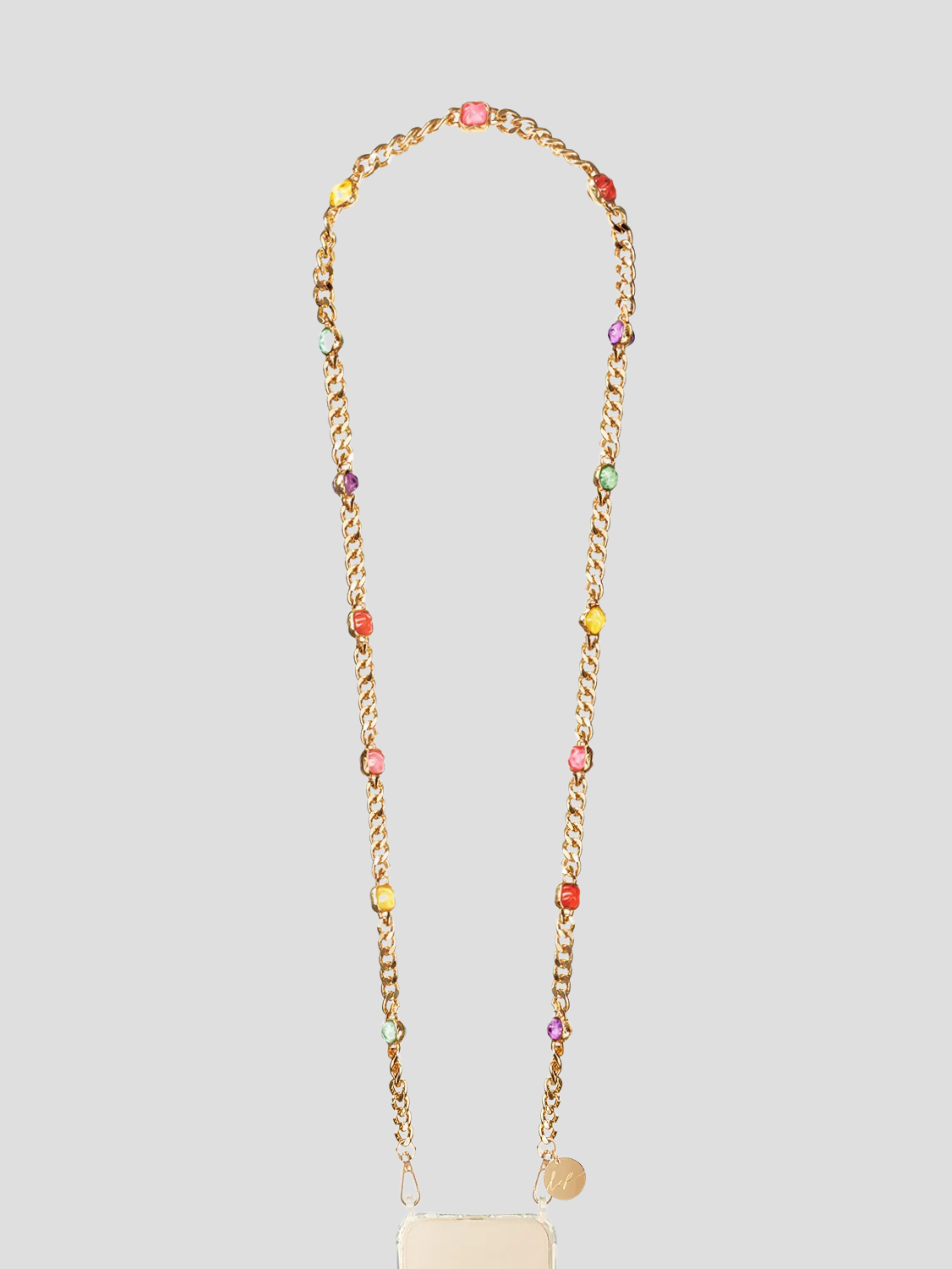 This 47" gemstone phone chain is a beautiful and functional accessory, featuring a stunning ruby gemstone. Perfect for keeping your phone close at hand while adding a touch of elegance to any outfit. Expertly crafted for durability and style, make a statement with this unique piece.