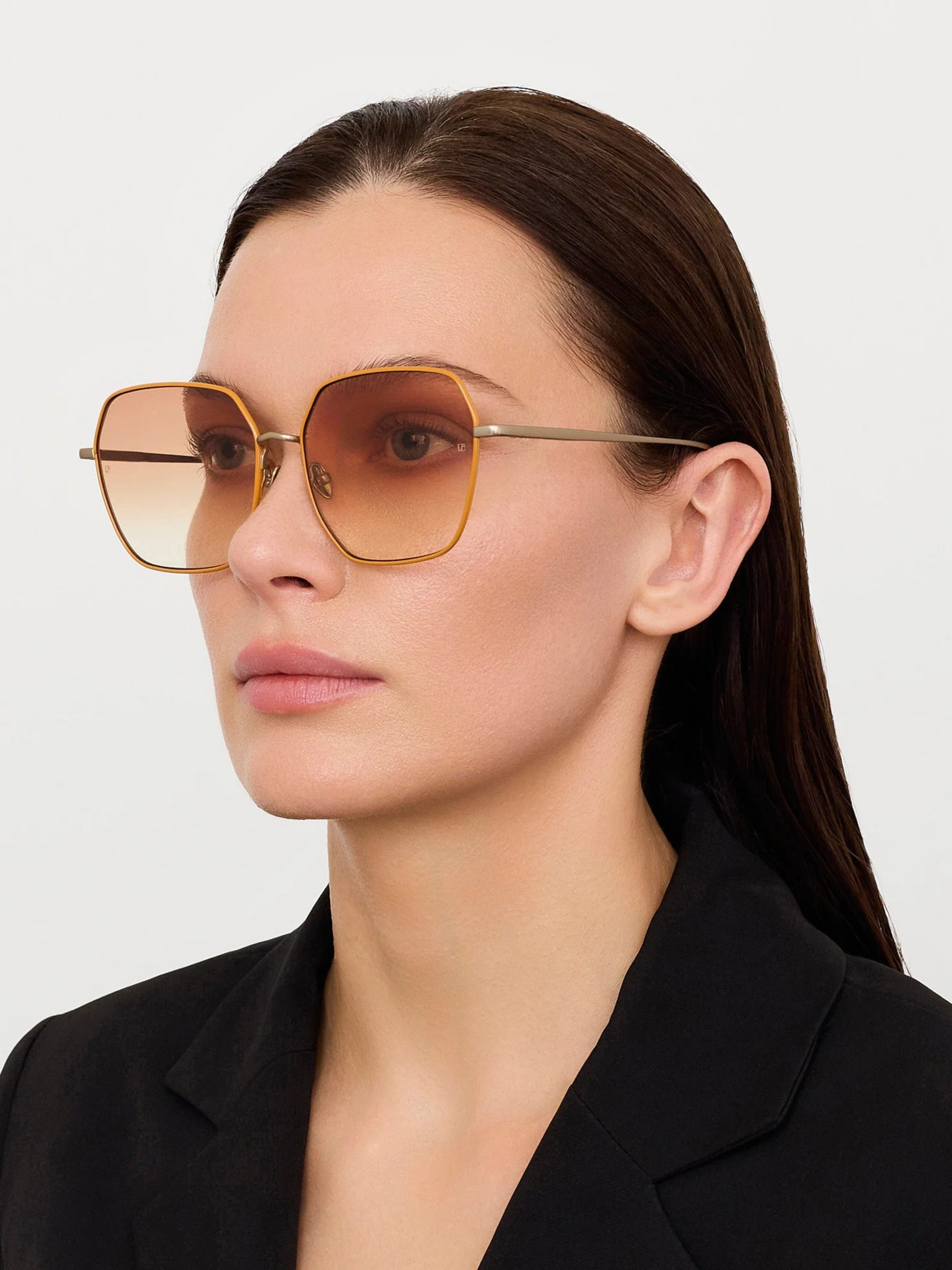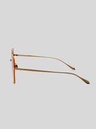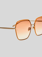 Introducing the DARCIE frame. These sunglasses feature an oversized silhouette crafted from ultra-lightweight Japanese titanium plated in matt champagne gold. The camel rim add bold contrast to the luminous gold structure. Finished with camel gradient lenses offering full UV protection, the frame features adjustable nose pads for a tailored fit.