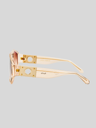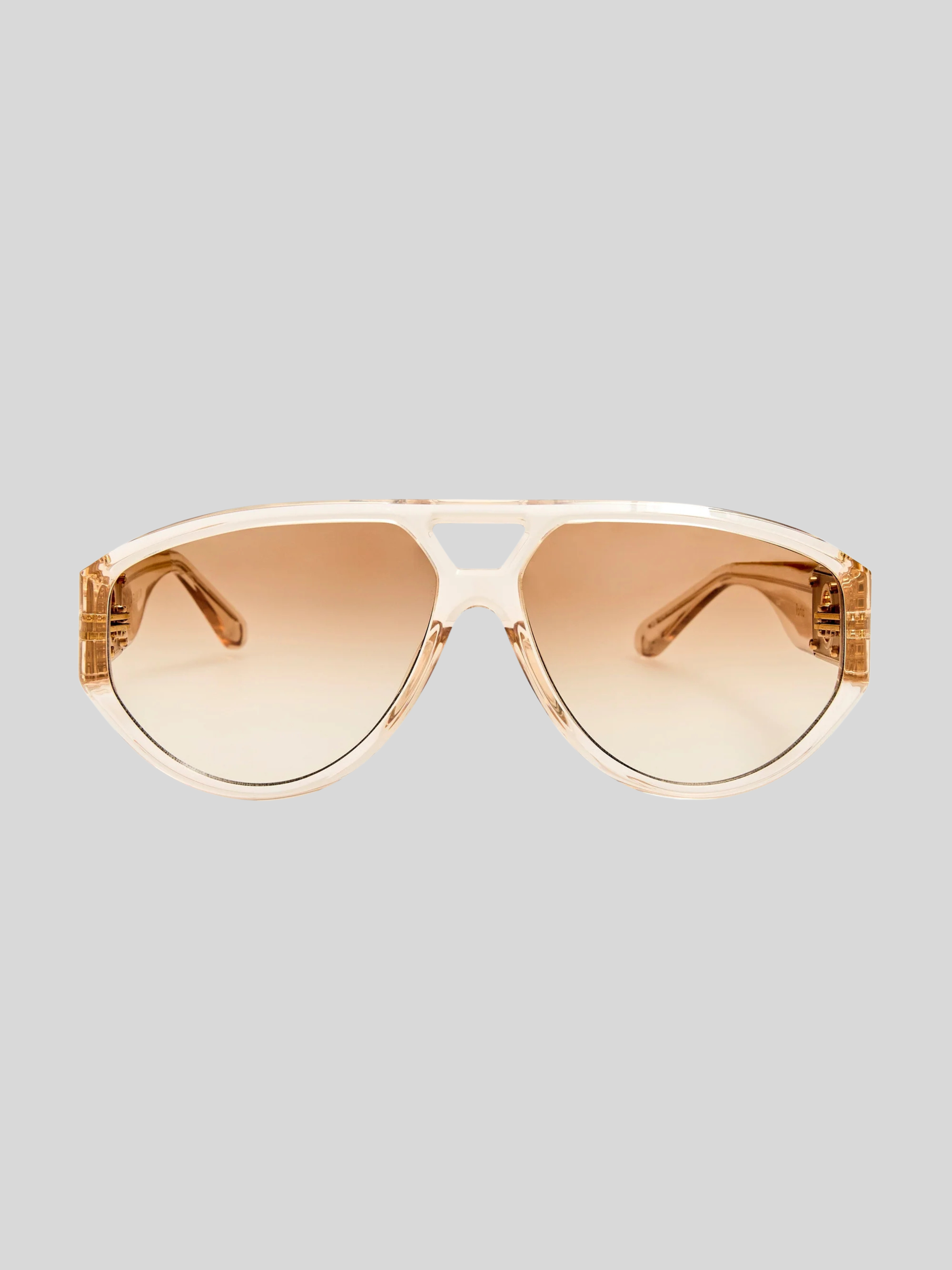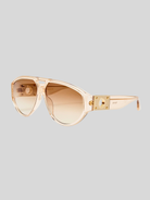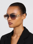 The Portia aviator frame is crafted from Italian acetate in ash. The temples are inset with our signature 22k gold plated titanium eyelet bearing the brand logo. Fitted with mocha gradient lenses offering full UV protection and sculpted nose pads for a tailored fit.
