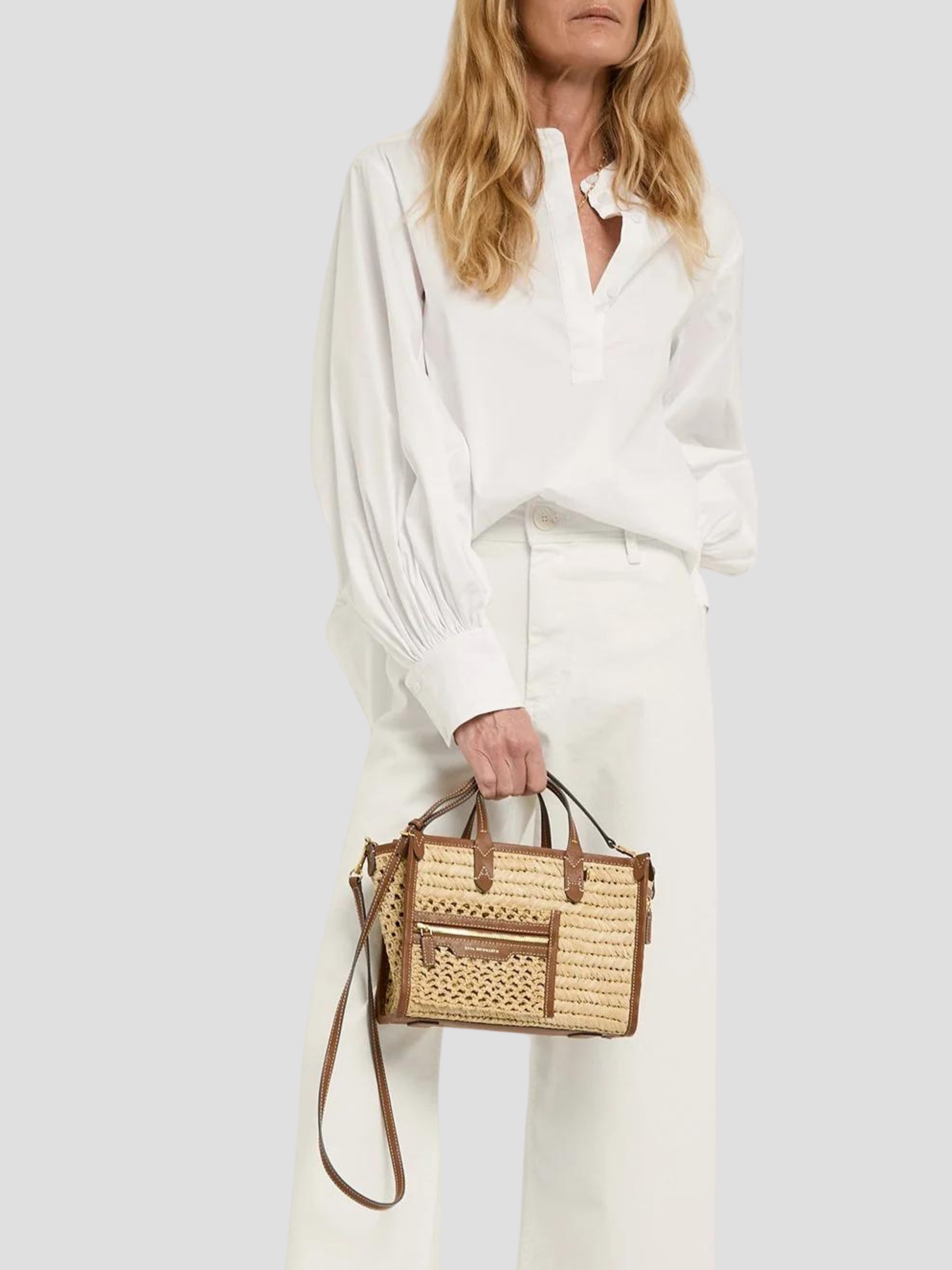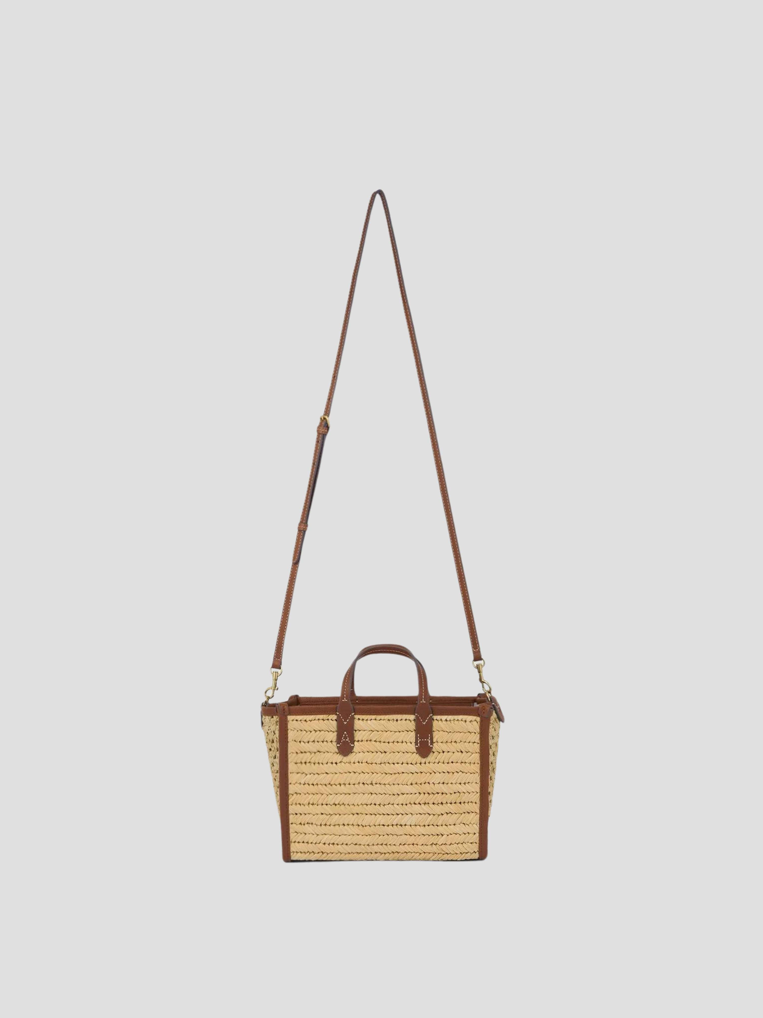 External features: Two zipped pockets with gold toned hardware, gold toned D ring, detachable cross-body strap, top handle, zip closure