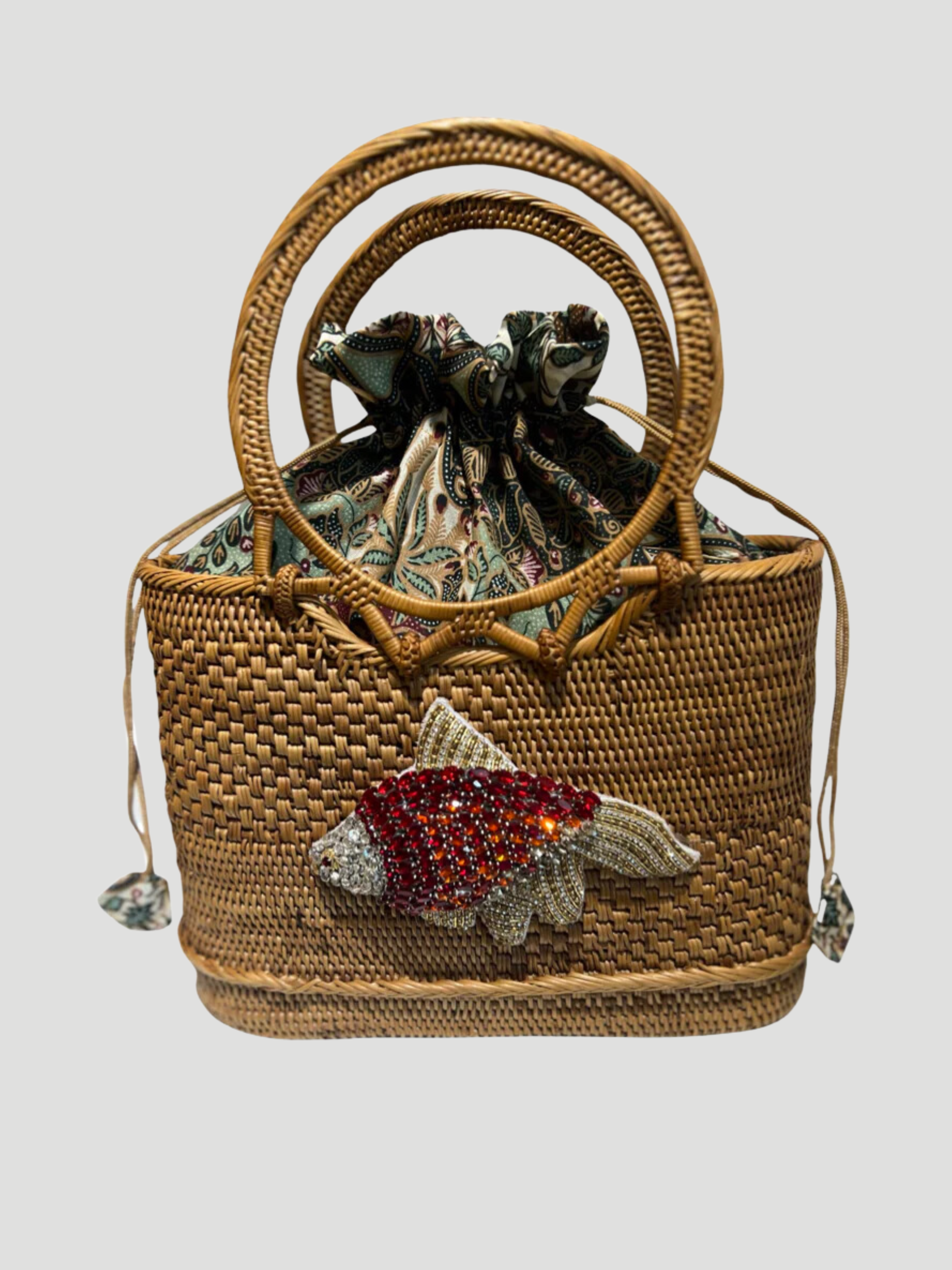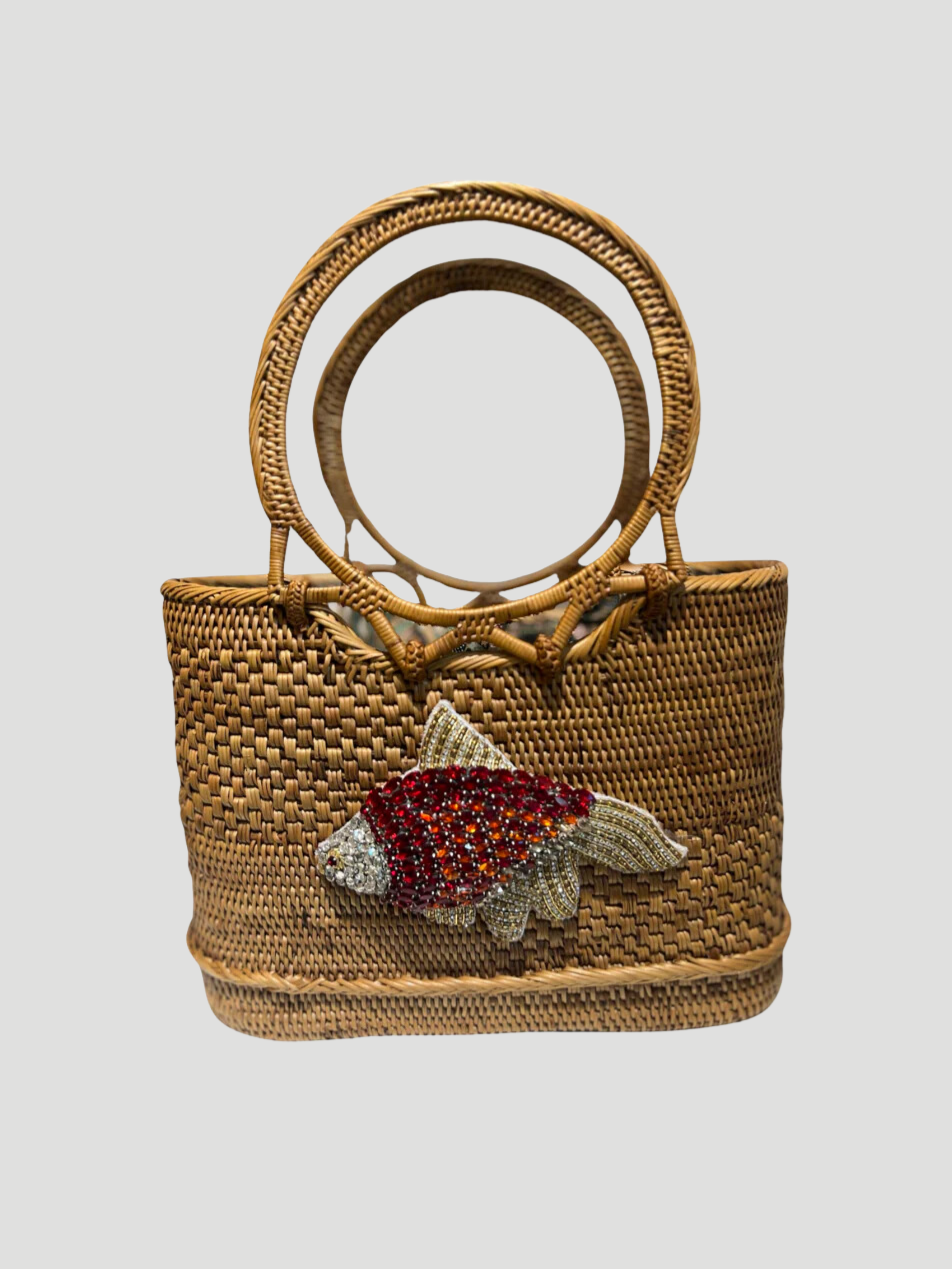 This Raffia Tote with Embroidered Fish is handwoven from strong and durable Ata grass by skilled artisans in Indonesia. The unique caramel color and natural scent achieved through the smoking process make it a special and truly one-of-a-kind item. From Pimenta.