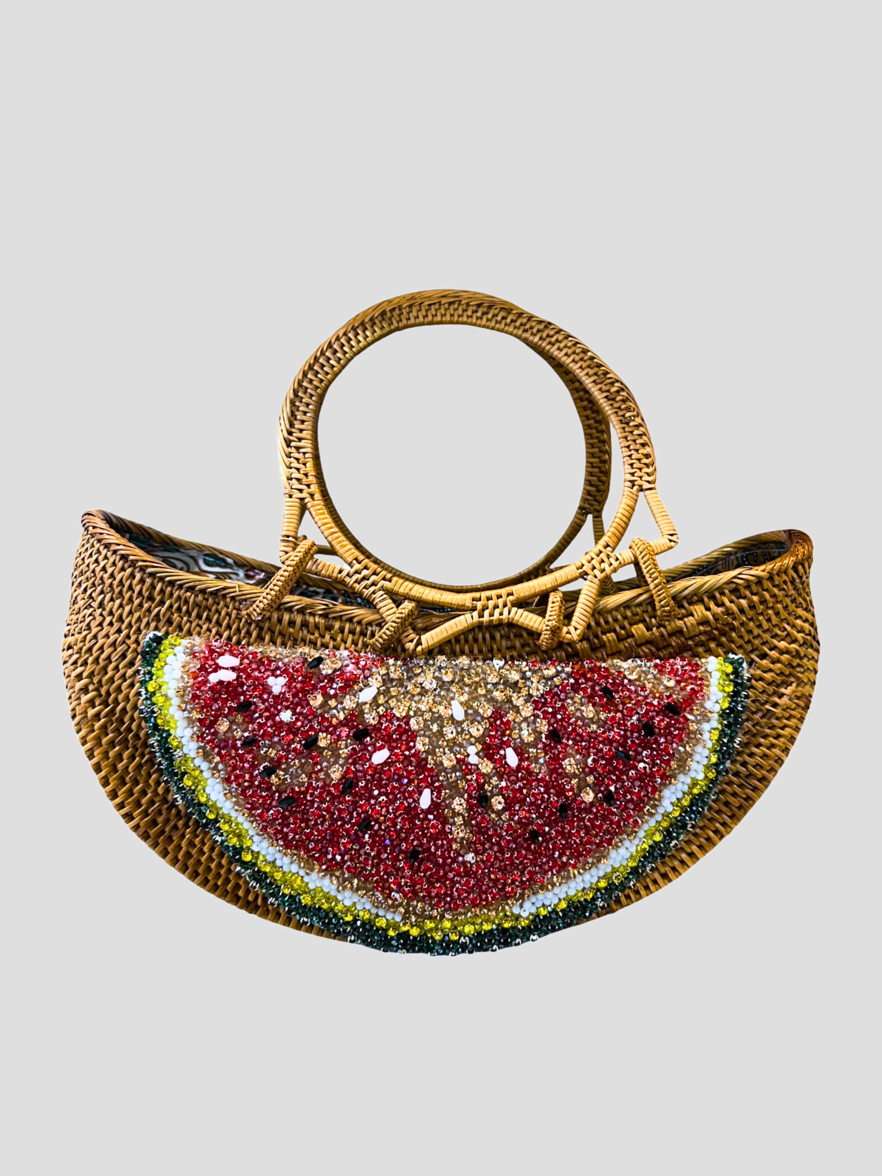 Expertly handwoven from native Ata grass, also known as "ketak", this Raffia Tote from Pimenta features an elegant embroidered Watermelon design. The distinct caramel color is achieved through a 24-48 hour smoking process, and the beaded ornamentation is meticulously crafted by skilled artisans. Your purchase supports fair compensation for talented weavers and artists.