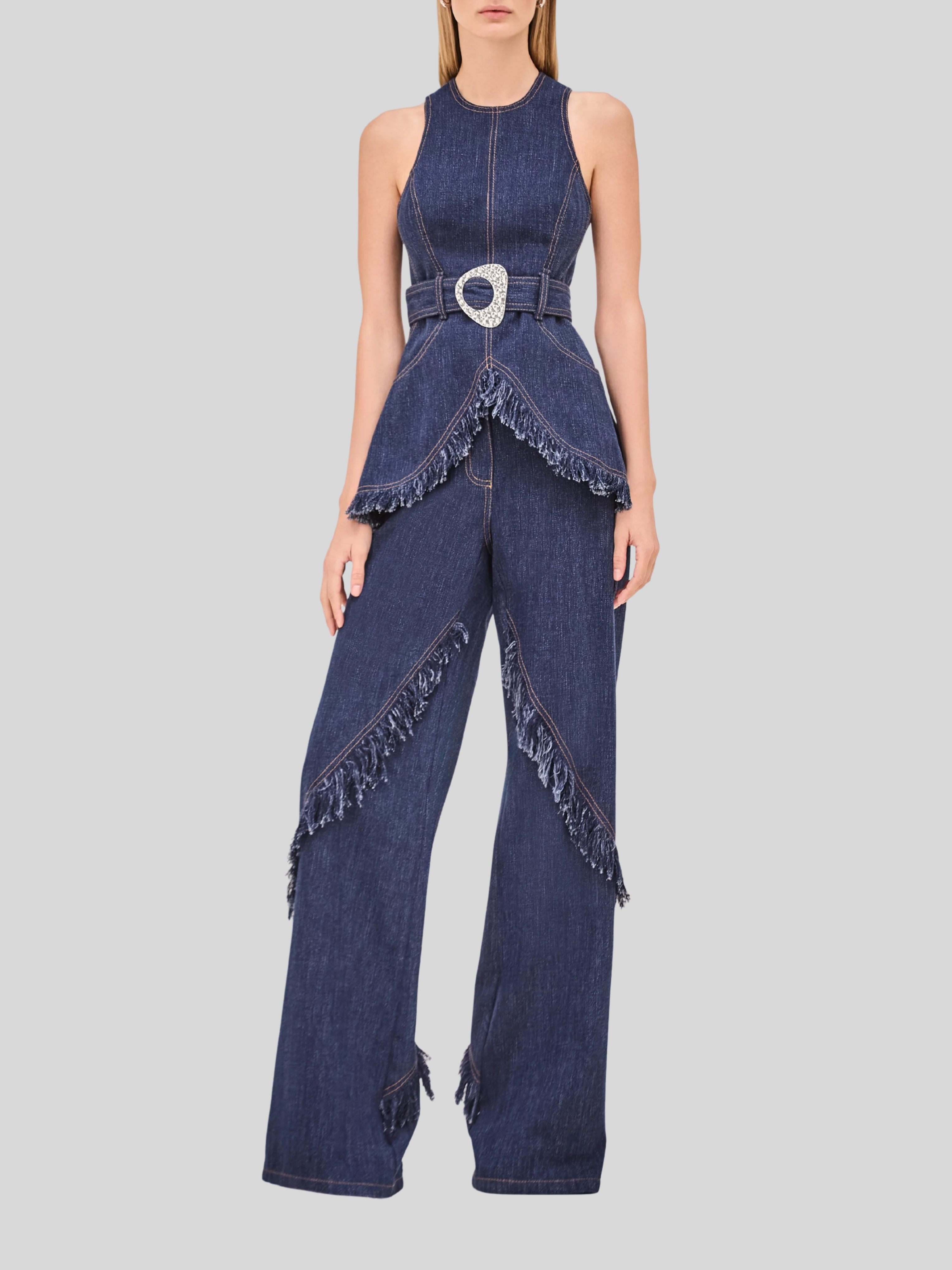 The Braxten Pant is a wide-leg silhouette with fringe detailing, paired with the Reed Top.