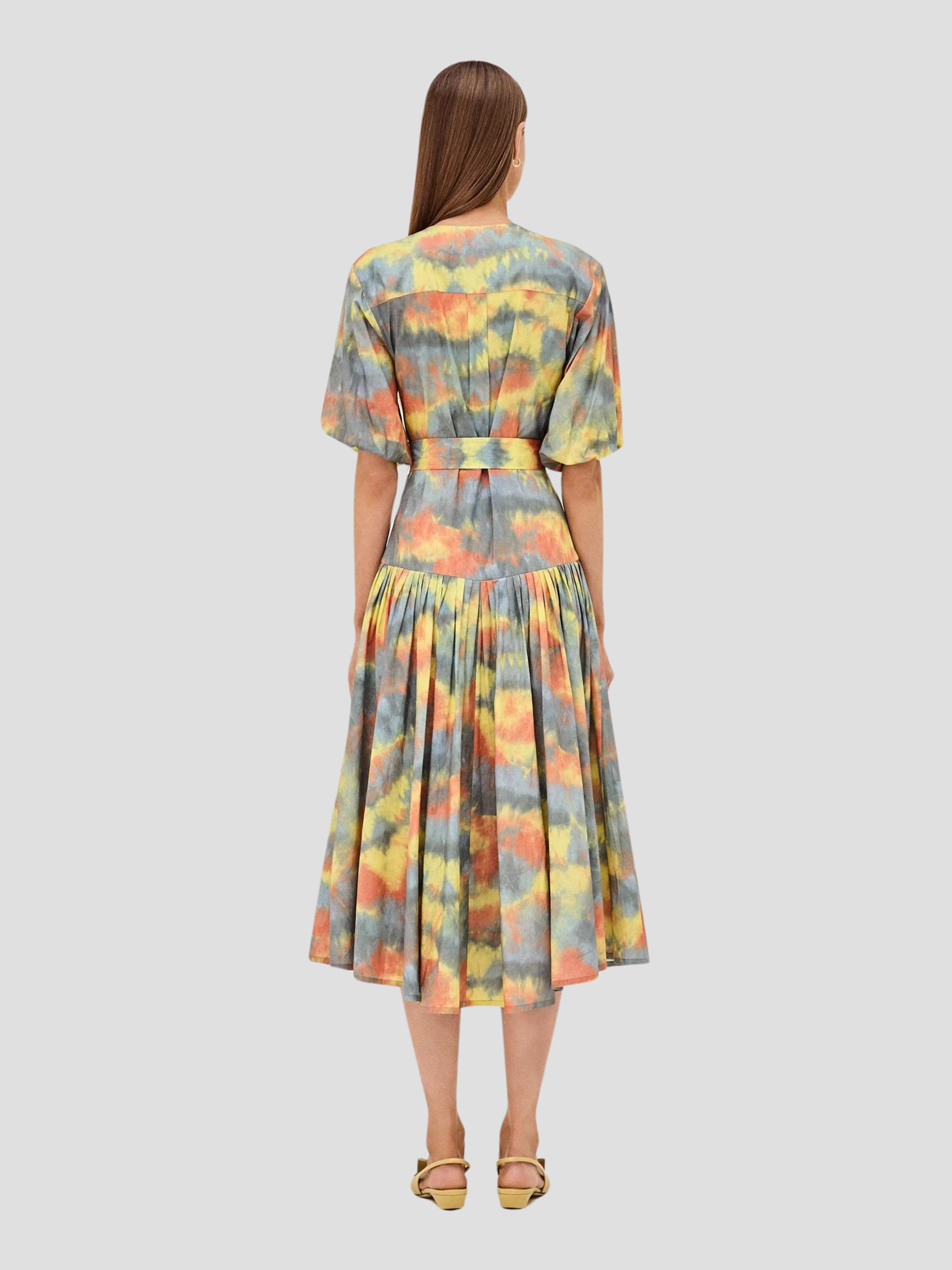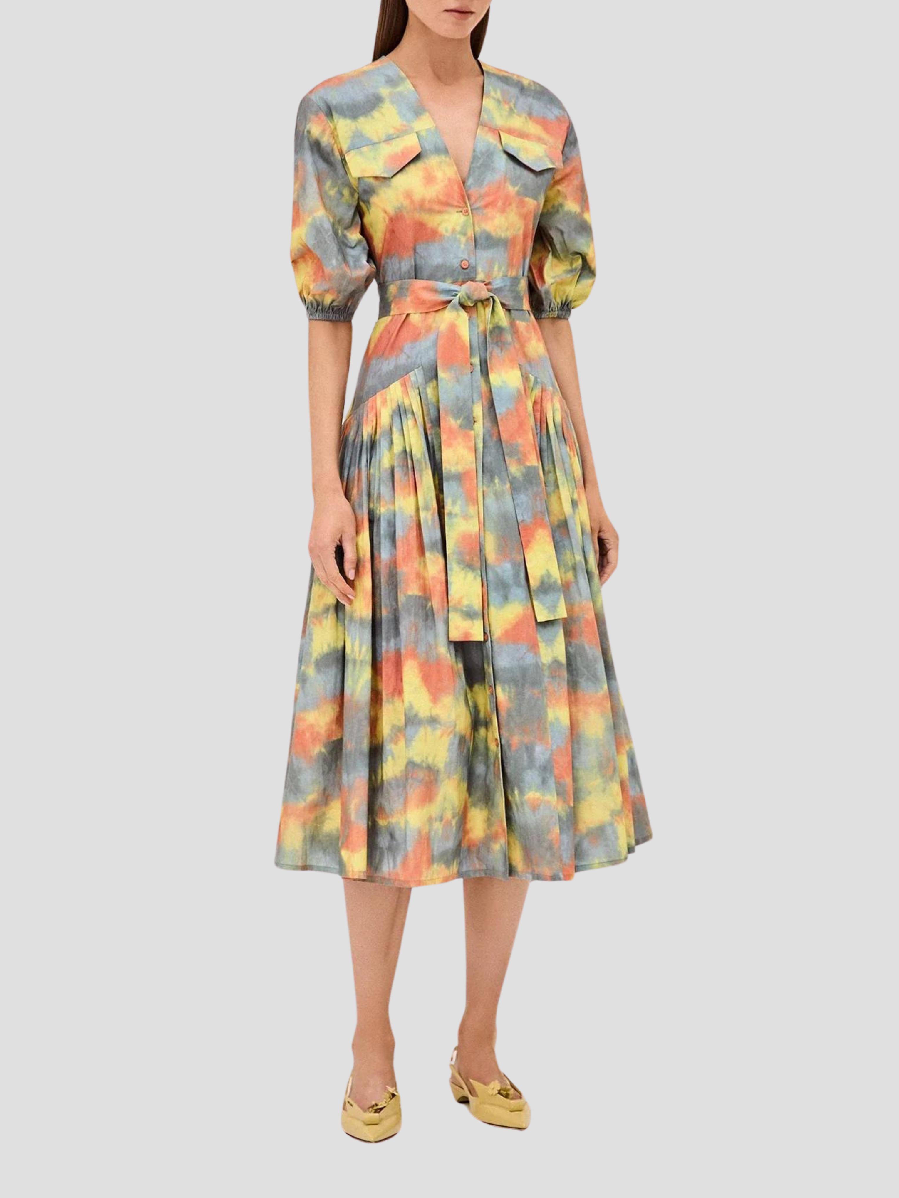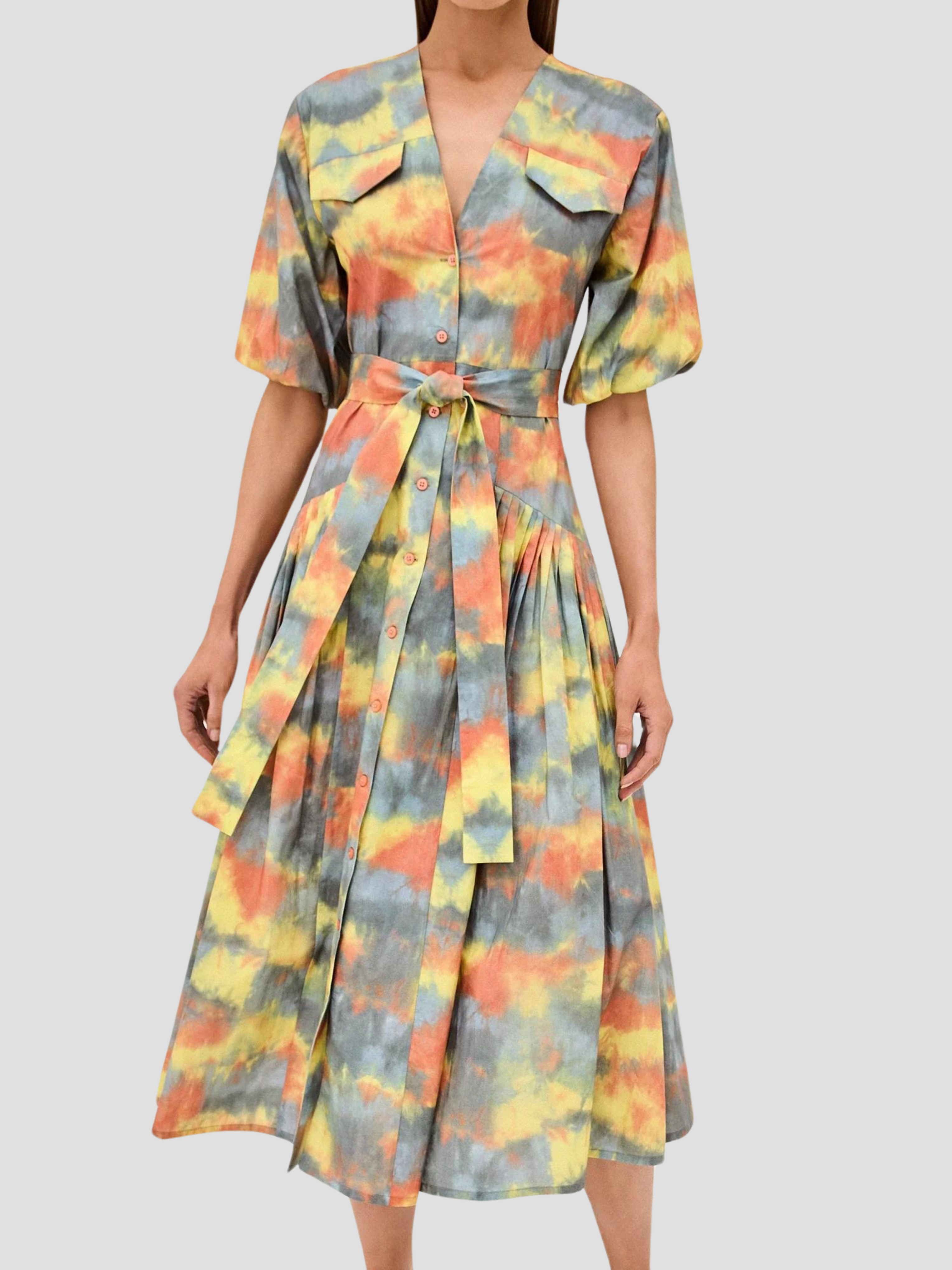The Oasis Dress features a V-neckline and puff sleeves, exuding a timeless charm that’s both elegant and modern. Its tailored bodice effortlessly creates a flattering silhouette, while a waist-defining belt enhances your curves, providing a sophisticated and polished look. Flowing into a graceful A-line skirt, this dress combines structure with fluidity, making it perfect for both casual outings and upscale events.