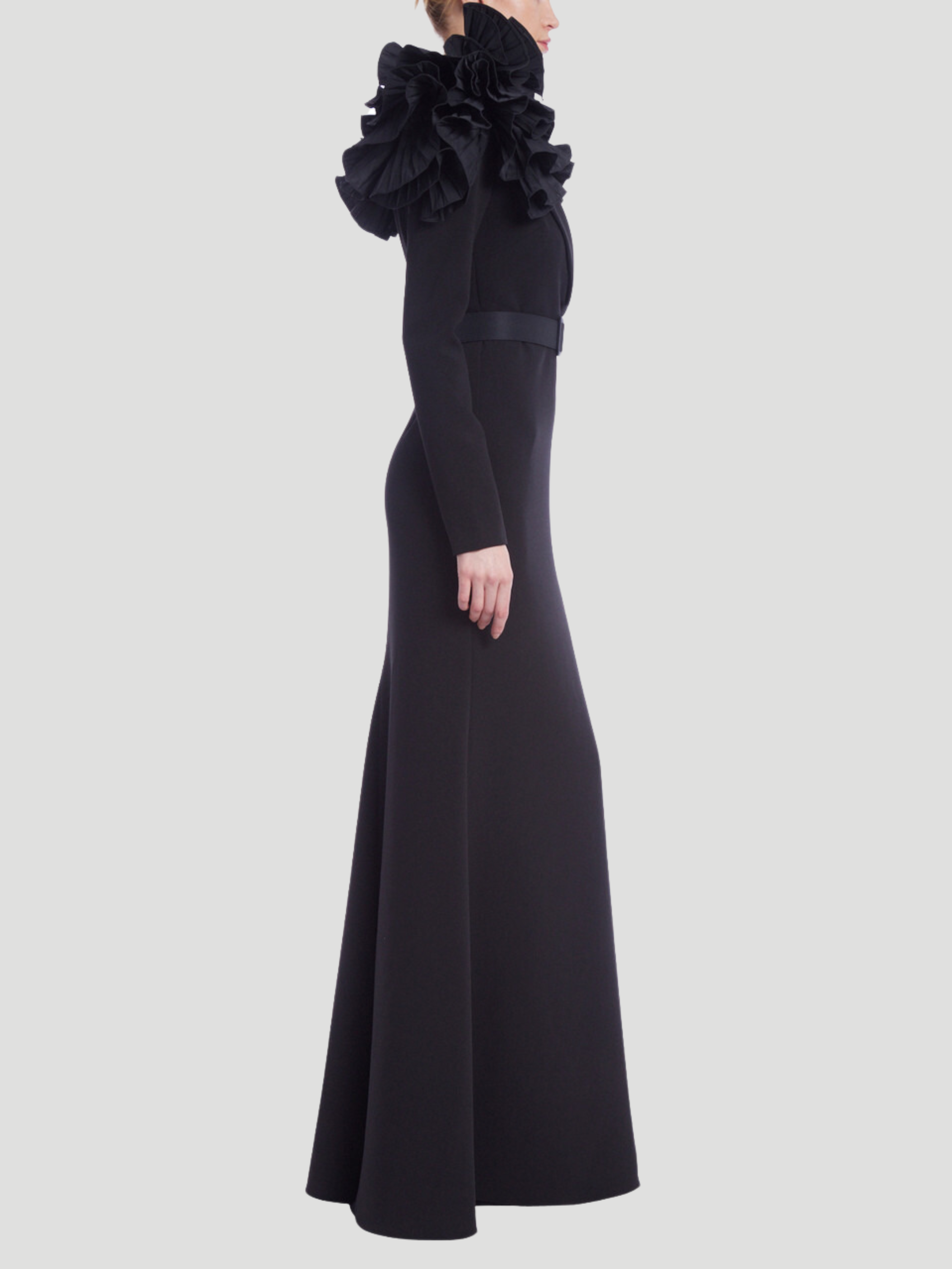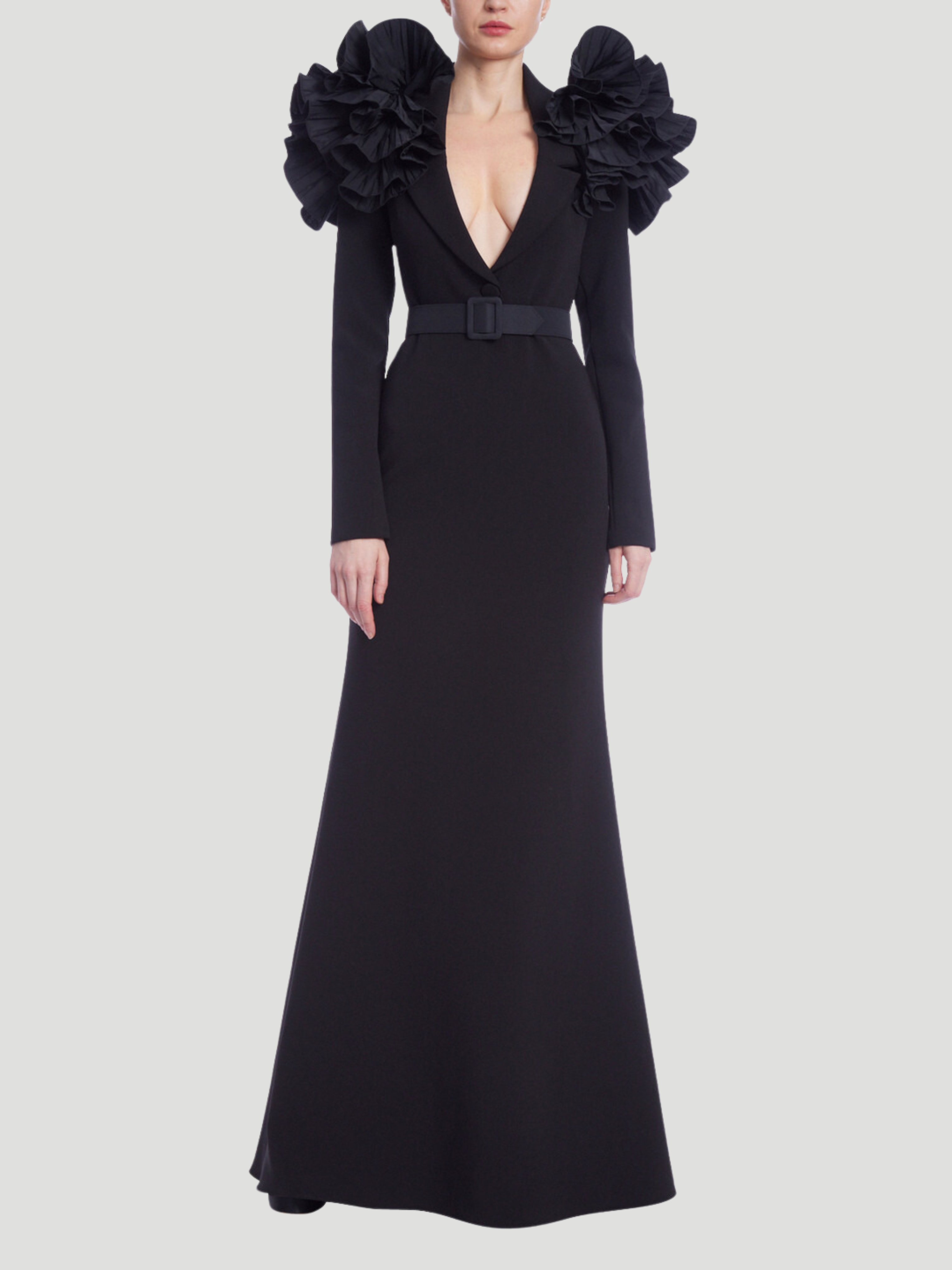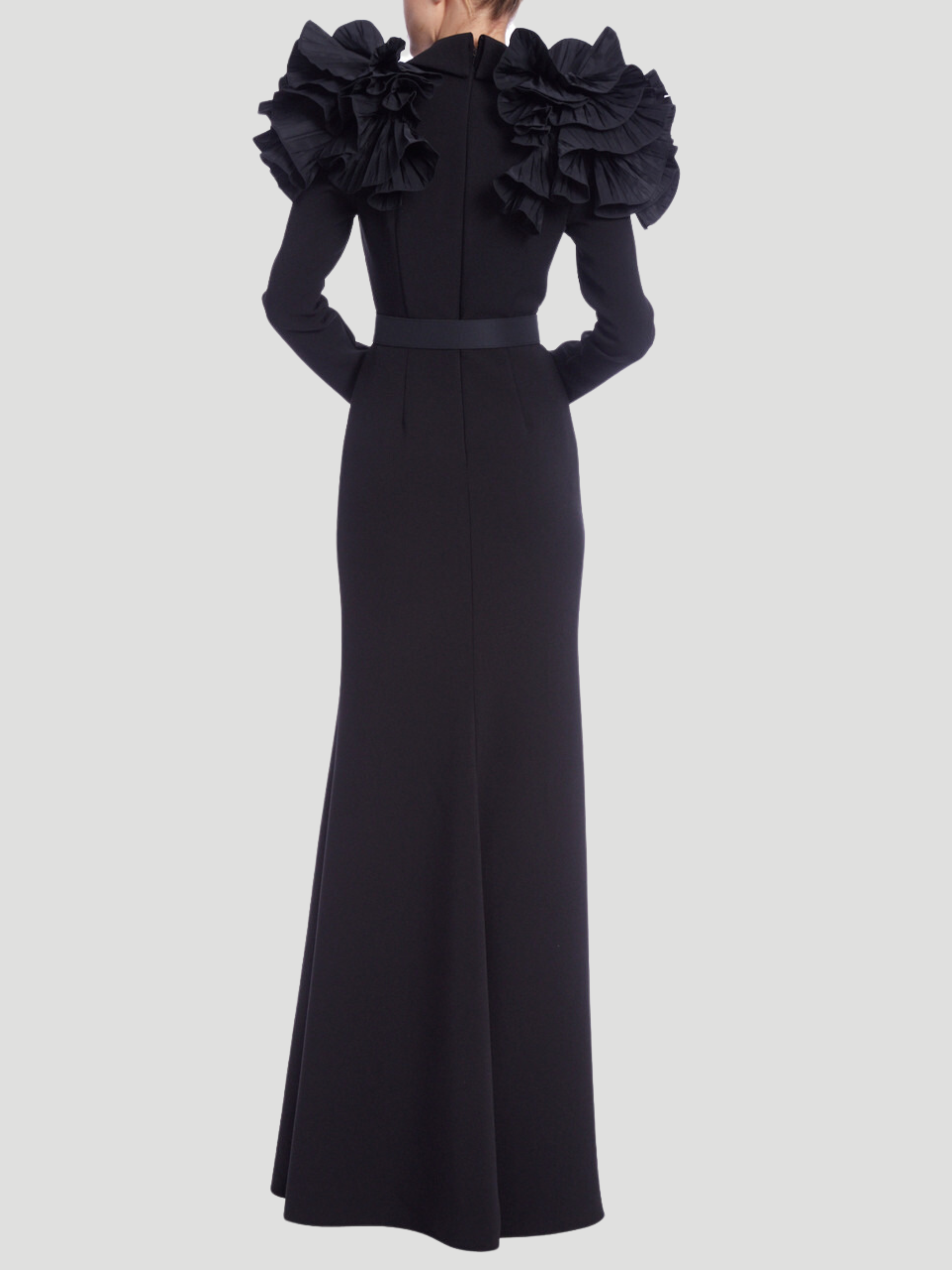 Turn heads and steal the scene in the Long Sleeve Ruffle Shoulder Gown from Badgley Mischka. This stunning gown boasts a smooth, stretch-crepe finish that hugs your curves, while the dramatic taffeta ruffles on the shoulders add volume and avant-garde flair. Complete with a deep V-neckline, long sleeves, and a matching belt for a sleek silhouette.
