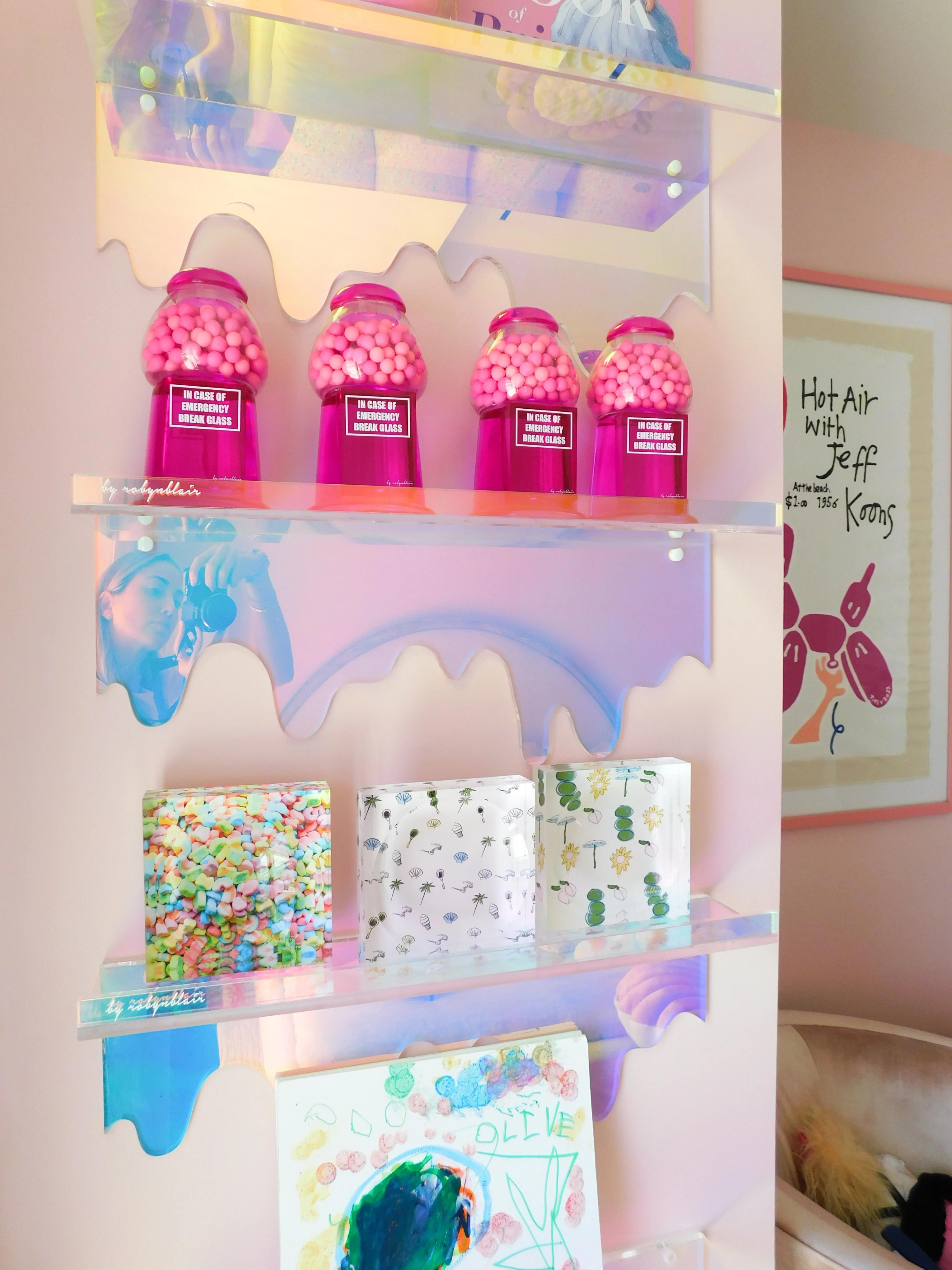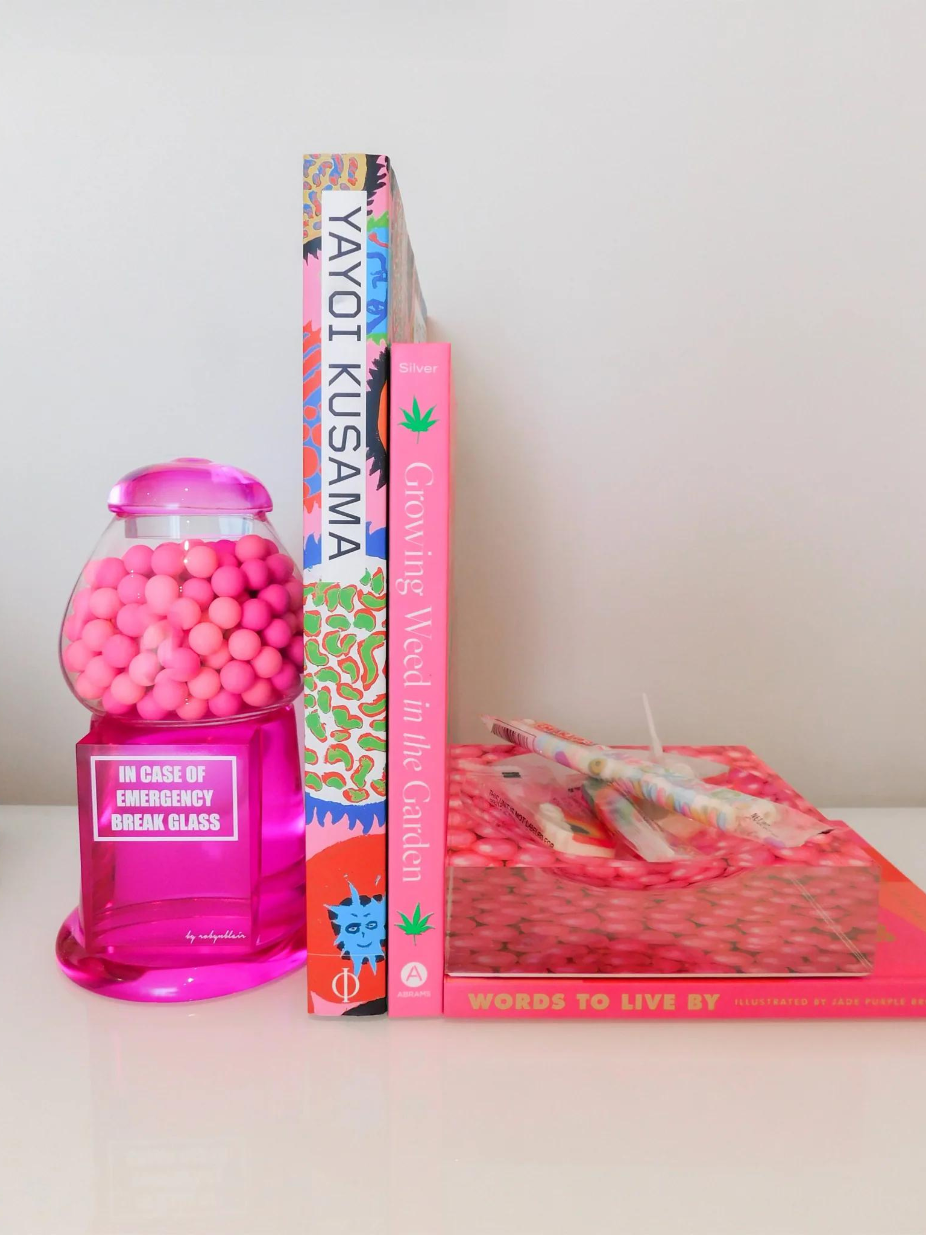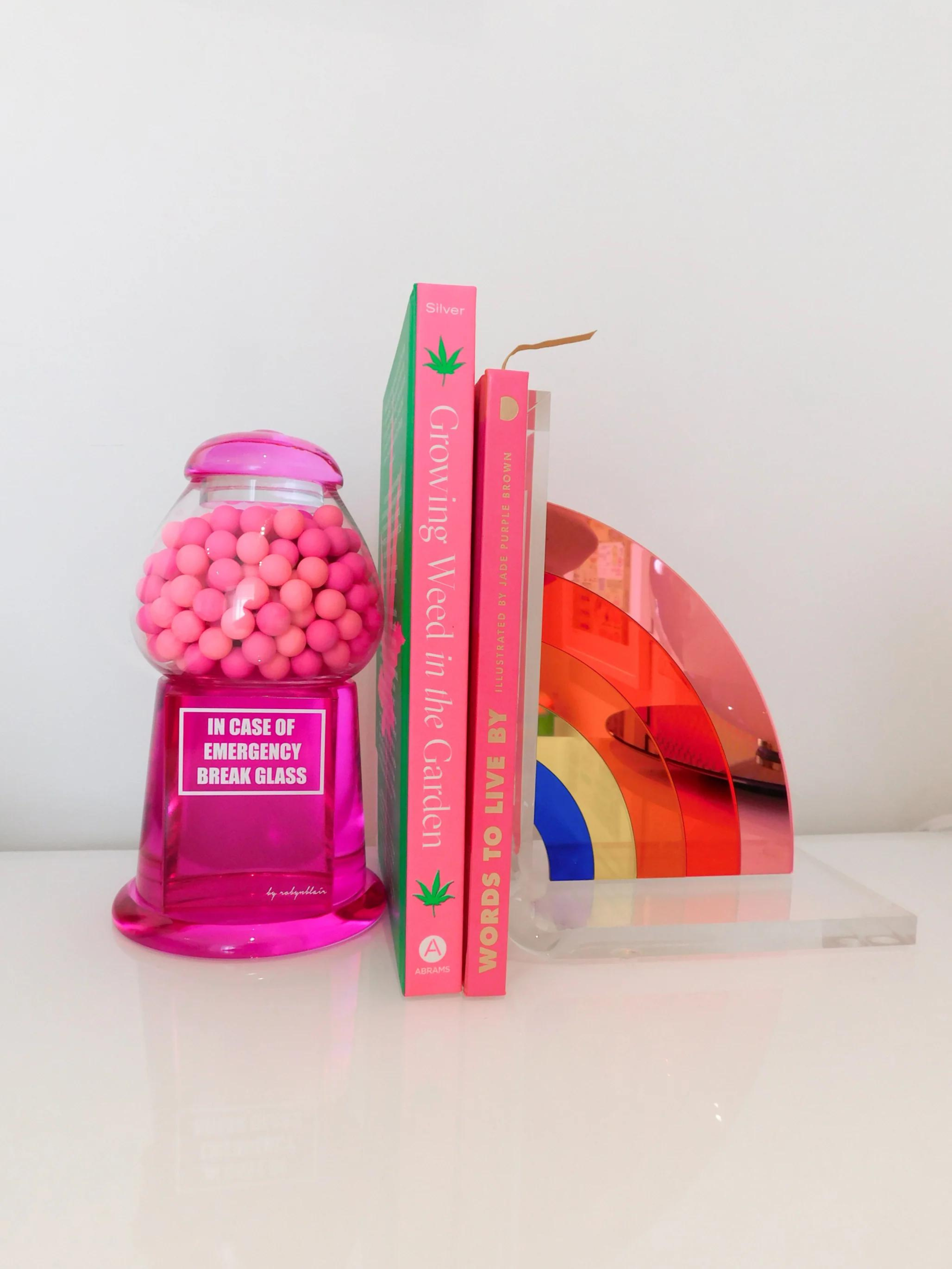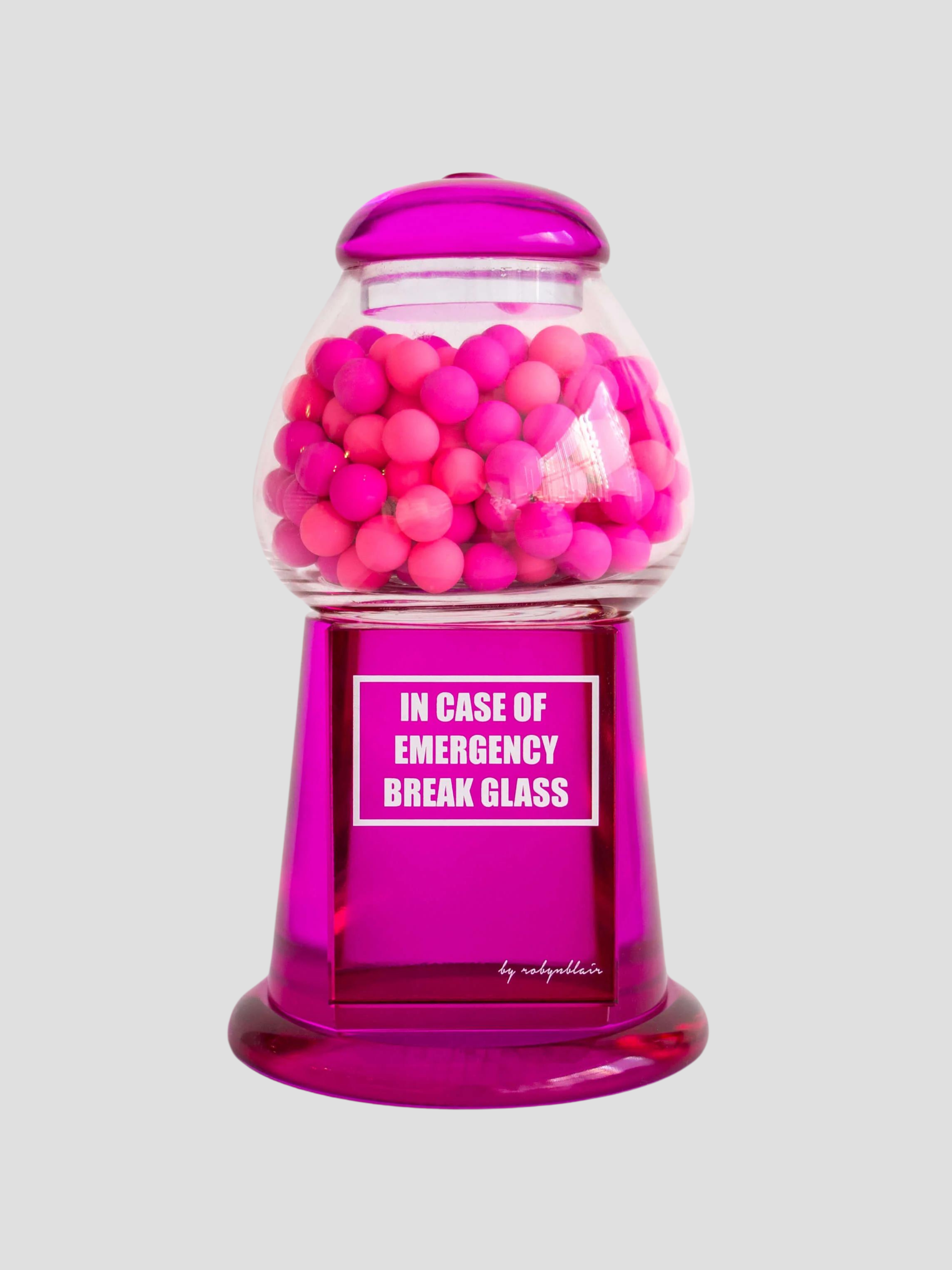 This sleek crystal and glass sculpture evokes the silhouette of a classic gumball machine, filled to the brim with subtly varied monochromatic gumballs. Each vividly colored piece is emblazoned with our signature “In Case of Emergency” typography.