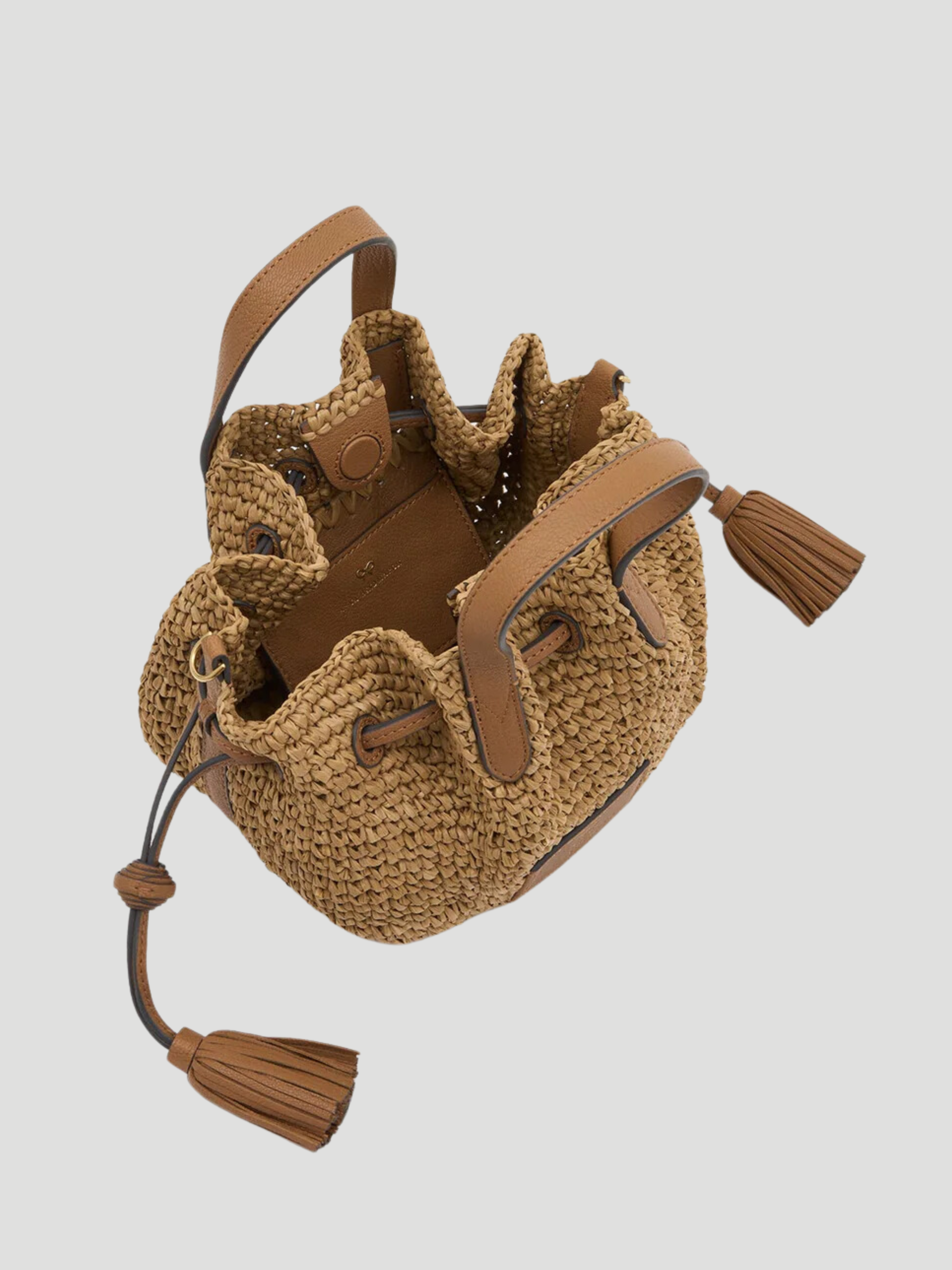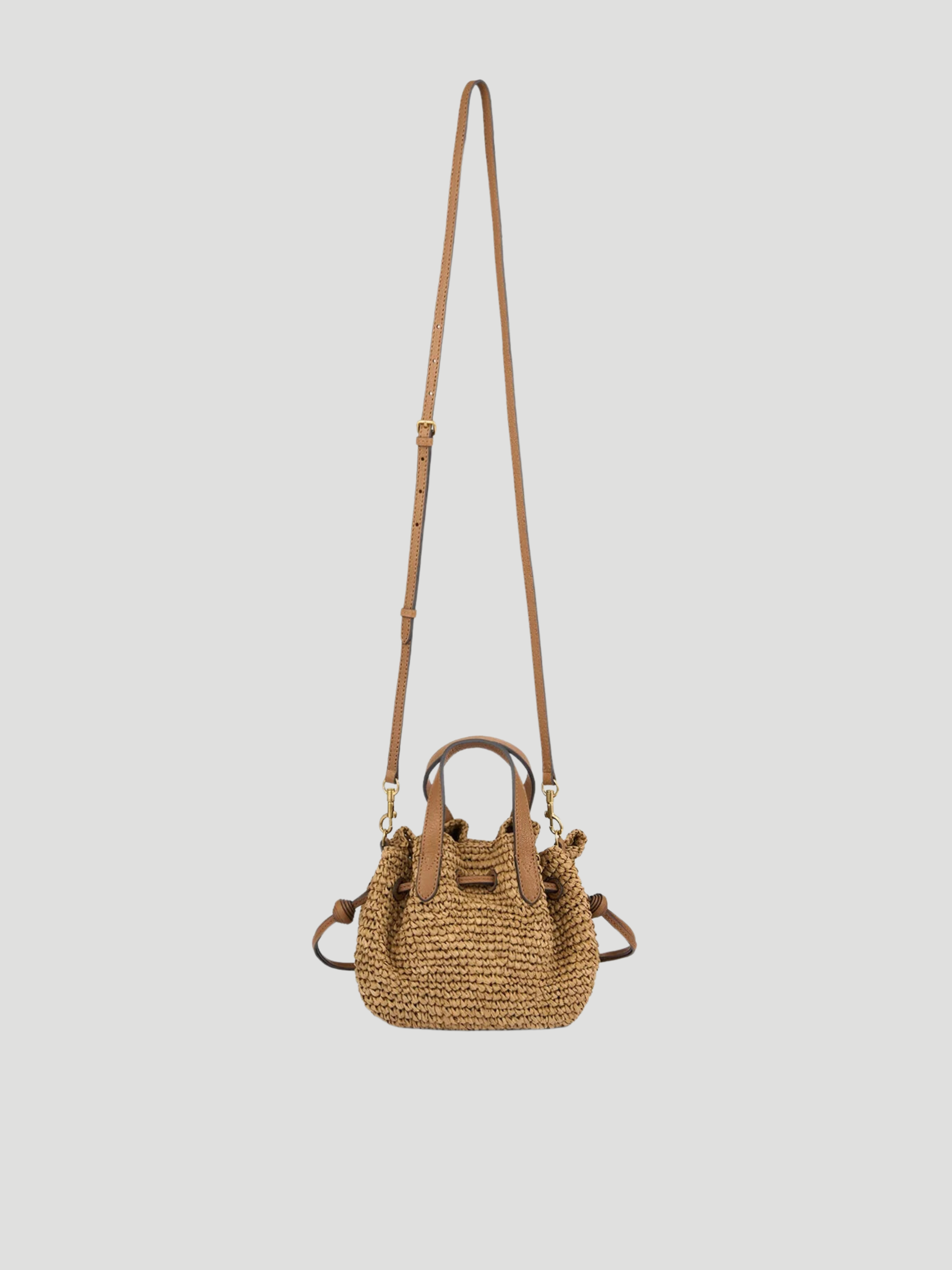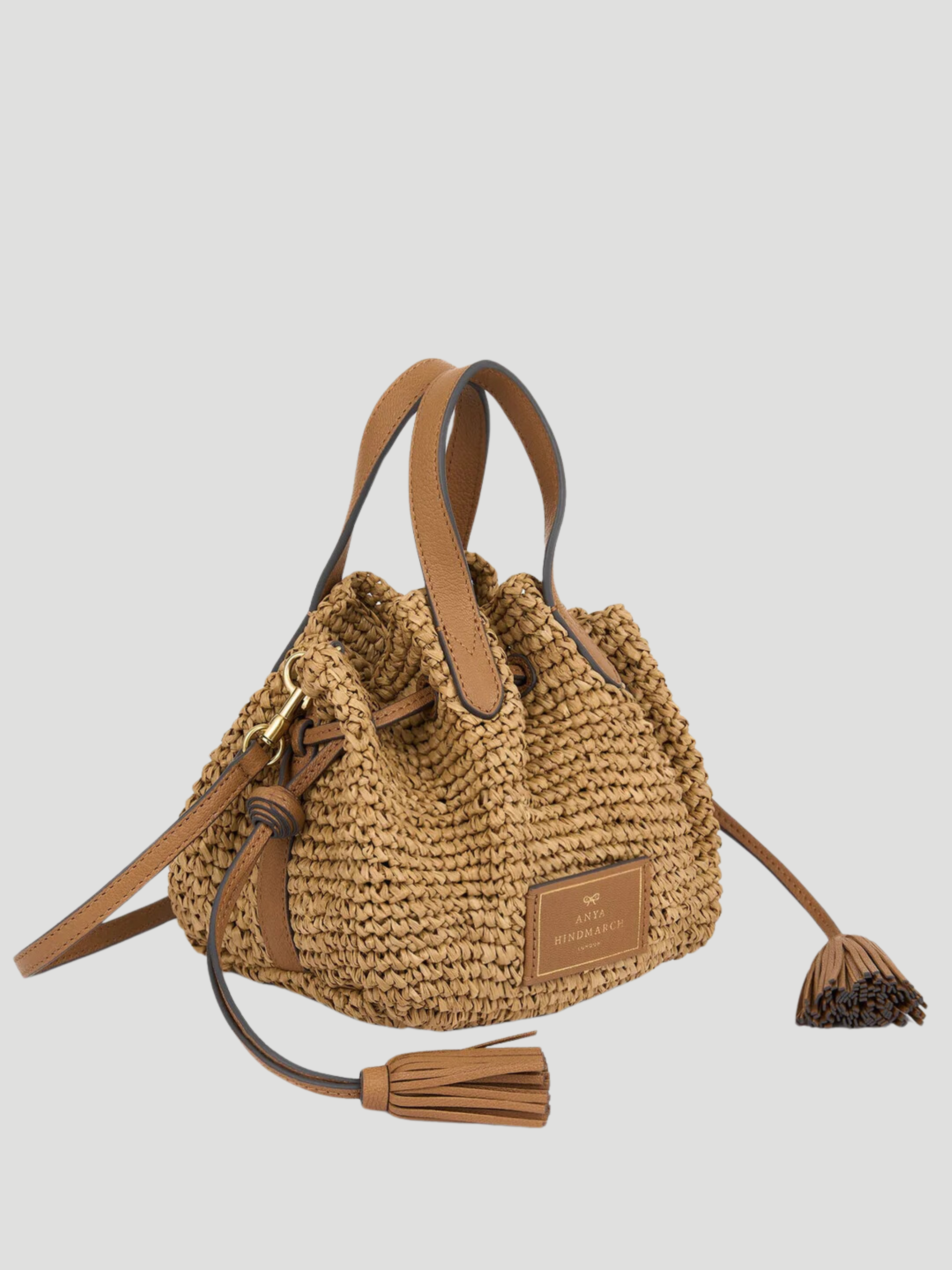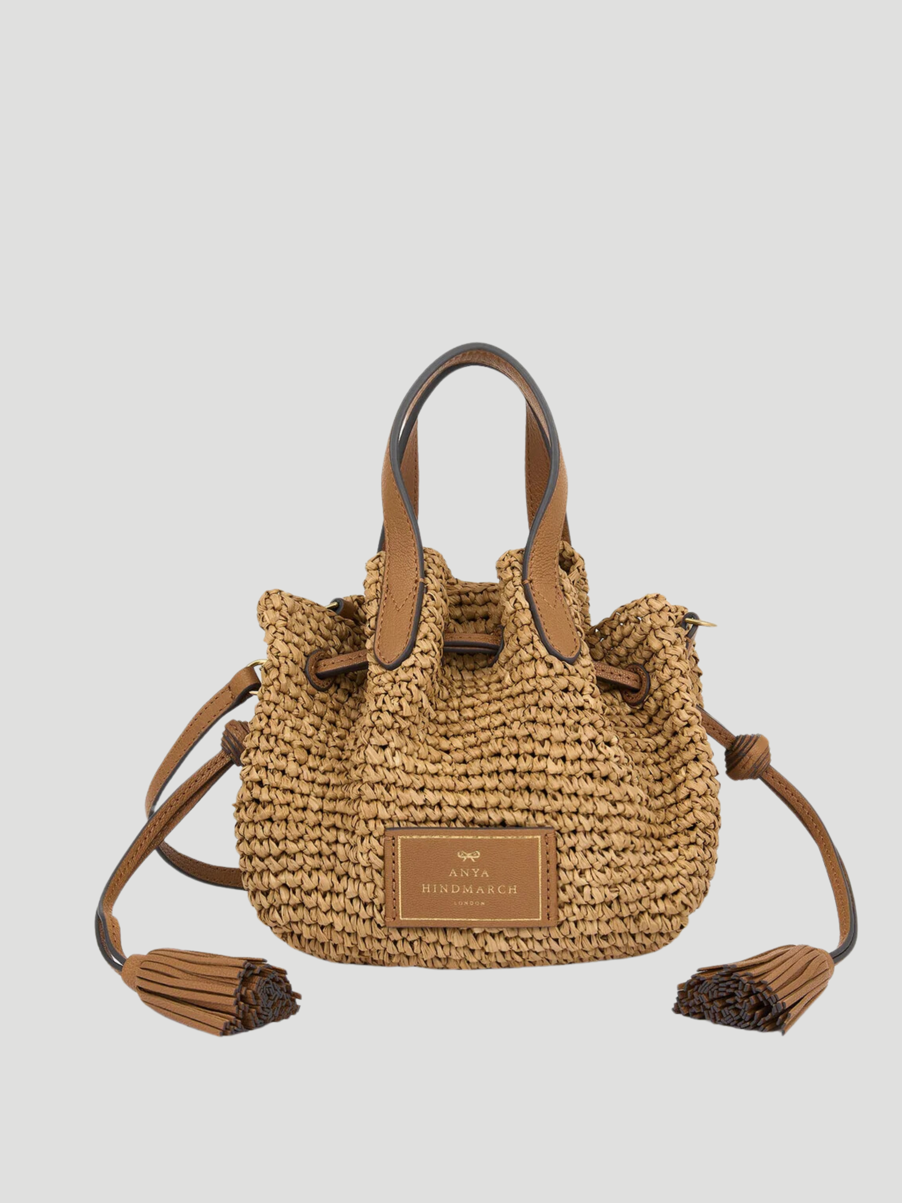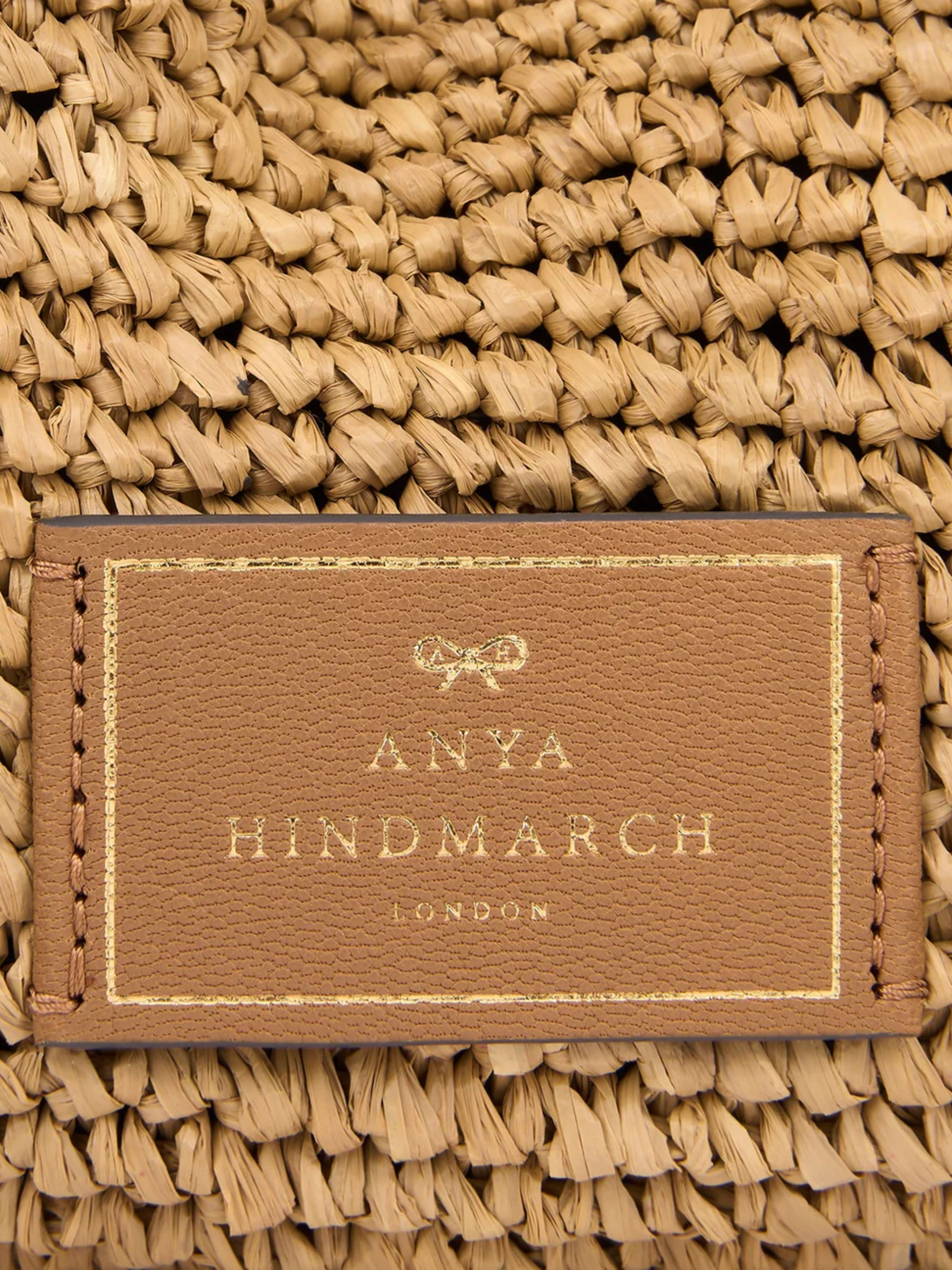 Elevate your summer style with the Anya Hindmarch Raffia Small Drawstring Tote in Pecan. Crafted from natural raffia and adorned with a striking capra logo patch, this compact tote features leather straps, handmade tassels, and a detachable long strap for hands-free convenience. Perfect for chic and functional everyday use.