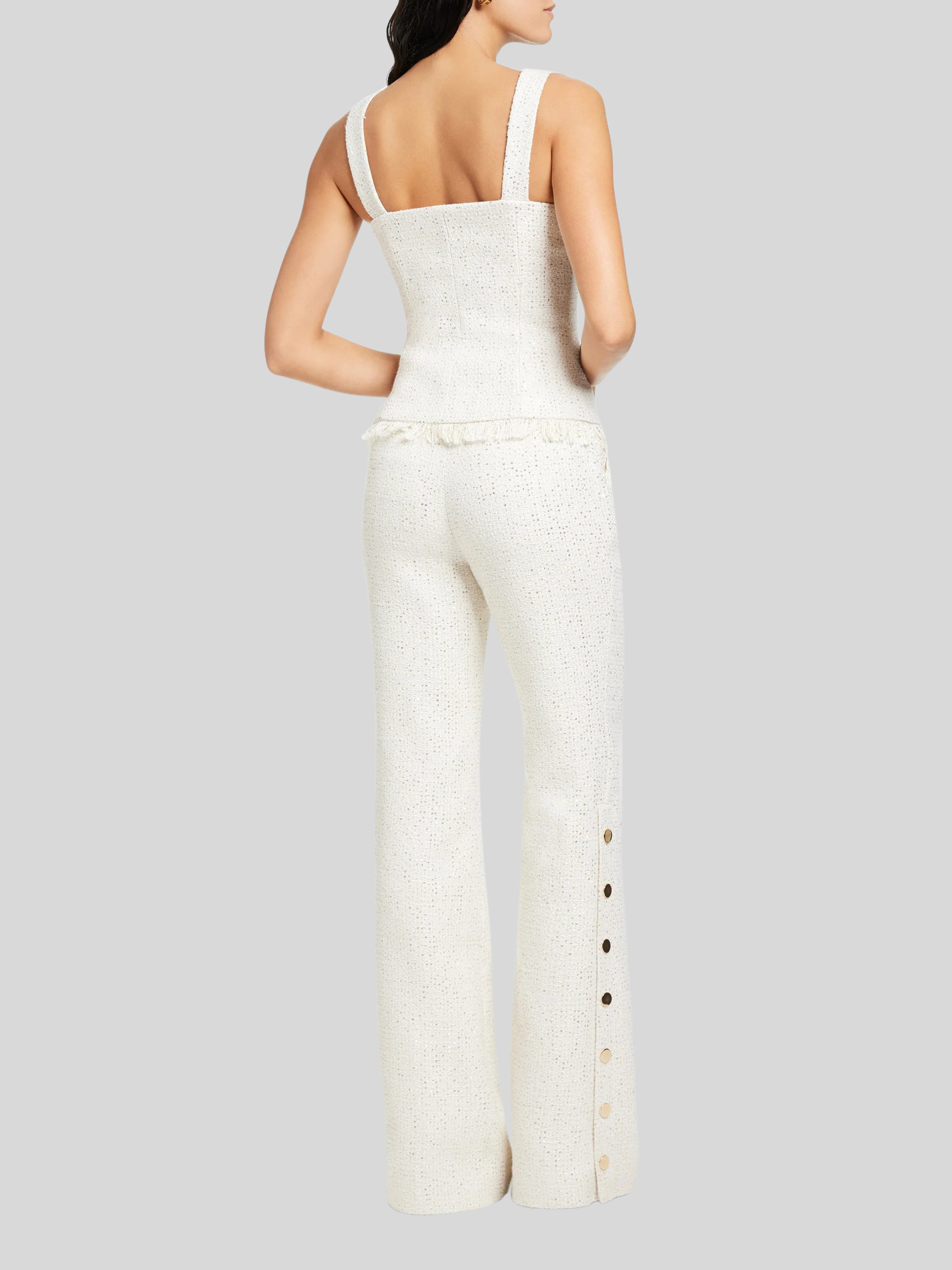 The Beau is a sleeveless, square-neck top with a button-front design and fringe detailing at the hem. Structured yet playful, it balances clean tailoring with subtle texture. Pair it with the matching skirt or high-rise trousers for a polished, coordinated look.