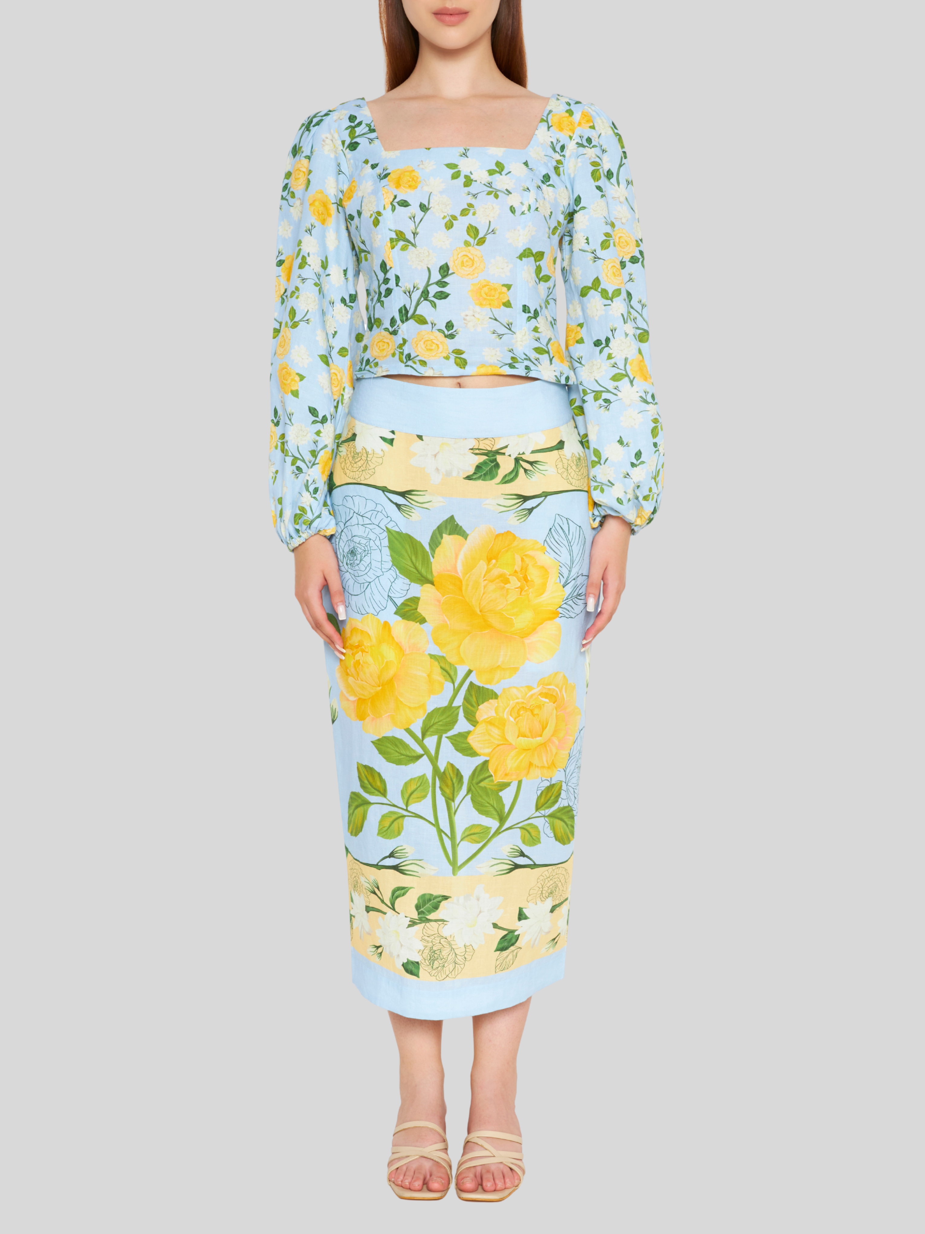 This scarf pencil skirt is a summer-friendly must-have. The bright, sunny florals make it perfect for warm days, and it can be paired effortlessly with a white bikini top, a tank, or the matching square neck crop blouse for a polished look. Versatile and fun, it lets you play with your styling and elevate your outfit however you like.