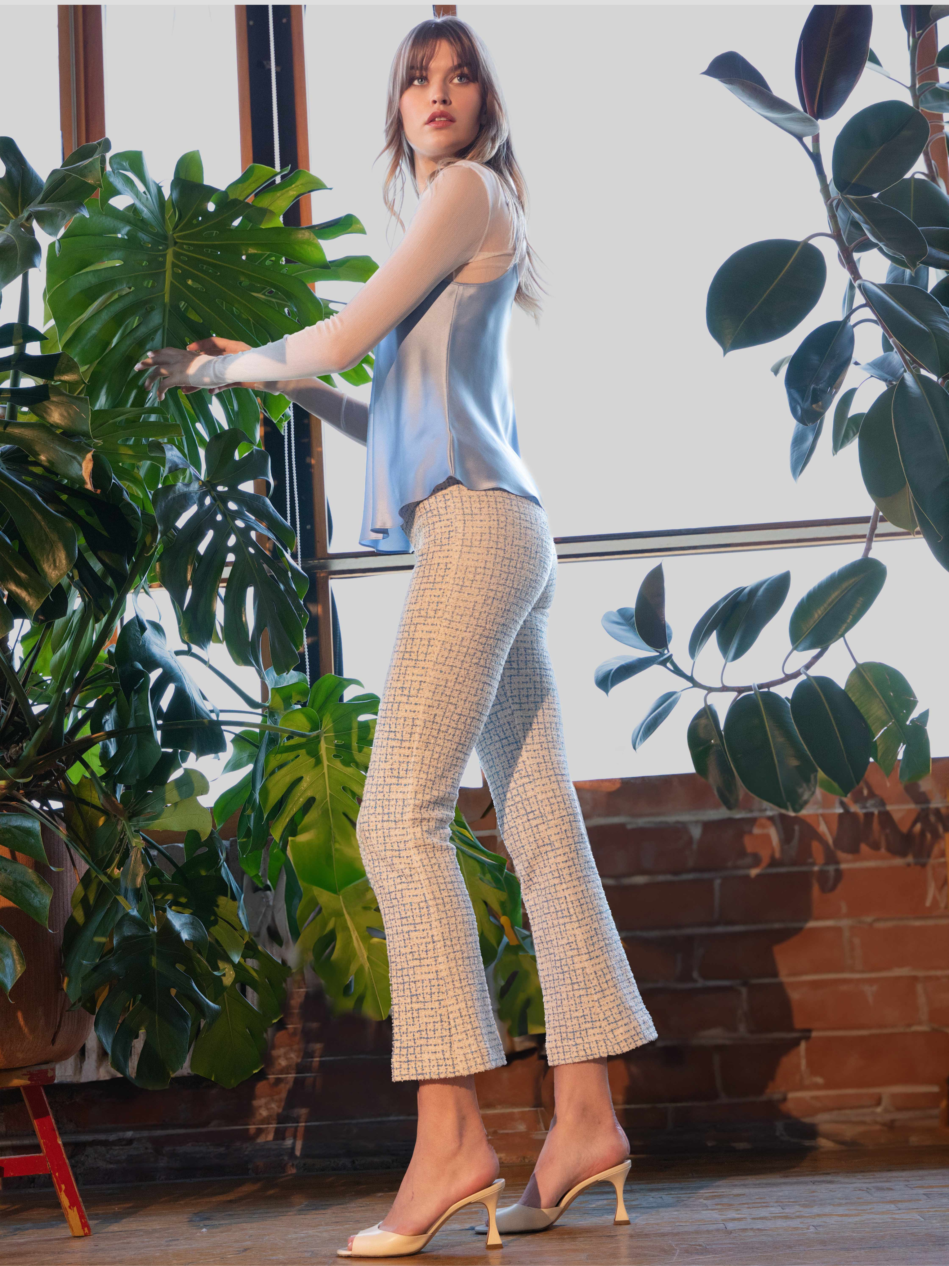 The Leo Crop Flare Pant in Blue and White Boucle is a versatile addition to any wardrobe. Crafted with a flattering crop flare cut and stylish blue and white boucle fabric, these pants offer a sophisticated and fashion-forward look. Made with high-quality materials, they provide comfort and durability. Perfect for any occasion.