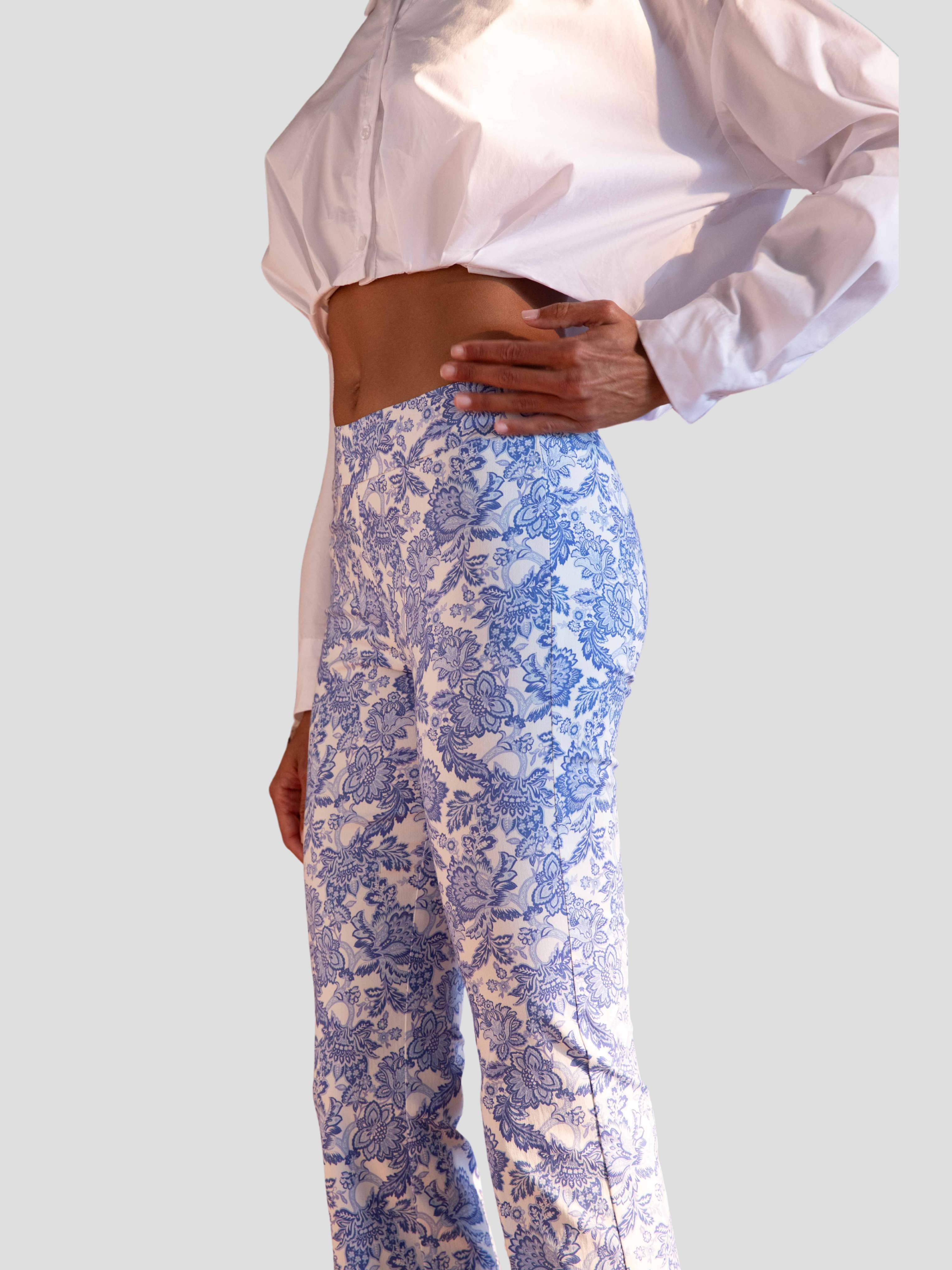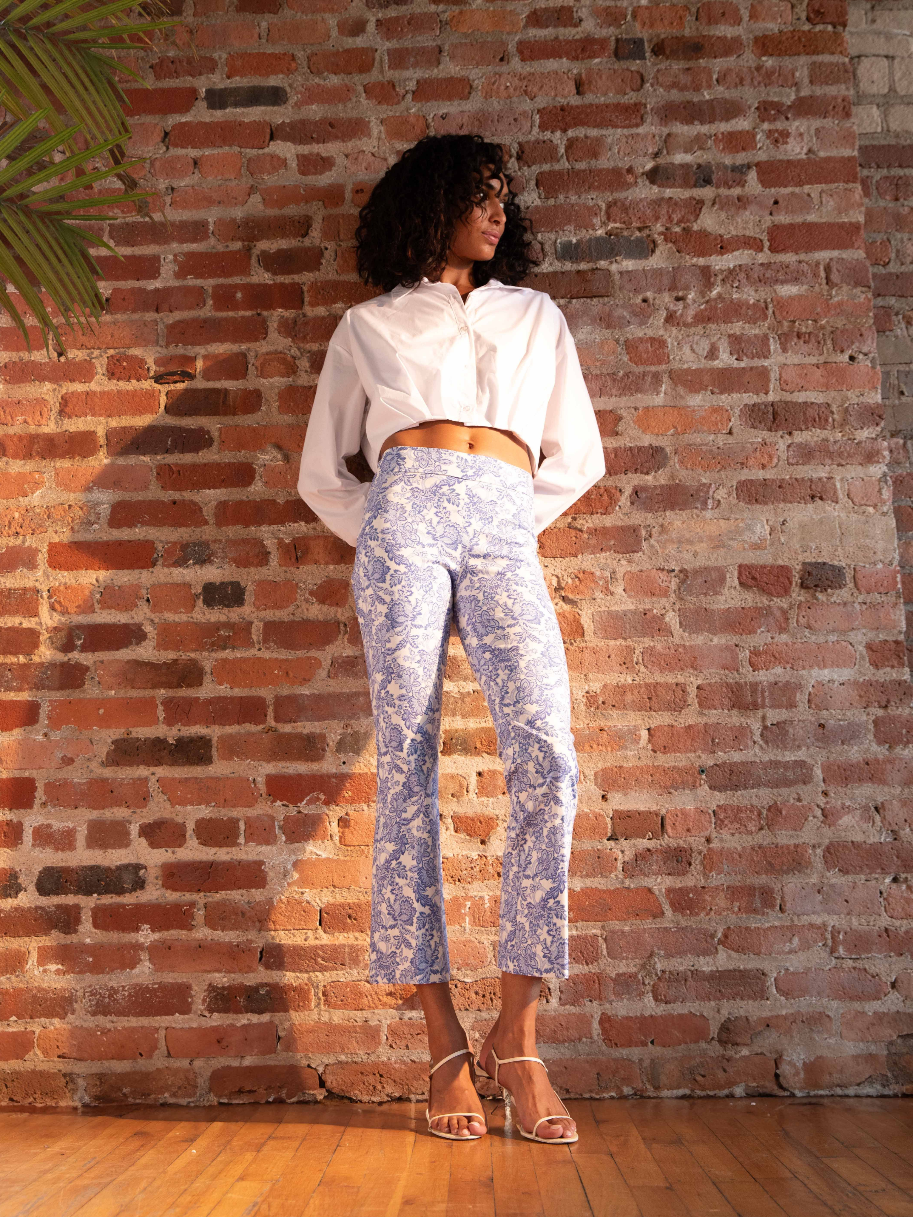 The Leo Crop Paisley Flare Pant in White and Blue delivers a comfortable and stylish fit. Featuring a trendy paisley design, these pants are made with soft, lightweight fabric that allows for ease of movement. Perfect for any occasion, these pants are sure to elevate any outfit.