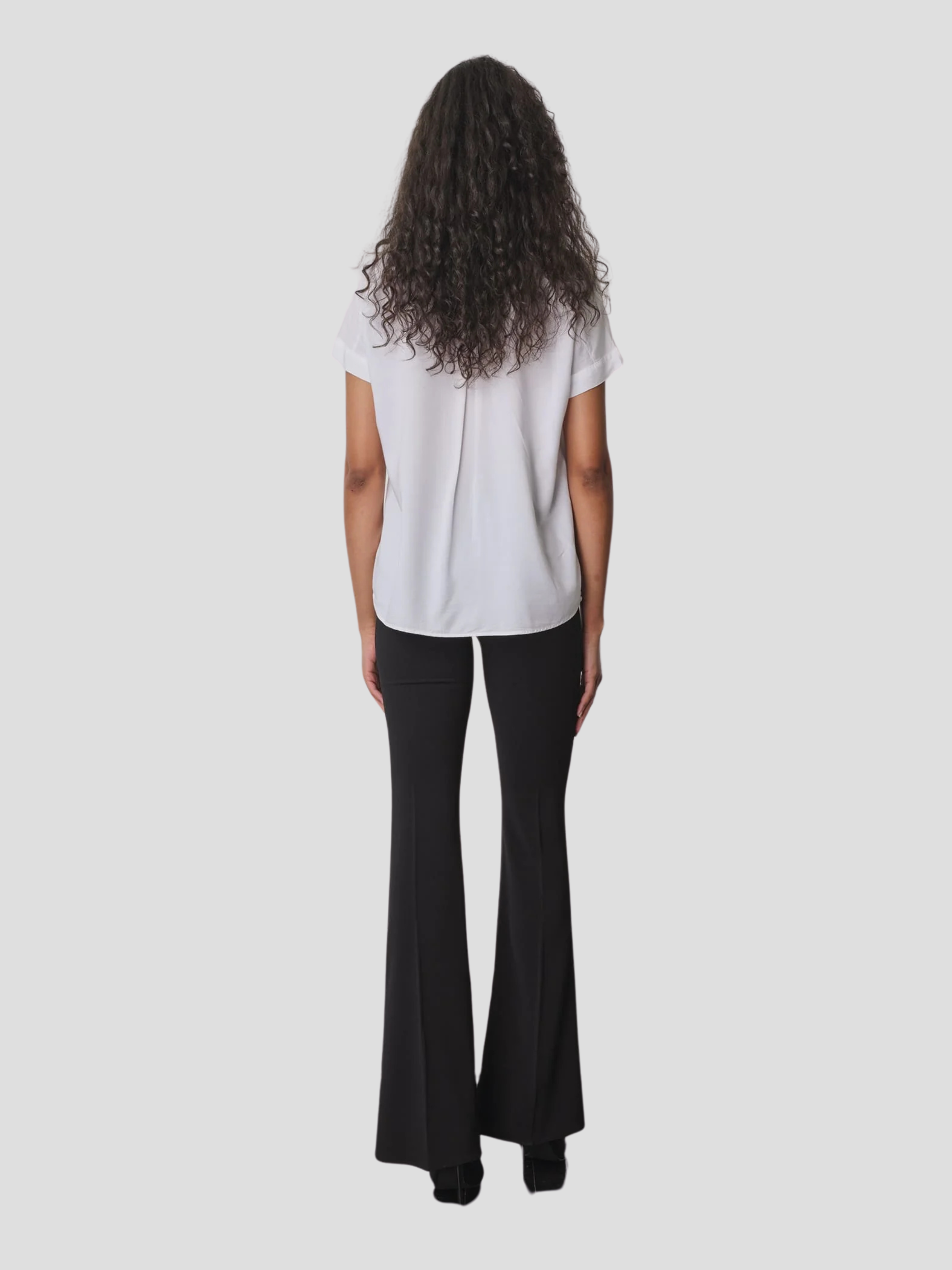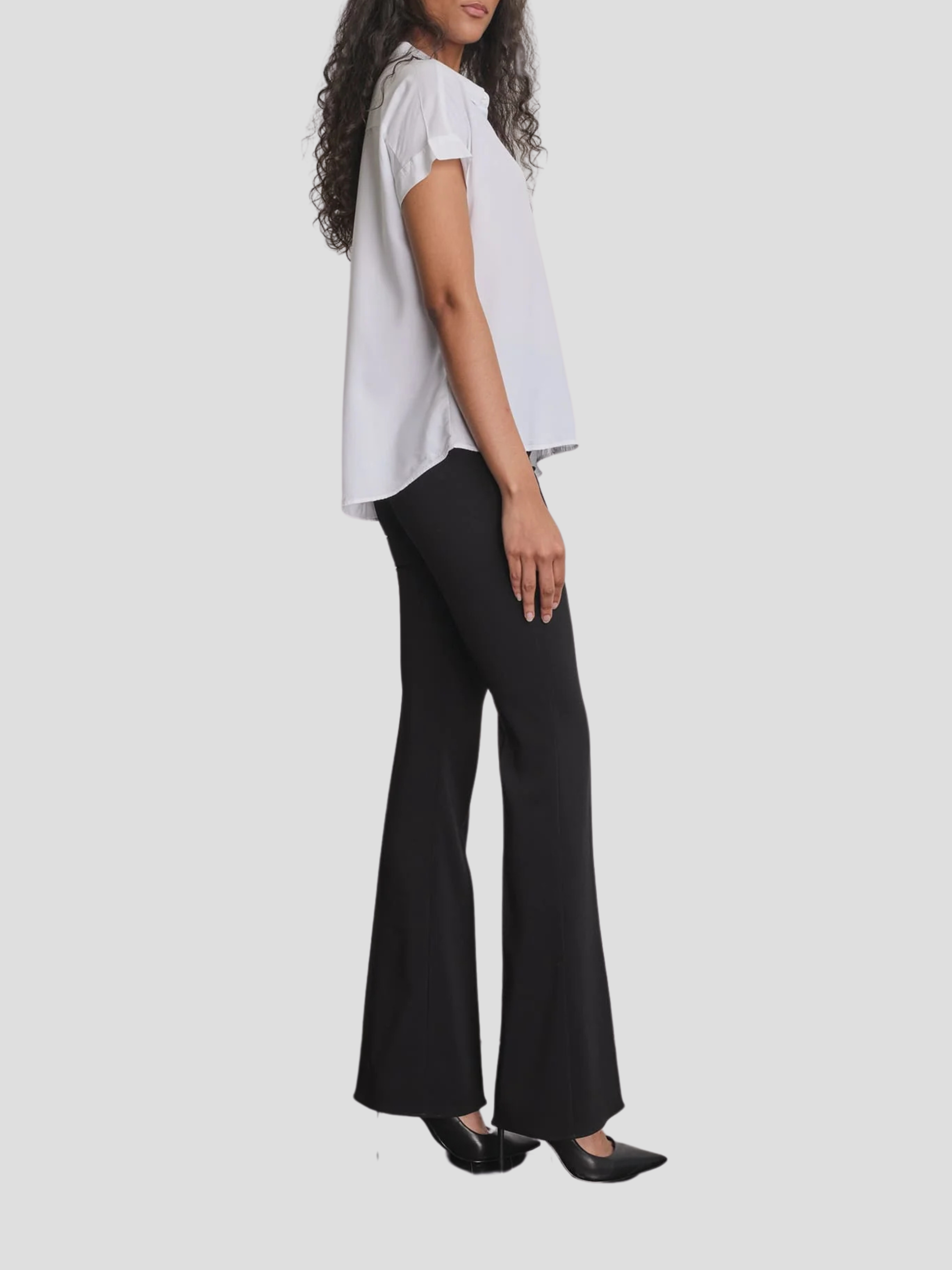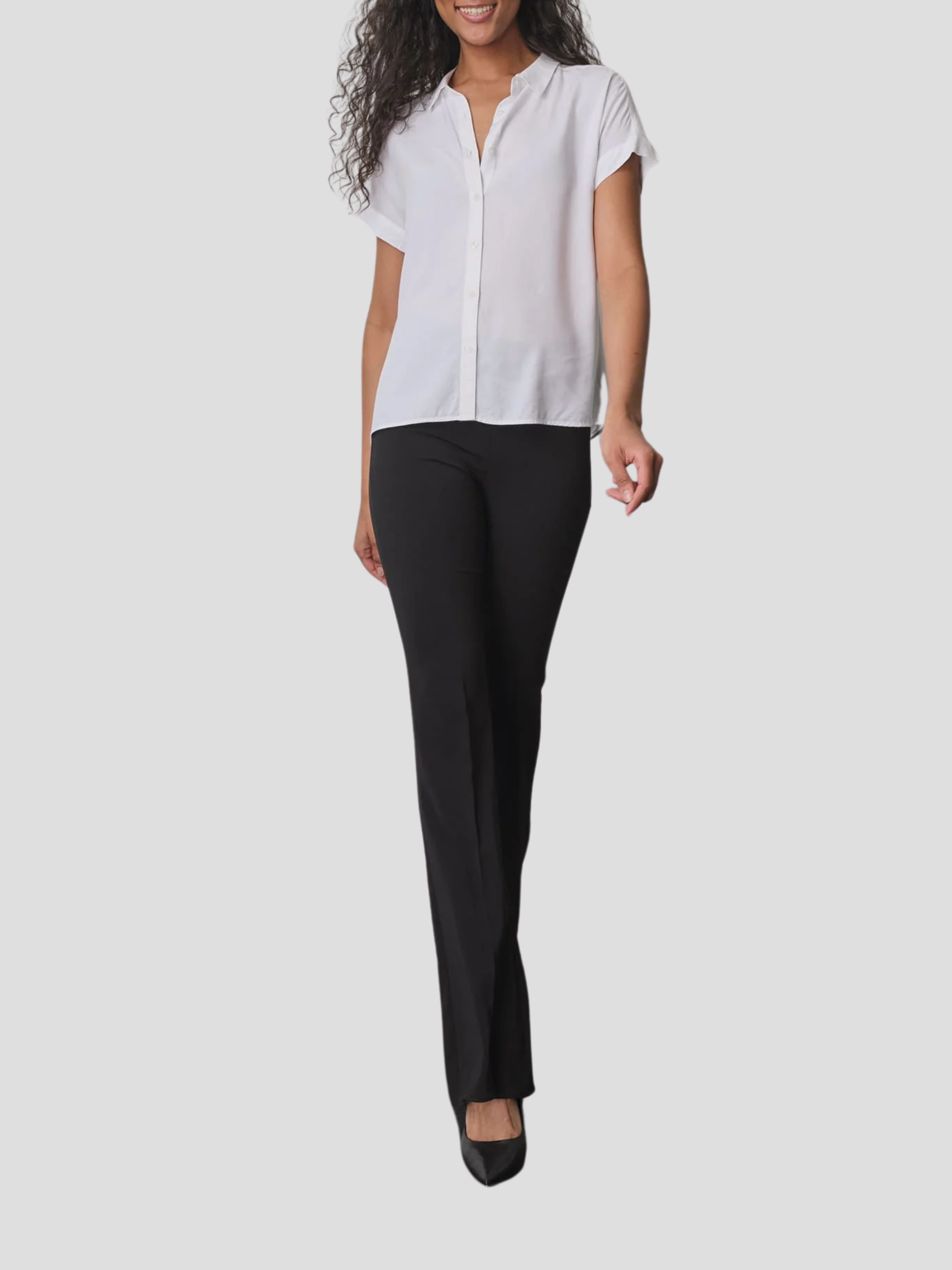 Sleek and sophisticated, the Bellini Flare Pant in Black Crepe is a must-have addition to your professional wardrobe. Crafted from high-quality crepe fabric, these pants feature a flattering flare silhouette and elegant black color. Perfect for any occasion, these pants will elevate your style and confidence.