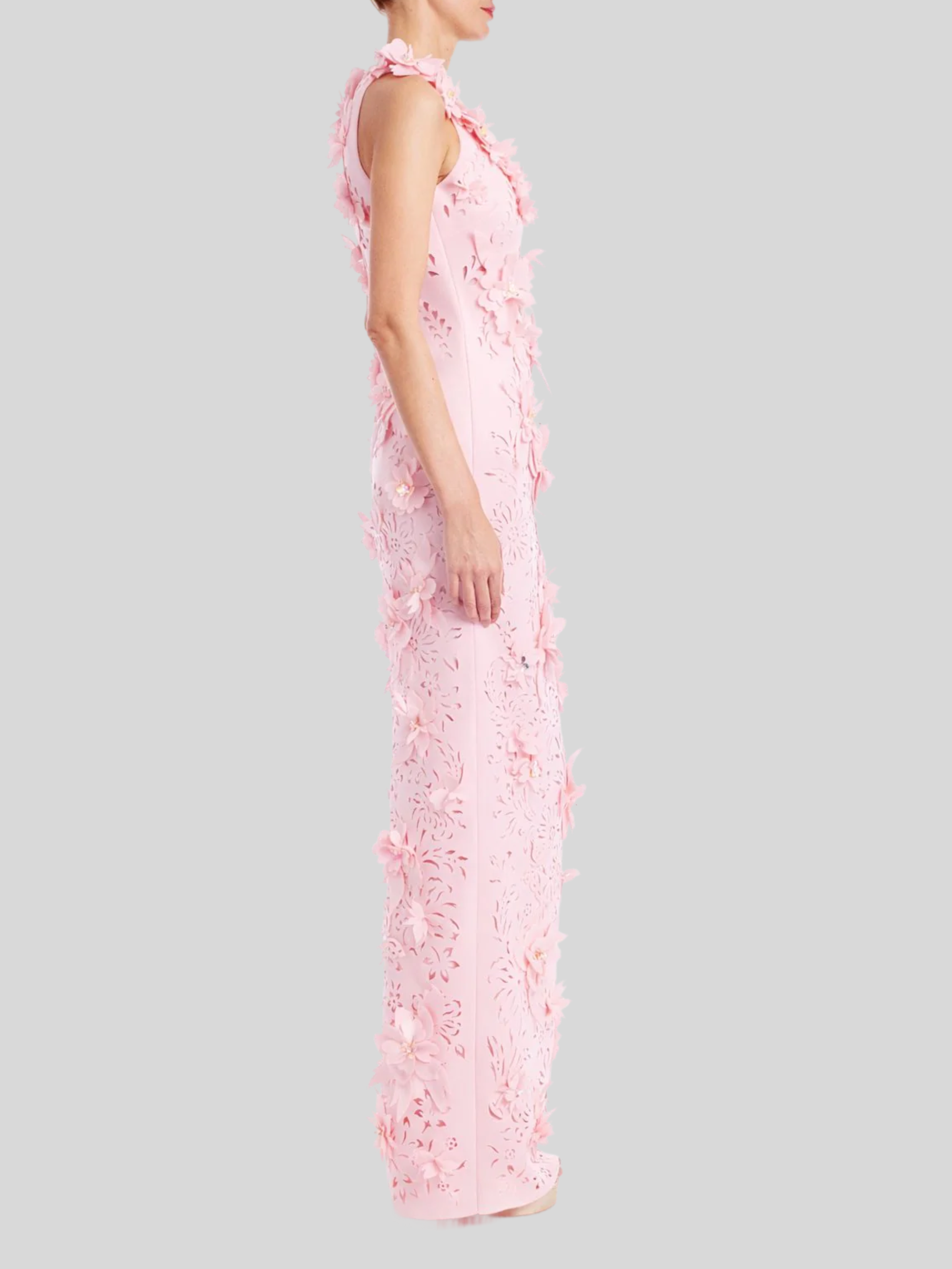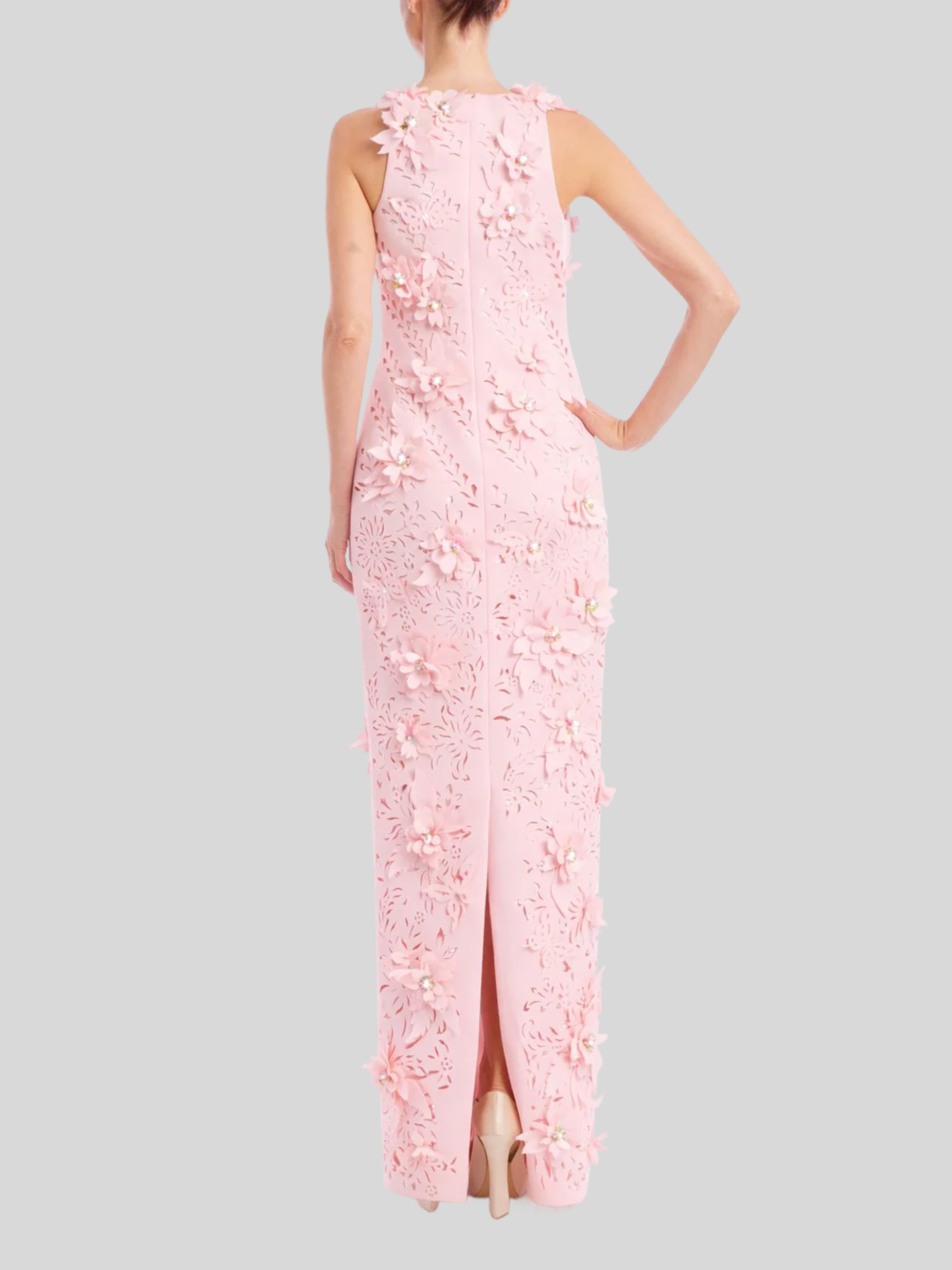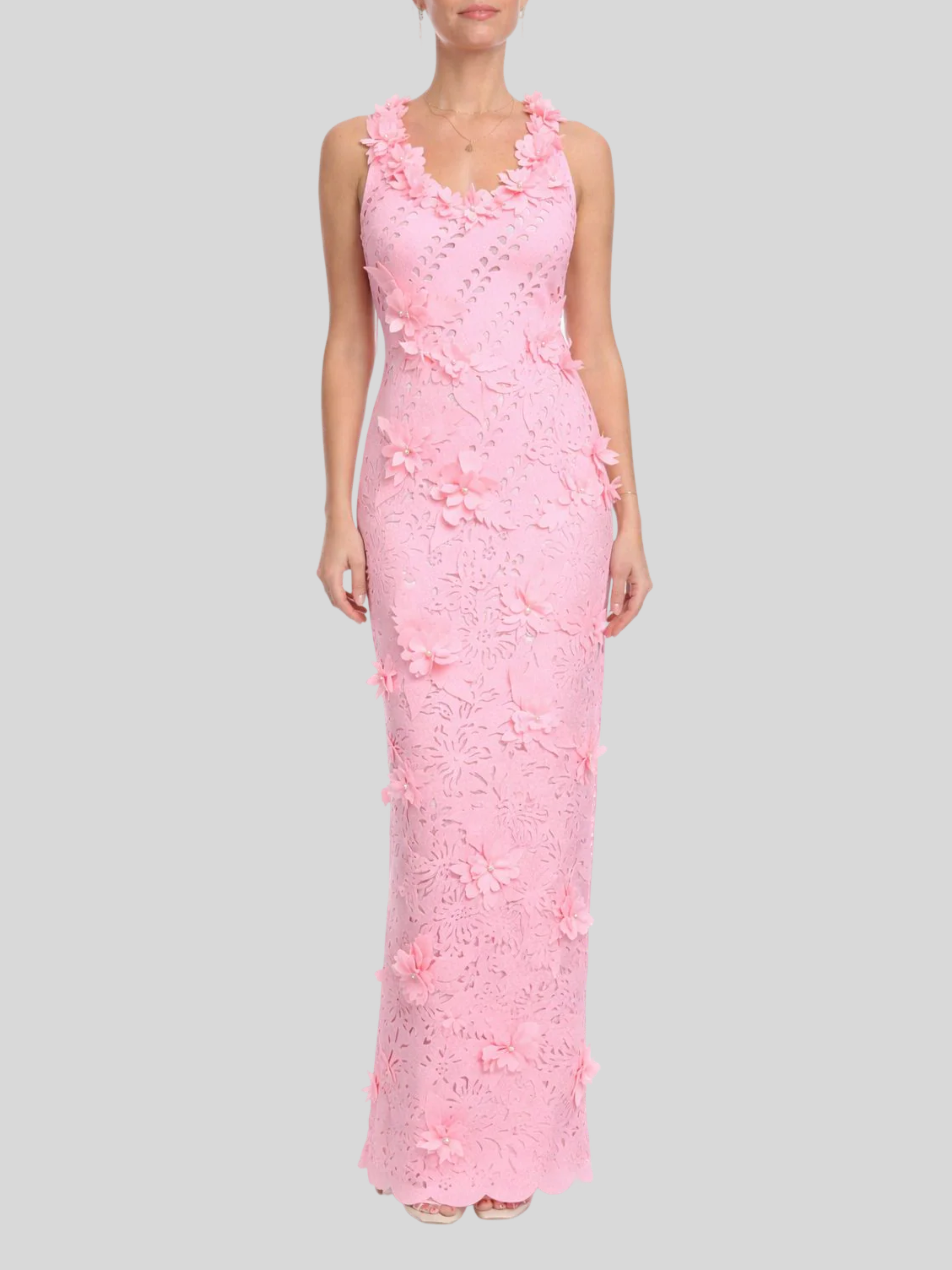 An elegant evening gown designed for the sophisticated woman. This maxi-length silhouette features a sleek column cut with a flattering slim fit, anchored by a refined V-neckline. The standout detail is the allover 3D floral appliqué adorned with pearl embellishments, creating dimensional texture and luminous movement. Sleeveless construction offers a graceful, uninterrupted line from shoulder to hem. Perfect for formal events, galas, and special occasions where timeless elegance meets modern artistry.