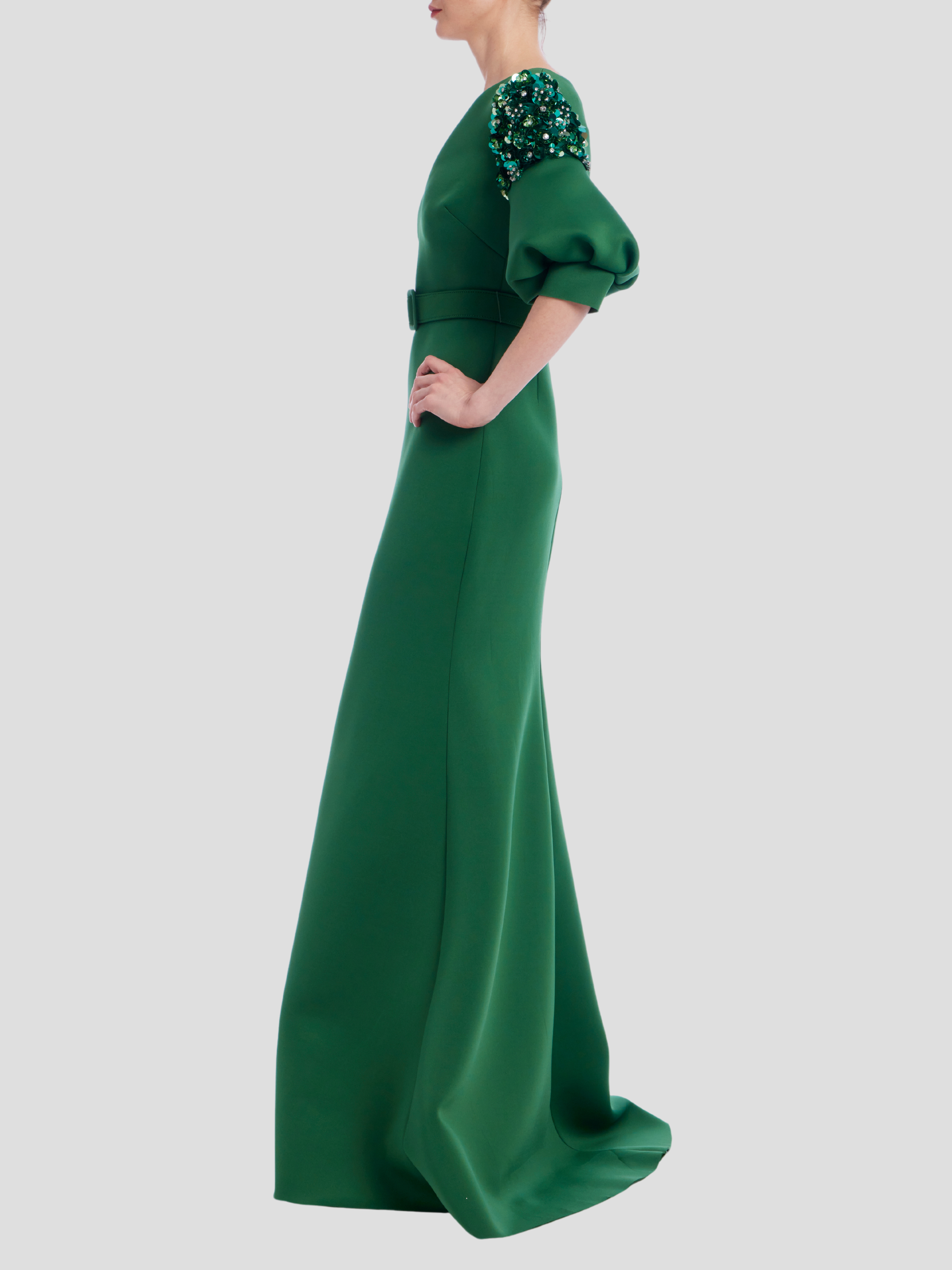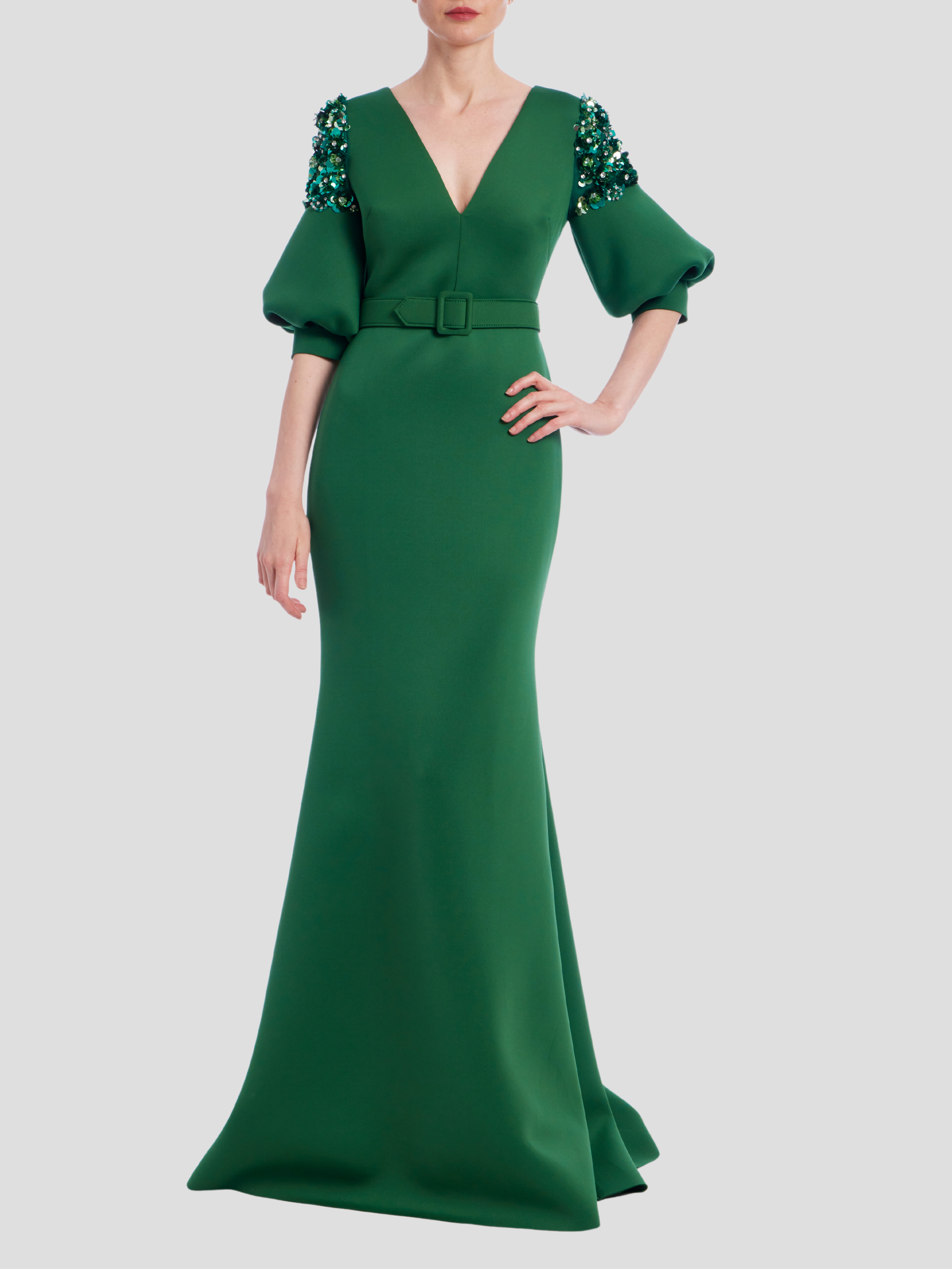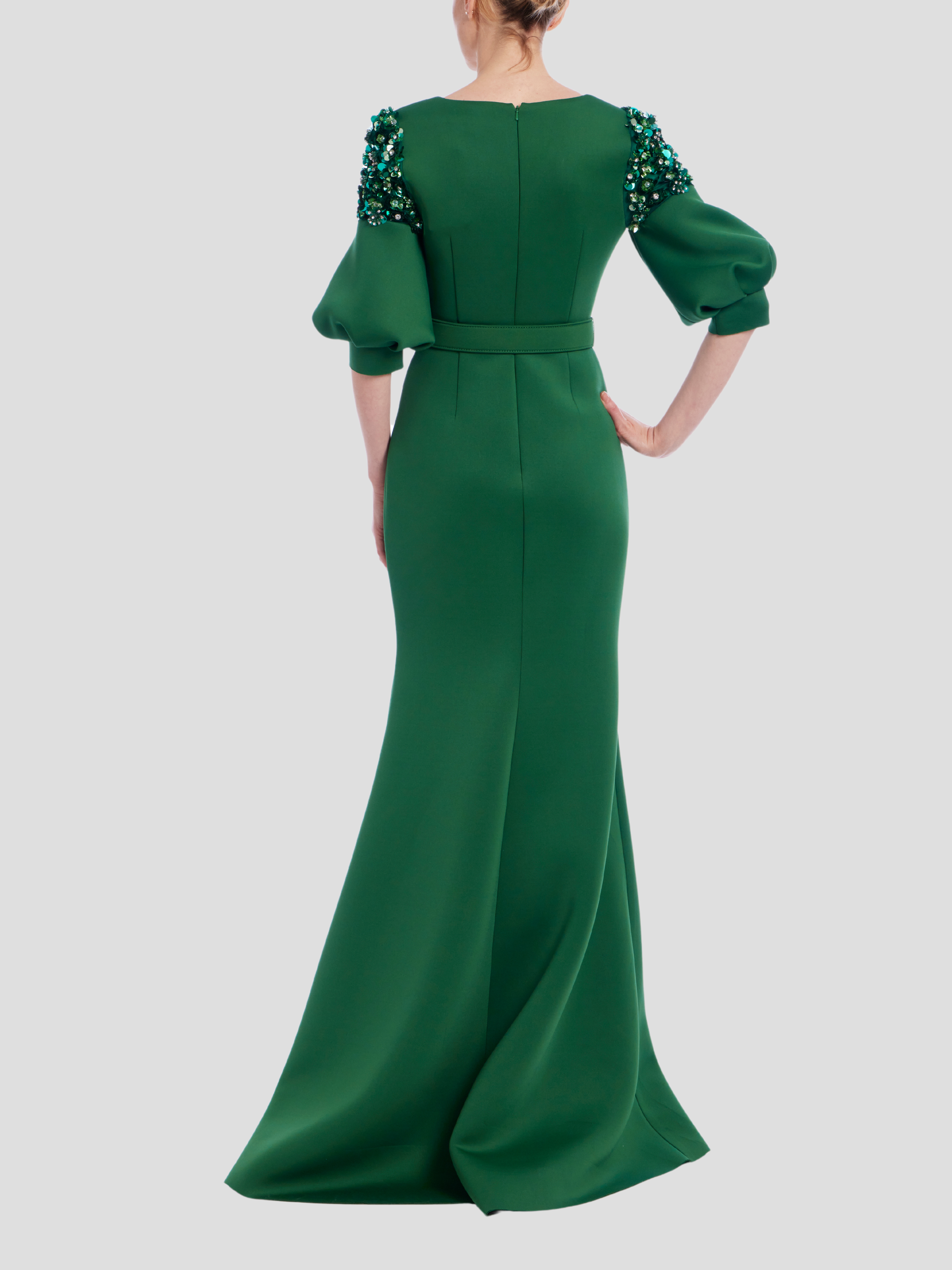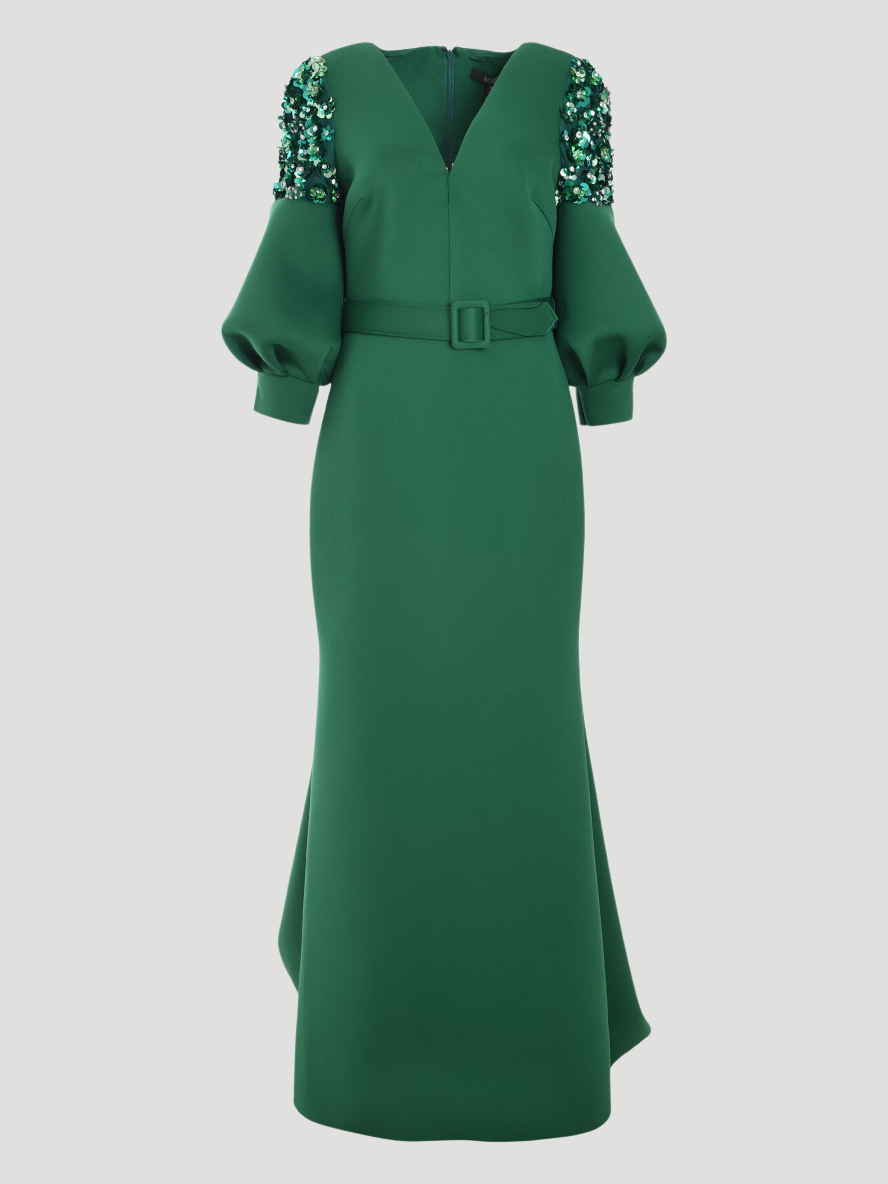 Expertly crafted with intricate beading and full sleeves, this stunning emerald gown exudes elegance and grace. Perfect for formal events or special occasions, it adds a touch of sophistication to any wardrobe. Made with high-quality materials, it offers both comfort and style. Elevate your look with this timeless piece.