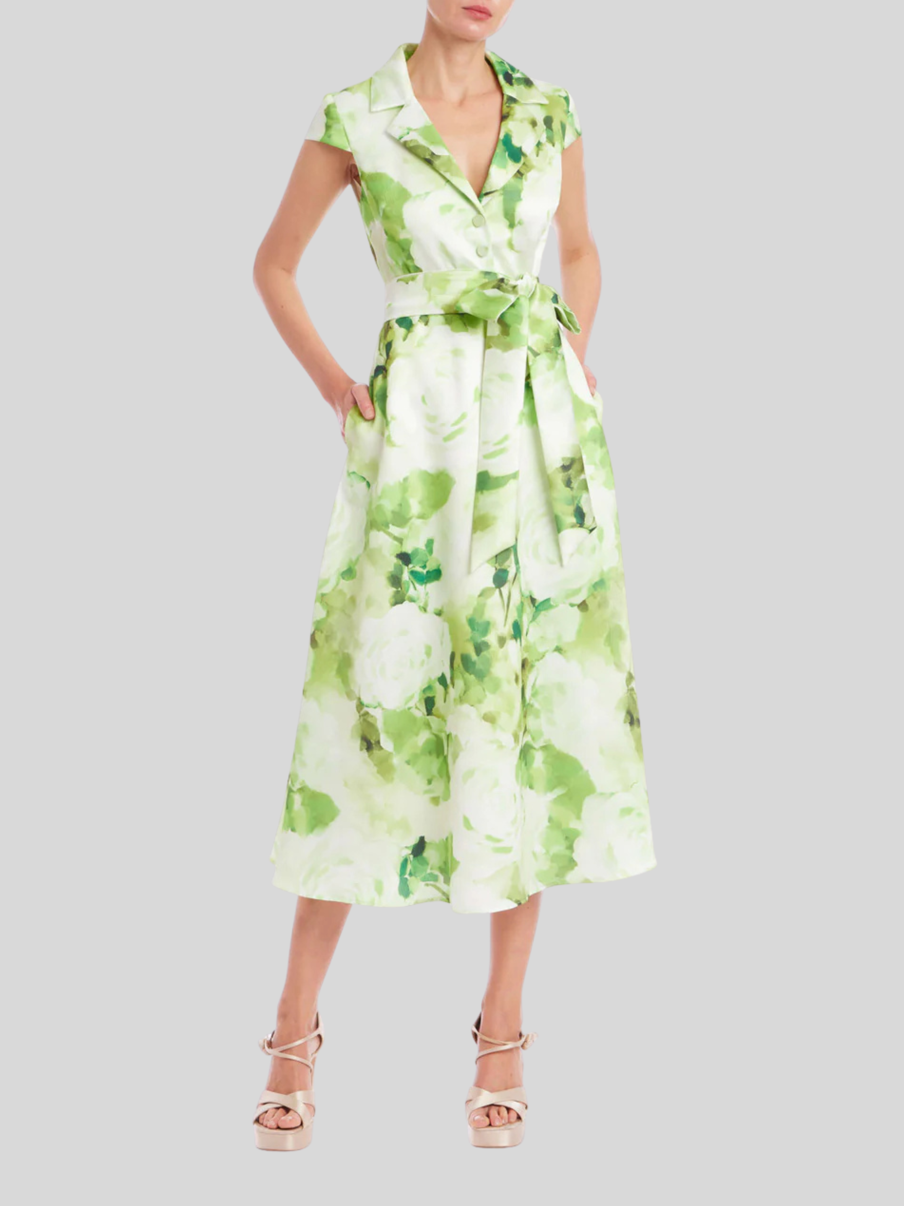 Belted Floral A-Line Midi Dress The Badgley Mischka Belted Floral A-Line Midi Dress offers sophisticated style for any occasion. This beautiful dress features a flattering A-line silhouette and elegant tea-length hem. A fitted bodice complements the graceful design, while the self-tie sash accentuates the waist. Notice the charming cap sleeves and classic collar that add a touch of refinement. The vibrant printed floral pattern will make you feel radiant. This shirt dress, with its flattering v-neckline, is perfect for day or evening events. Embrace the pebble gazer print in this must-have midi dress.