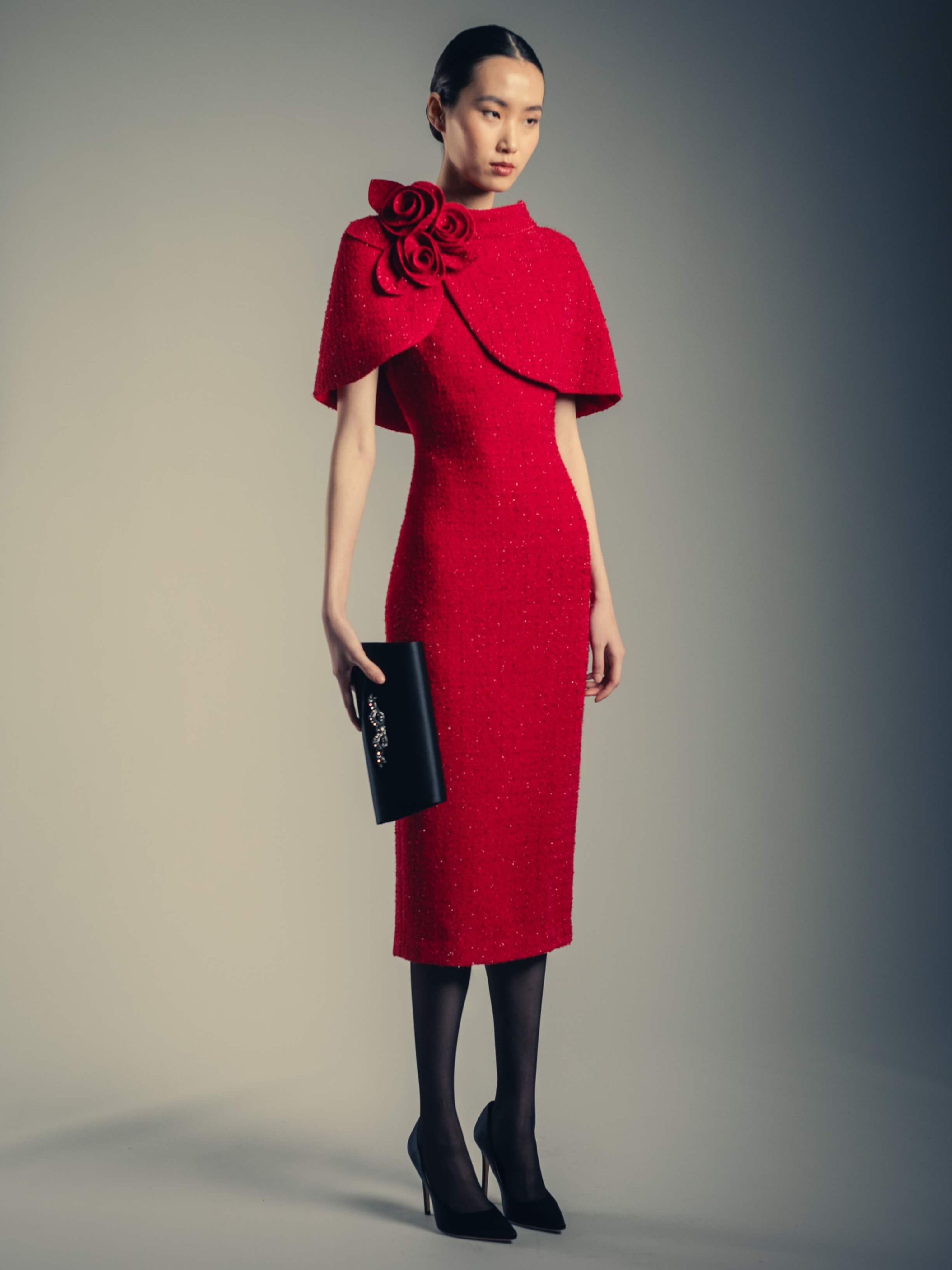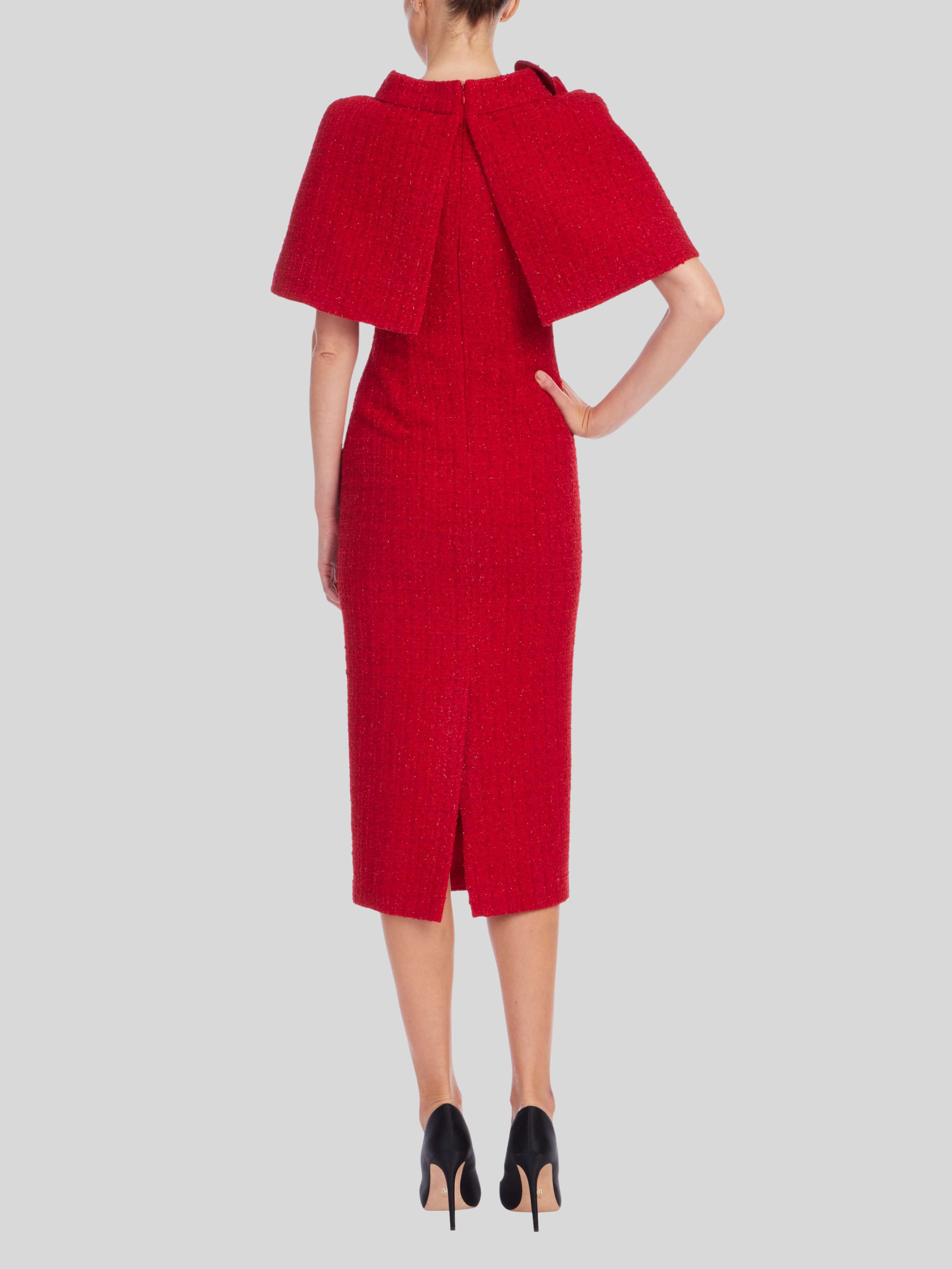 Elevate your wardrobe with this sophisticated Badgley Mischka cocktail dress. Perfect as a work dress or for special occasions, this stunning sheath dress features an elegant attached overlap cape in a luxurious twinkle boucle fabric. The chic mock neck and flattering short sleeve capelet design add a touch of modern flair, while the exquisite rosette shoulder detail provides a feminine accent. Designed in a slim fit and hitting at a sophisticated midi length, this dress is sure to turn heads.