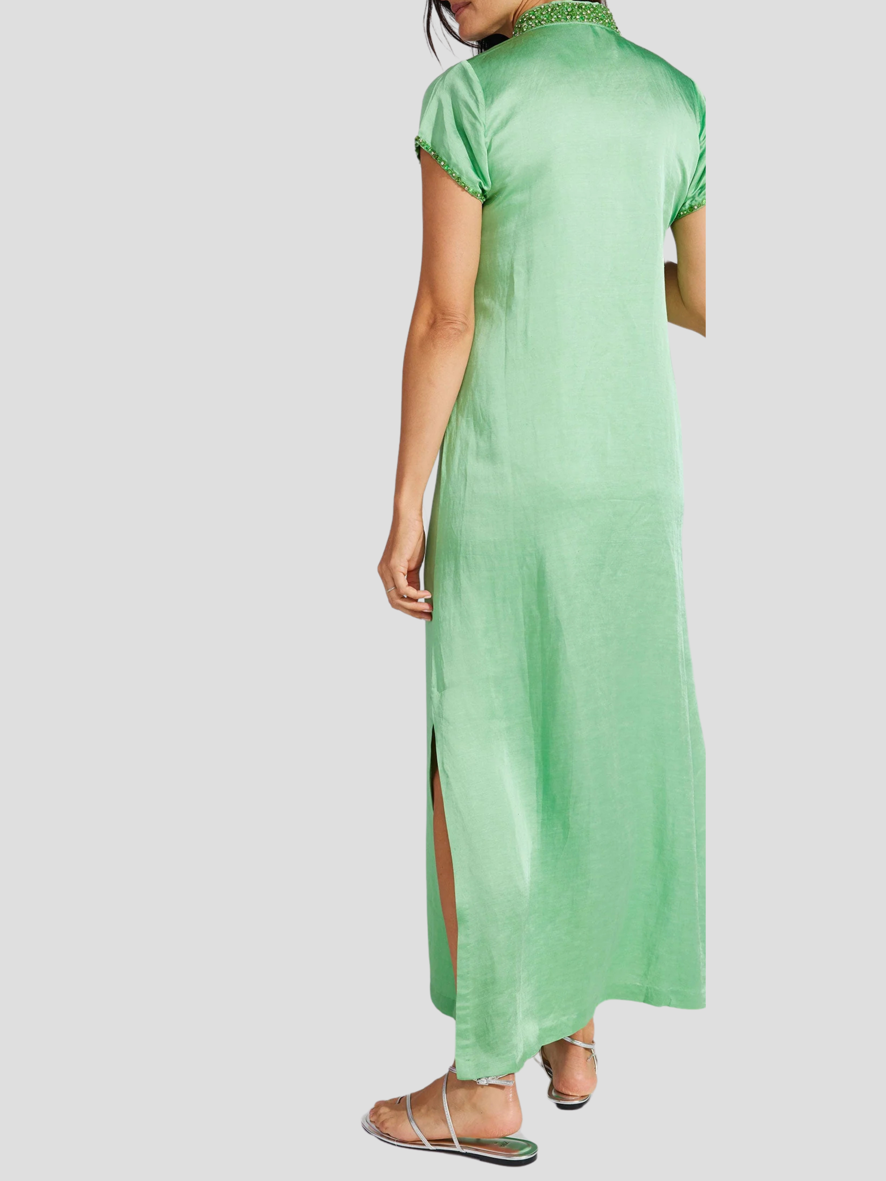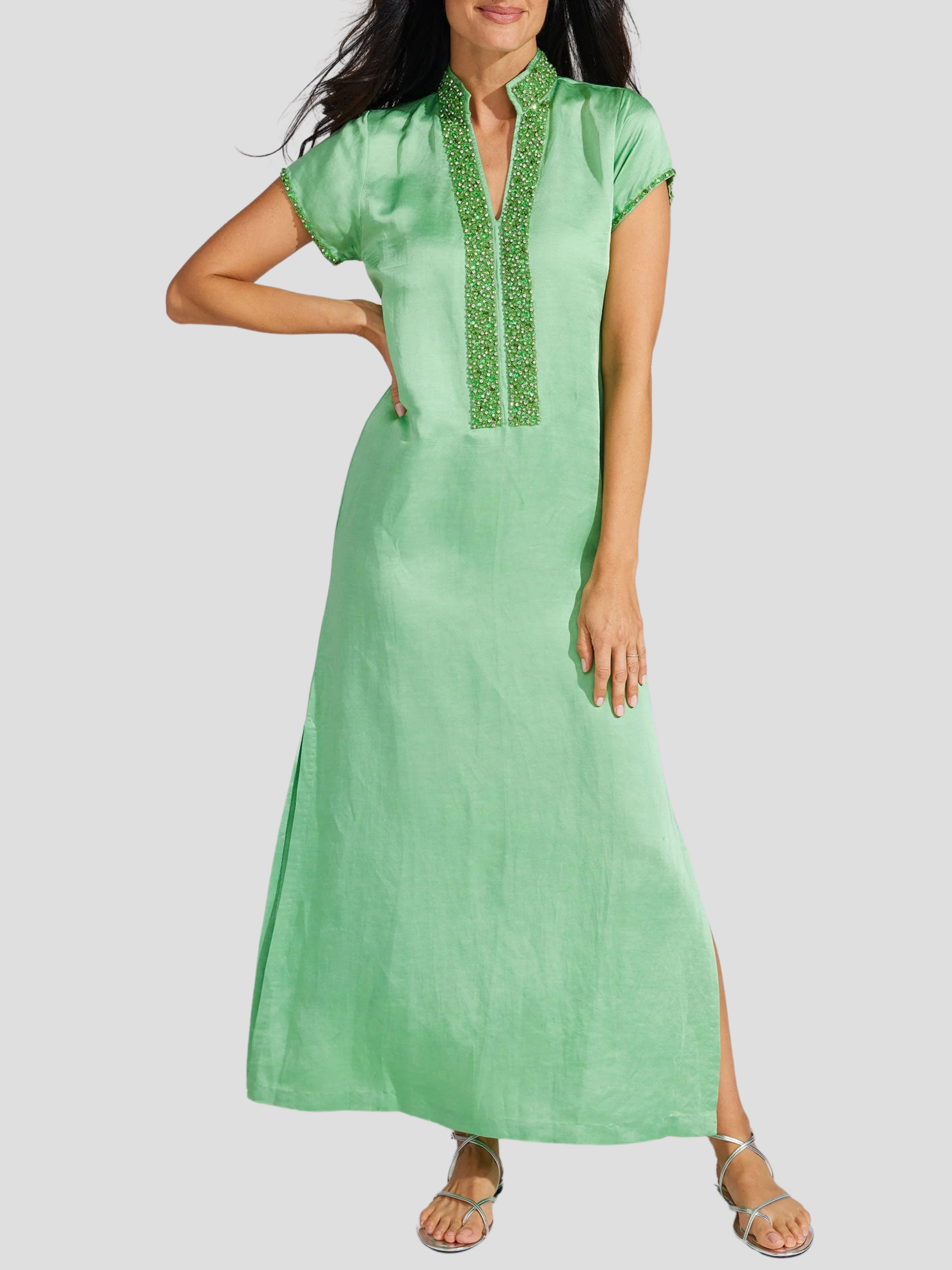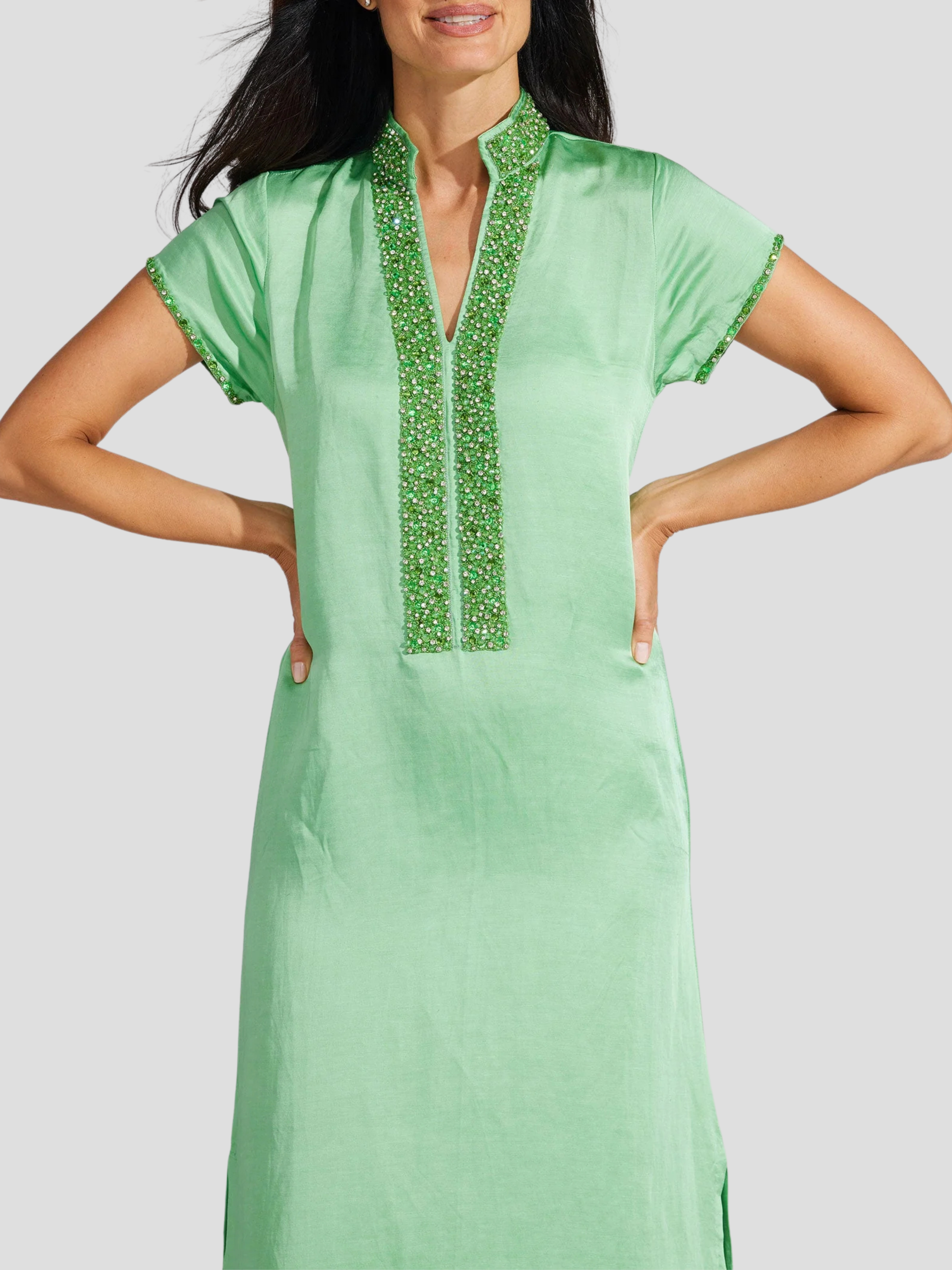 Effortlessly chic and perfect for any occasion, the Meg 54" Cap Sleeve Caftan in Pear is a must-have for your holiday wardrobe. This glamorous caftan features hand-beaded details on the mandarin collar and neckline, adding a touch of elegance to the tonal color palette. Make a statement in our best-selling lilac shade, perfect for any vacation.