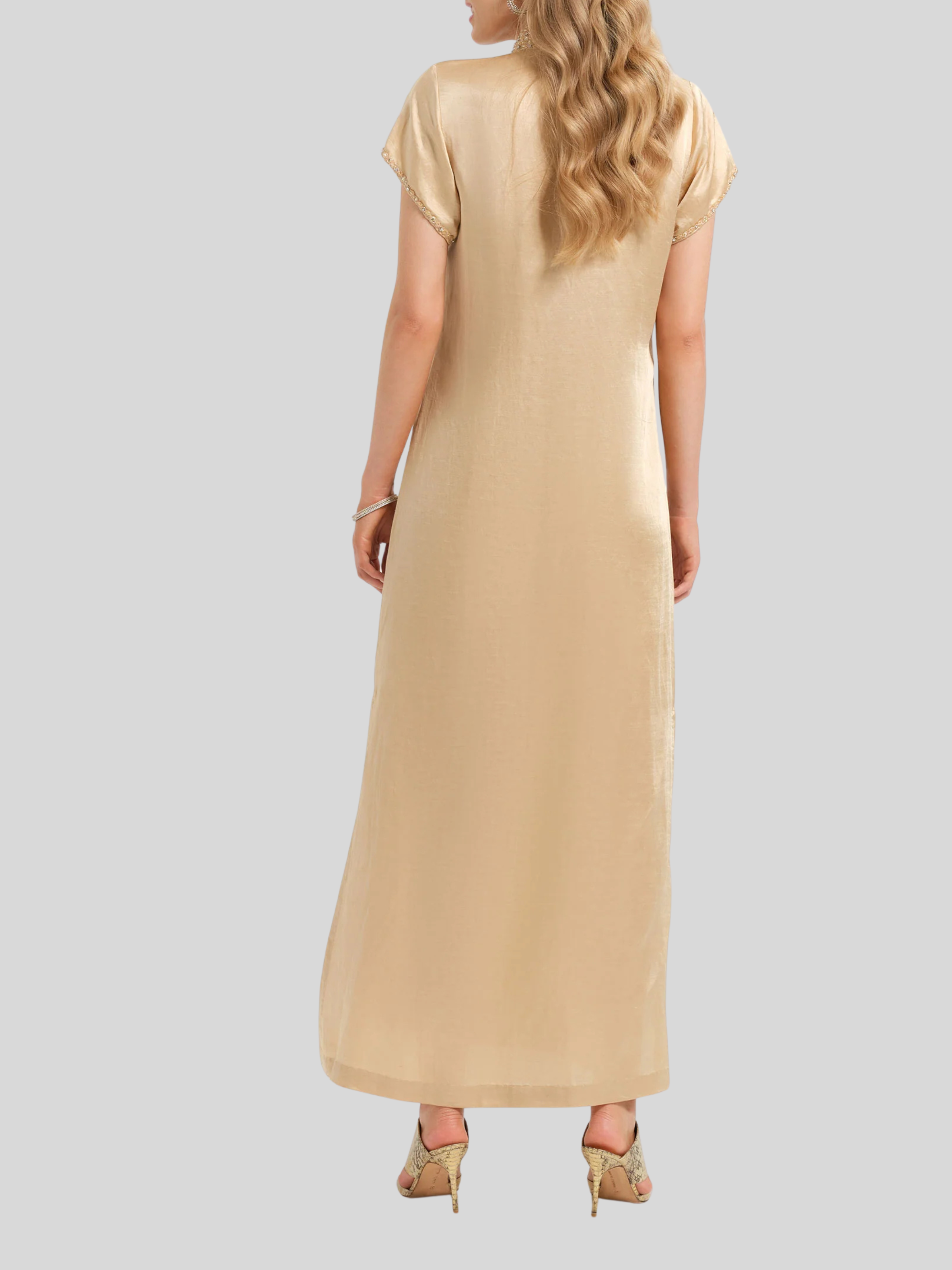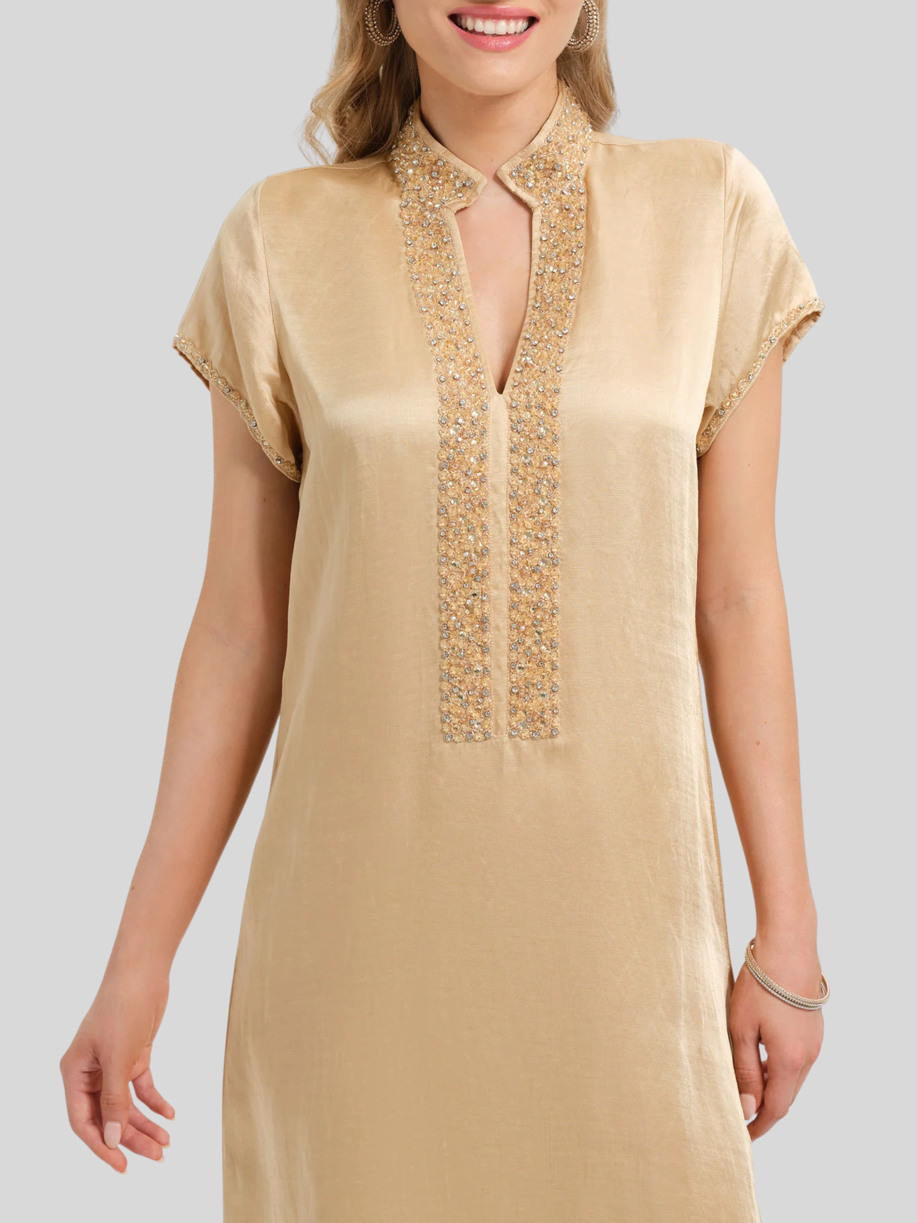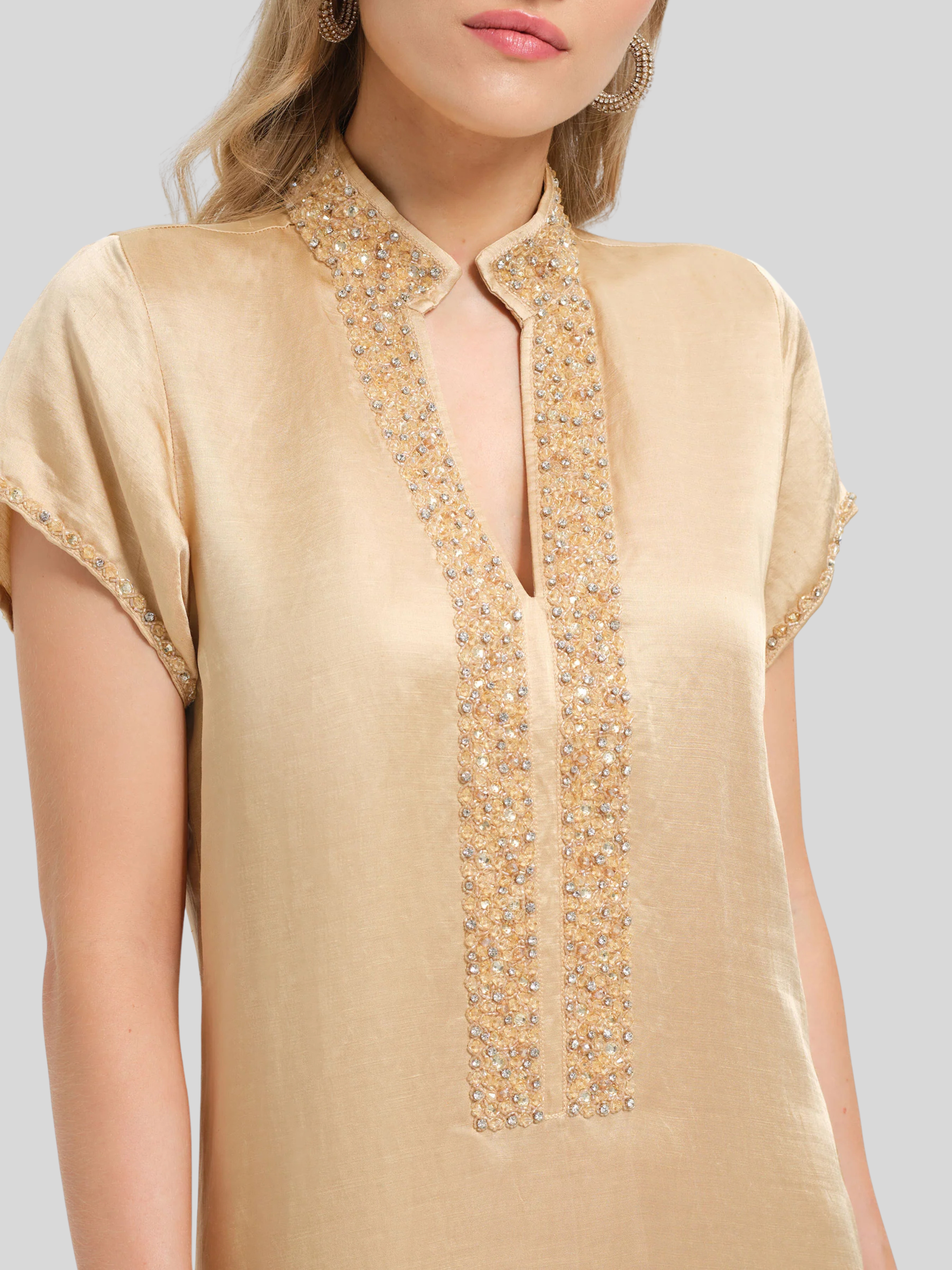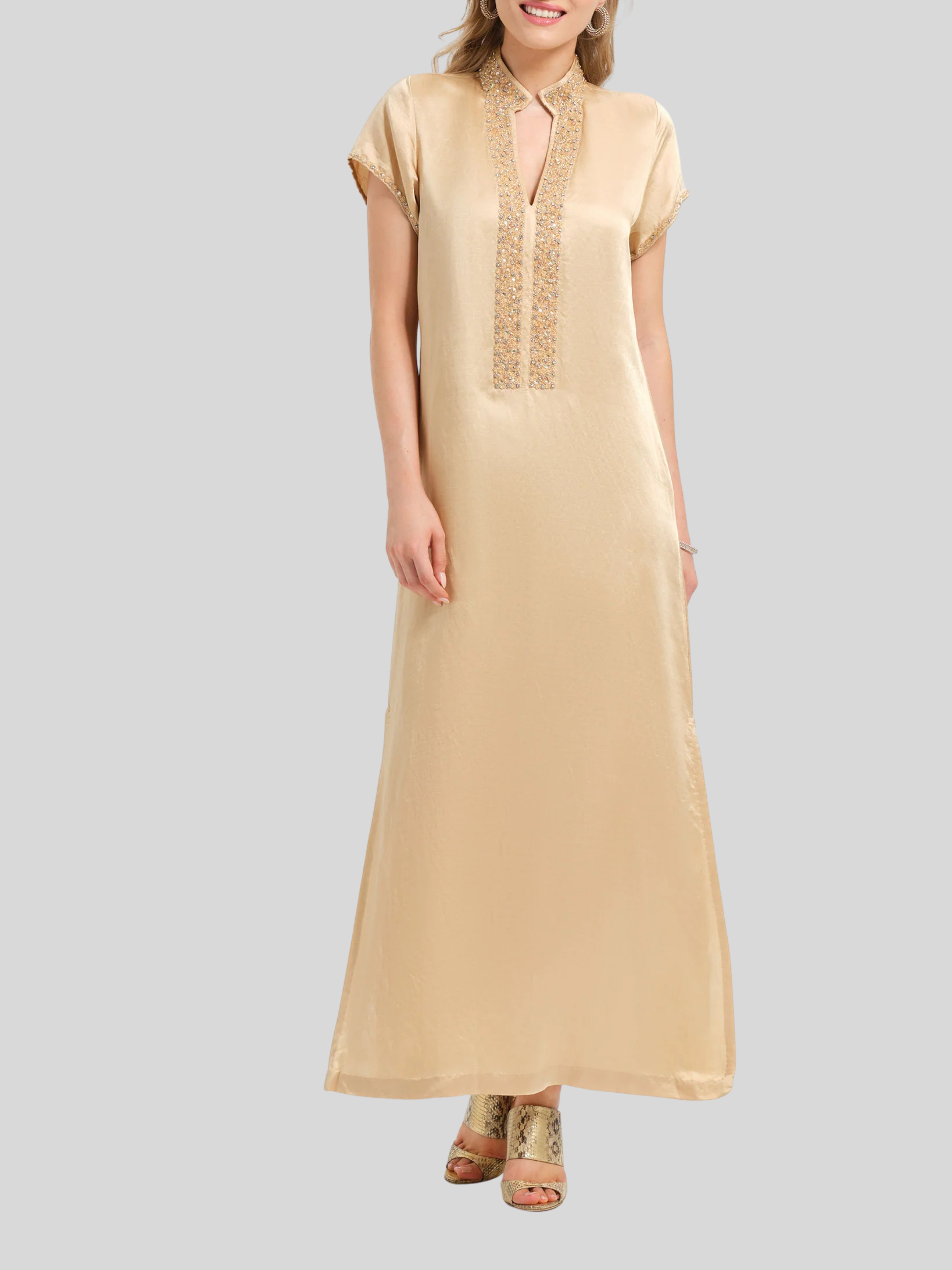 The Meg Caftan is the instantly classic and ultra chic piece you'll be reaching for all special occasion dressing! From evening soirees to poolside entertaining, this effortless silhouette exudes glamour with a tonal color palette and hand beading on the mandarin collar and neckline. Our newest Champagne colorway will add shimmer and shine to your wardrobe. It is the perfect neutral all year long.