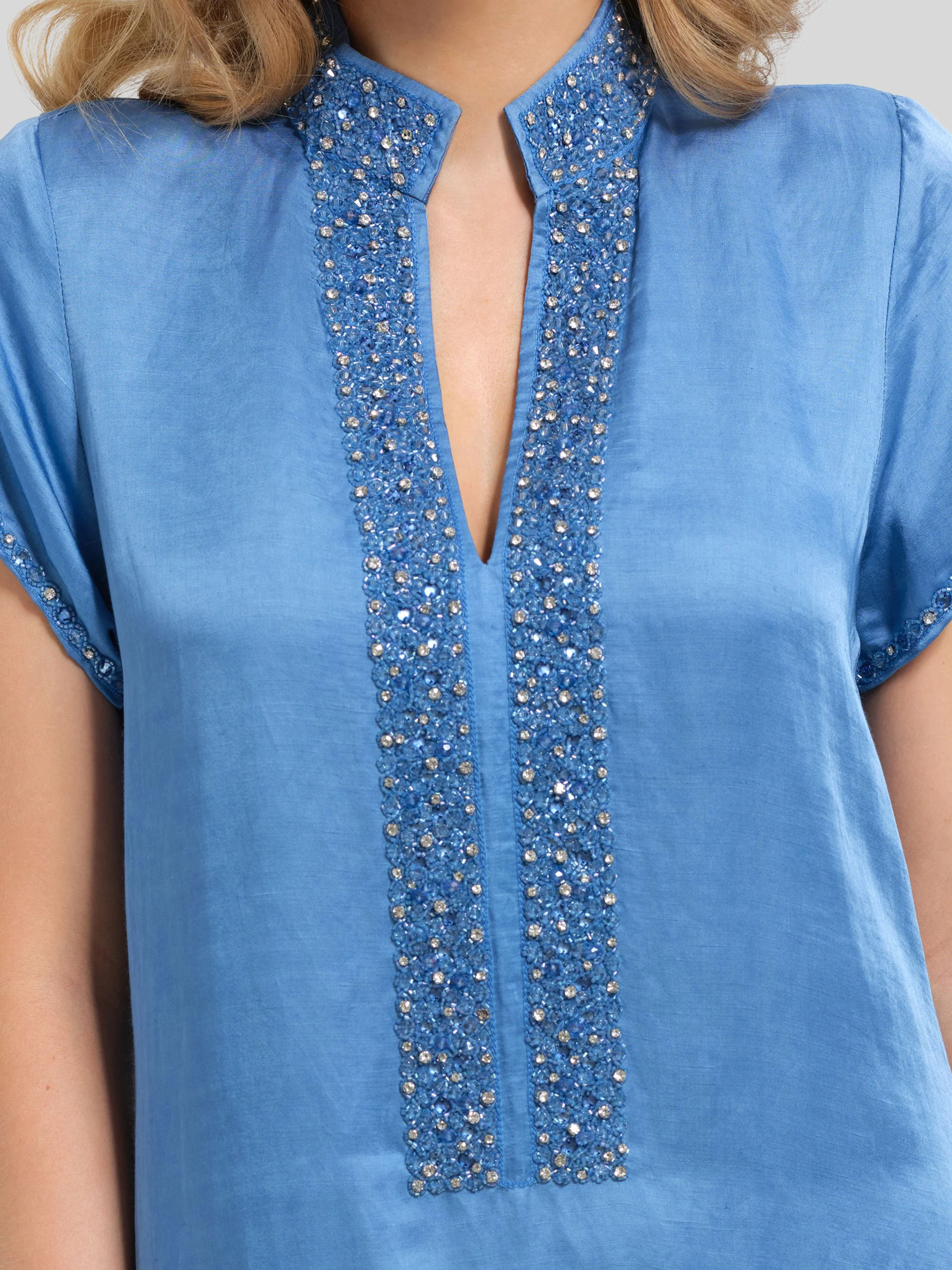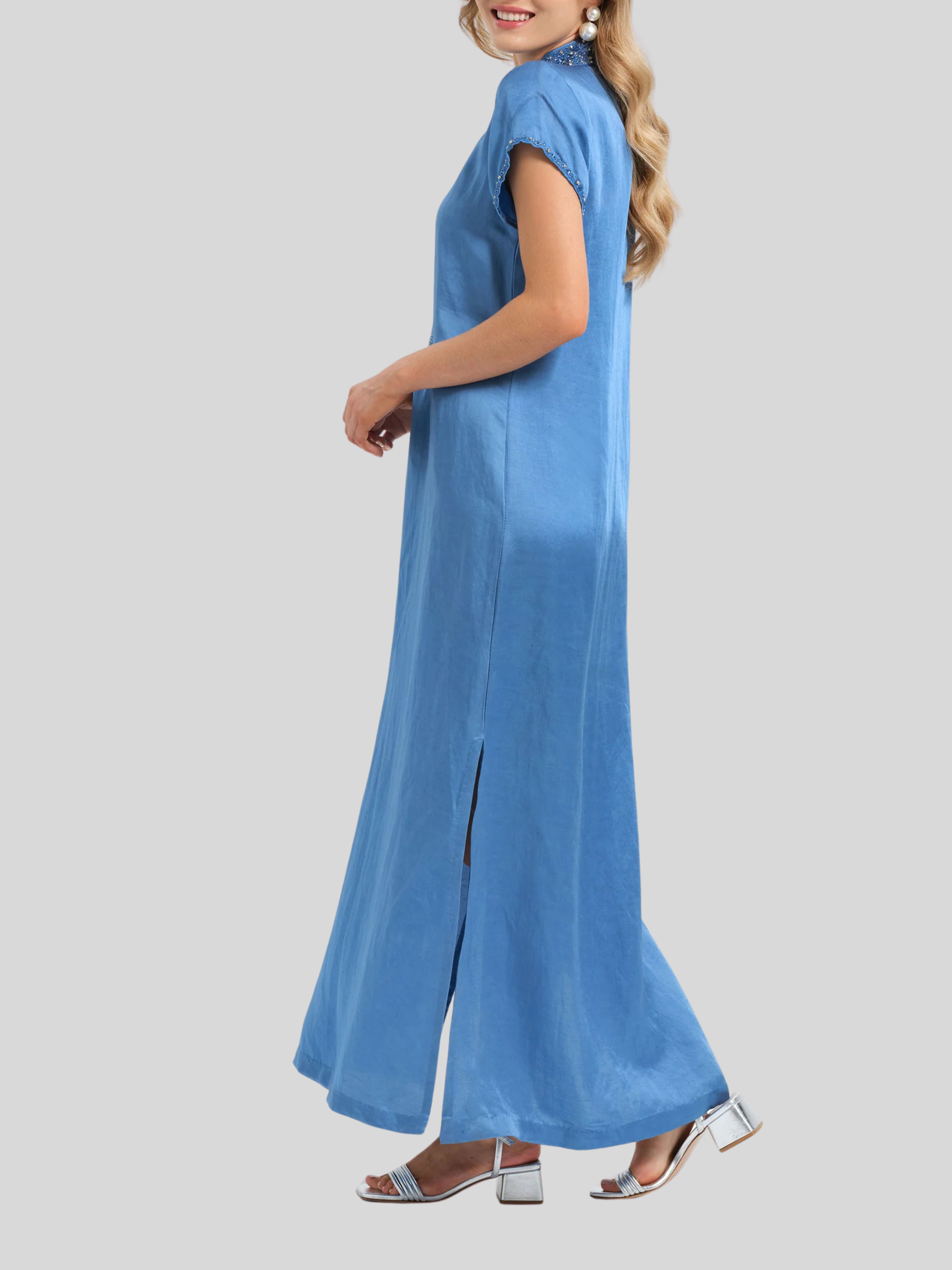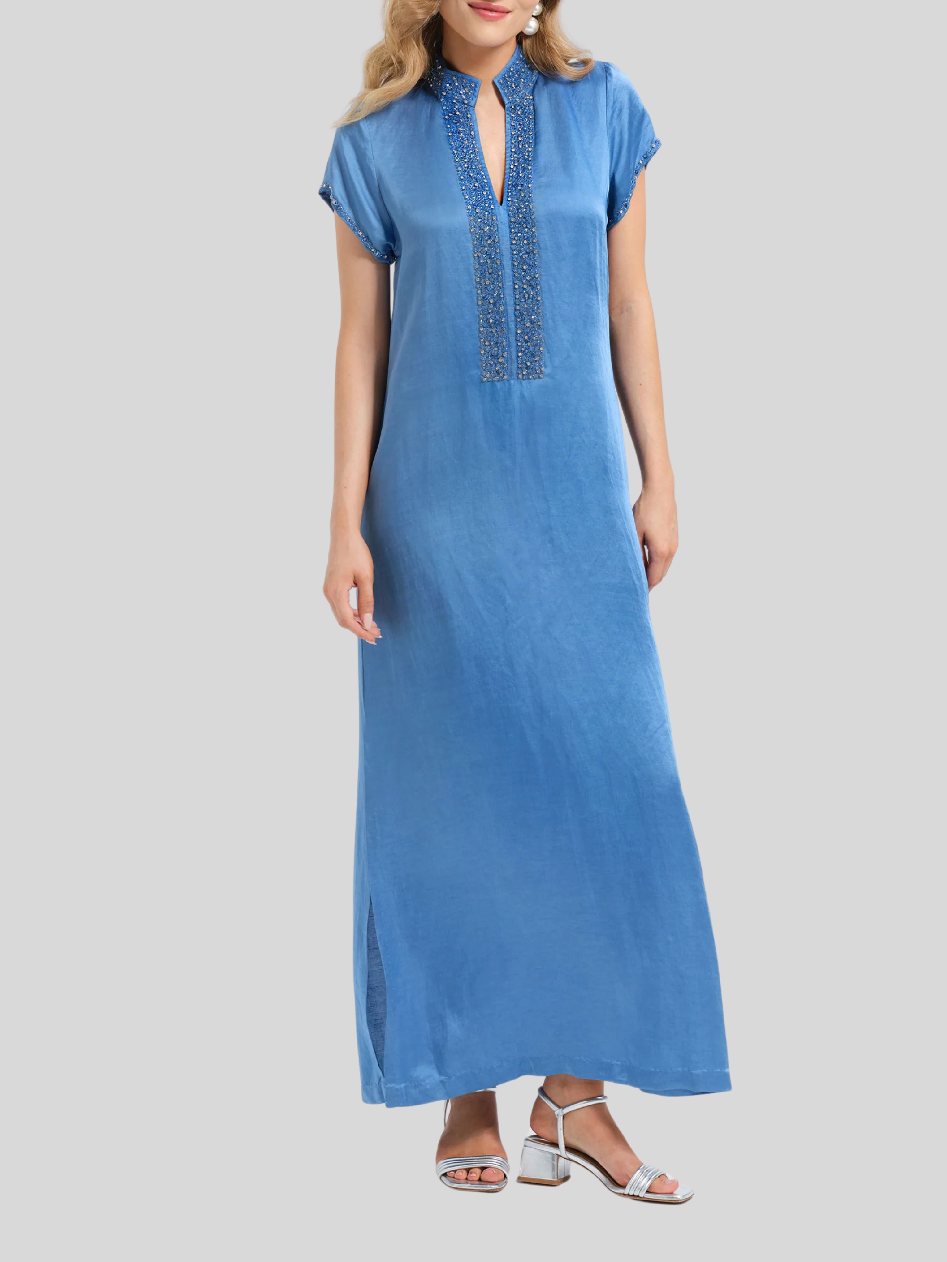The Meg Caftan is the instantly classic and ultra chic piece you'll be reaching for all special occasion dressing! From evening soirees to poolside entertaining, this effortless silhouette exudes glamour with a tonal color palette and hand beading on the mandarin collar and neckline. Our newest Cornflower colorway will add shimmer and shine to your wardrobe. Everyone looks good in blue! This color pairs perfectly with silver accessories.