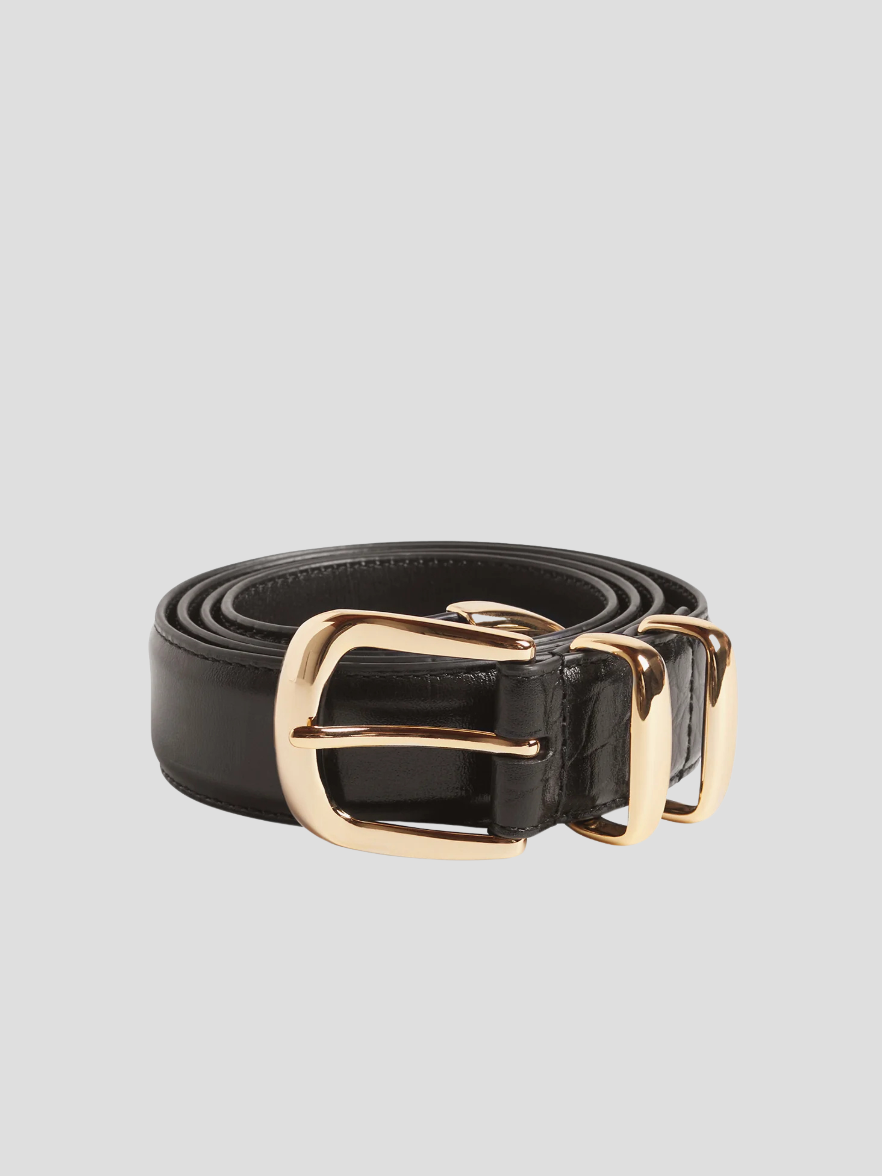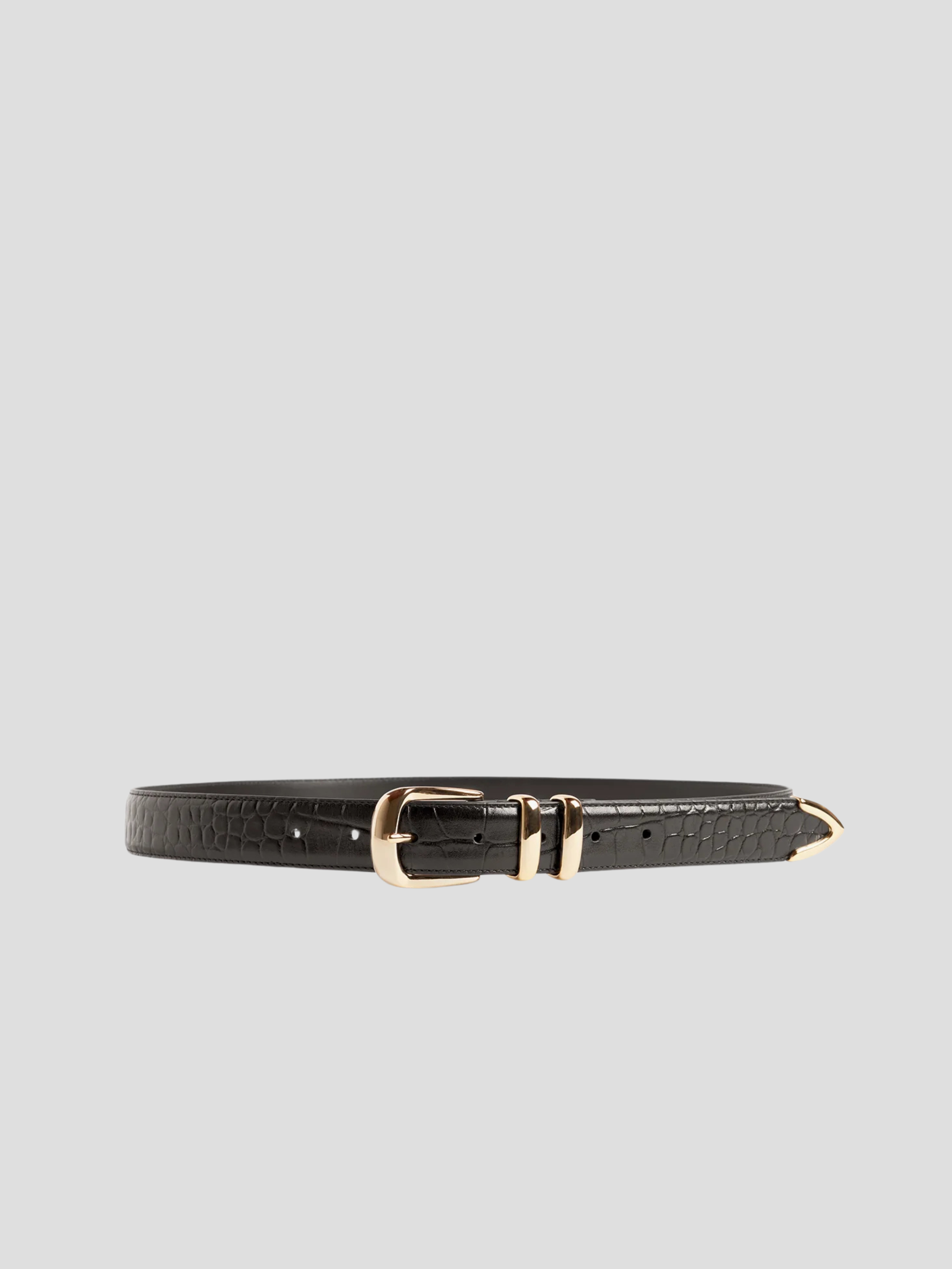Introducing the Jordan Croc Embossed Belt in Brown and Gold. This luxurious and stylish belt features a unique crocodile embossed pattern with a subtle gold buckle. Elevate your outfit with this timeless accessory.