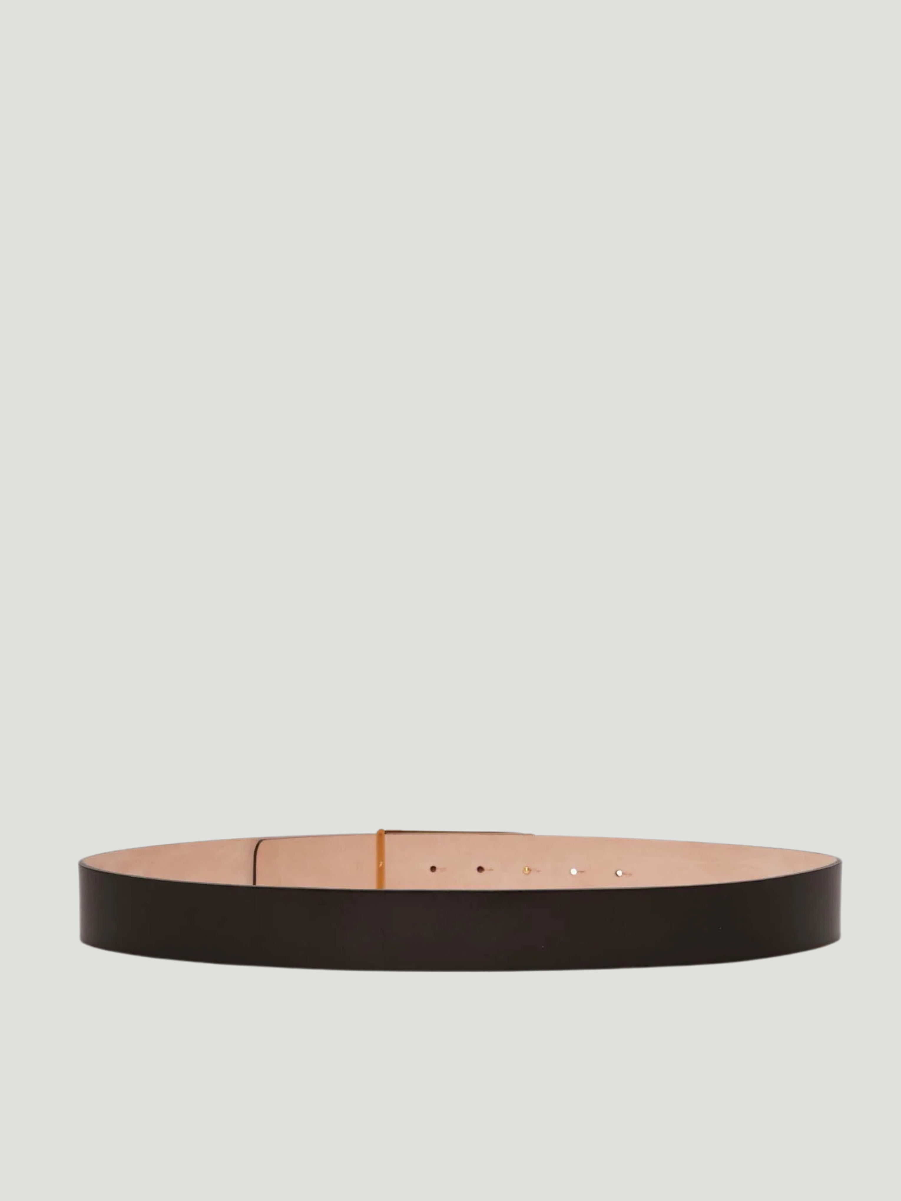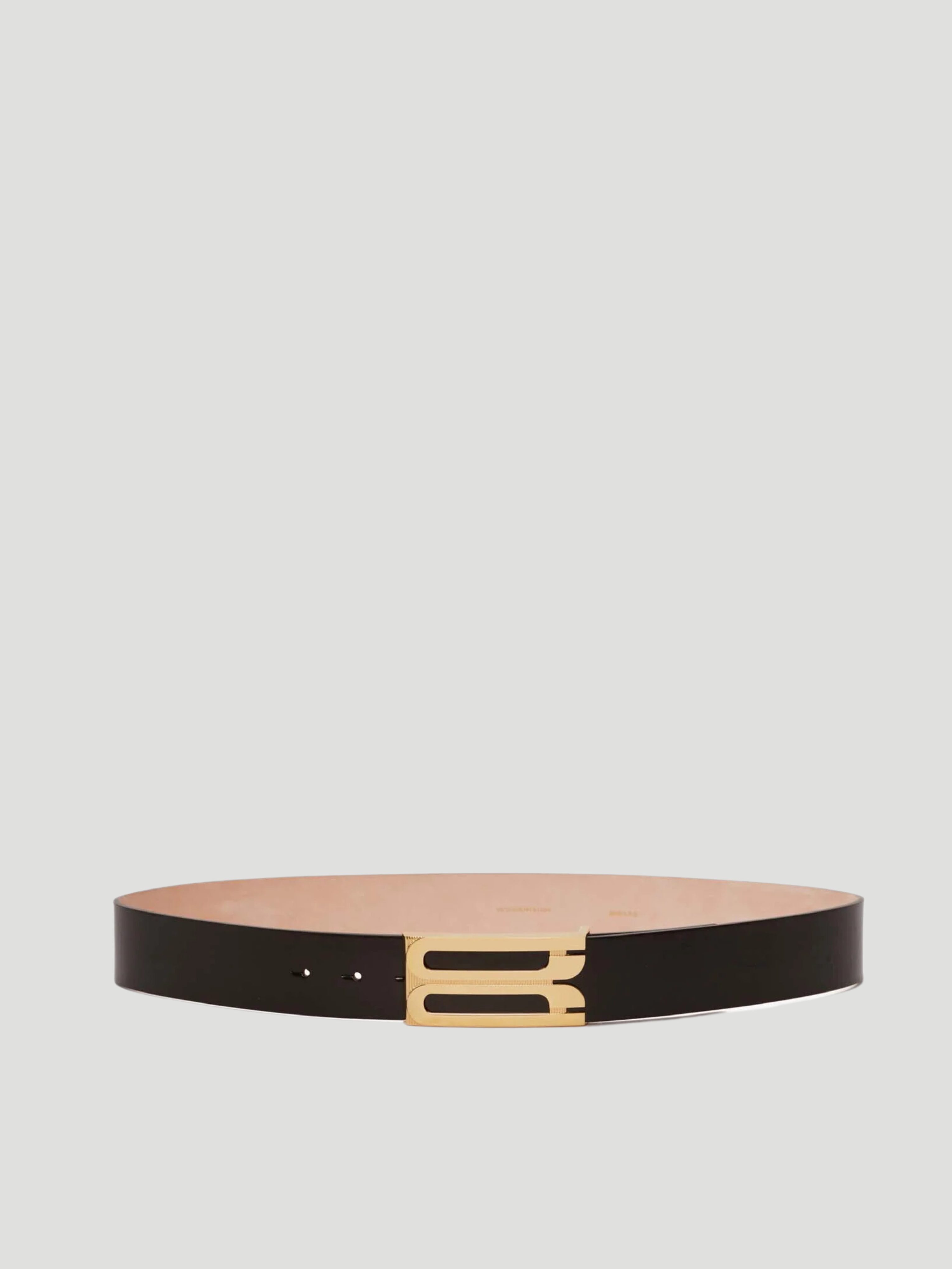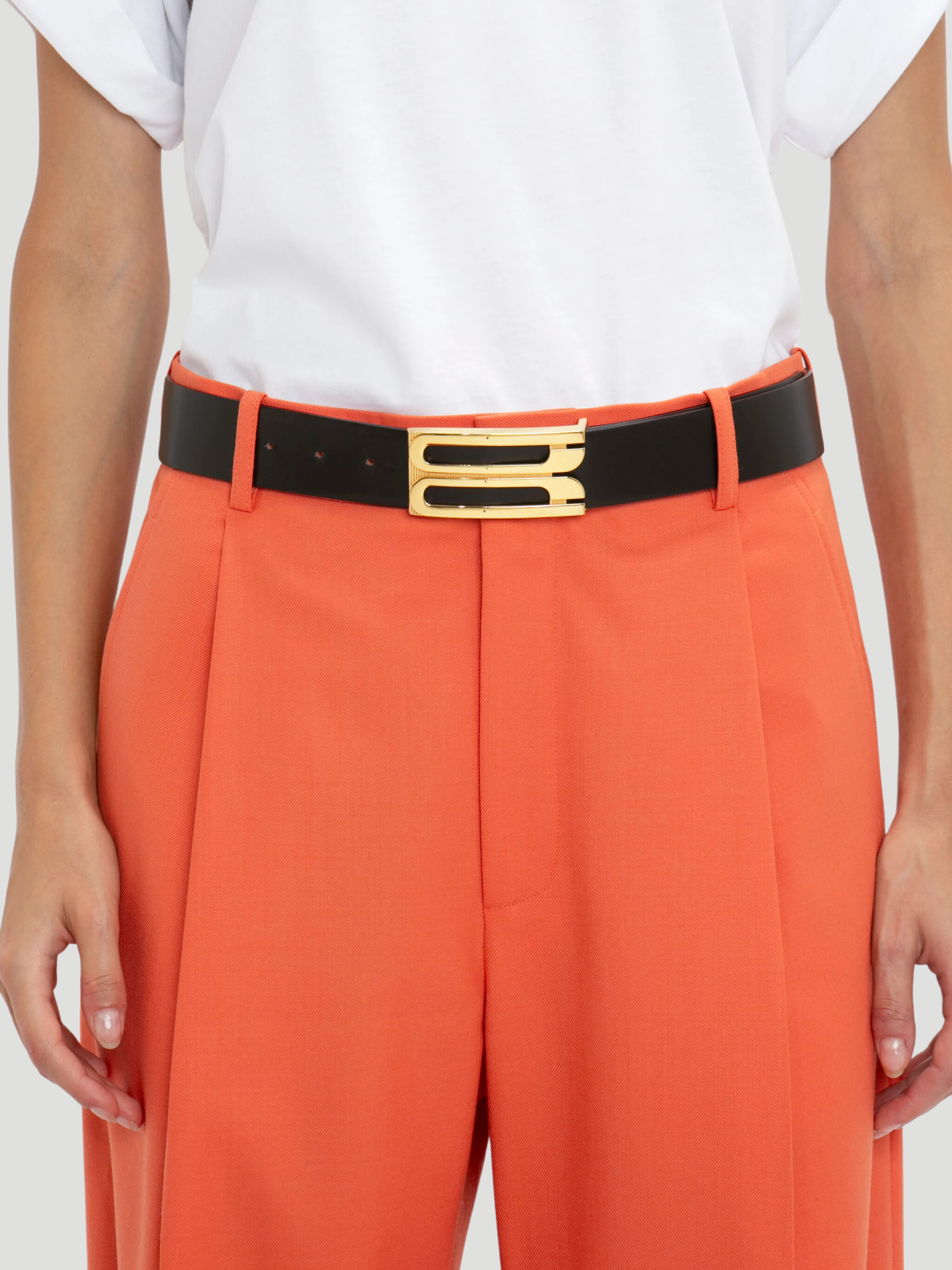 Introduce a modern touch to your wardrobe with the Victoria Beckham Jumbo Frame Belt. Crafted from smooth calf leather and adorned with luxurious gold hardware, this accessory adds a subtle yet sophisticated flair to any outfit. Elevate your style this season with its understated elegance.