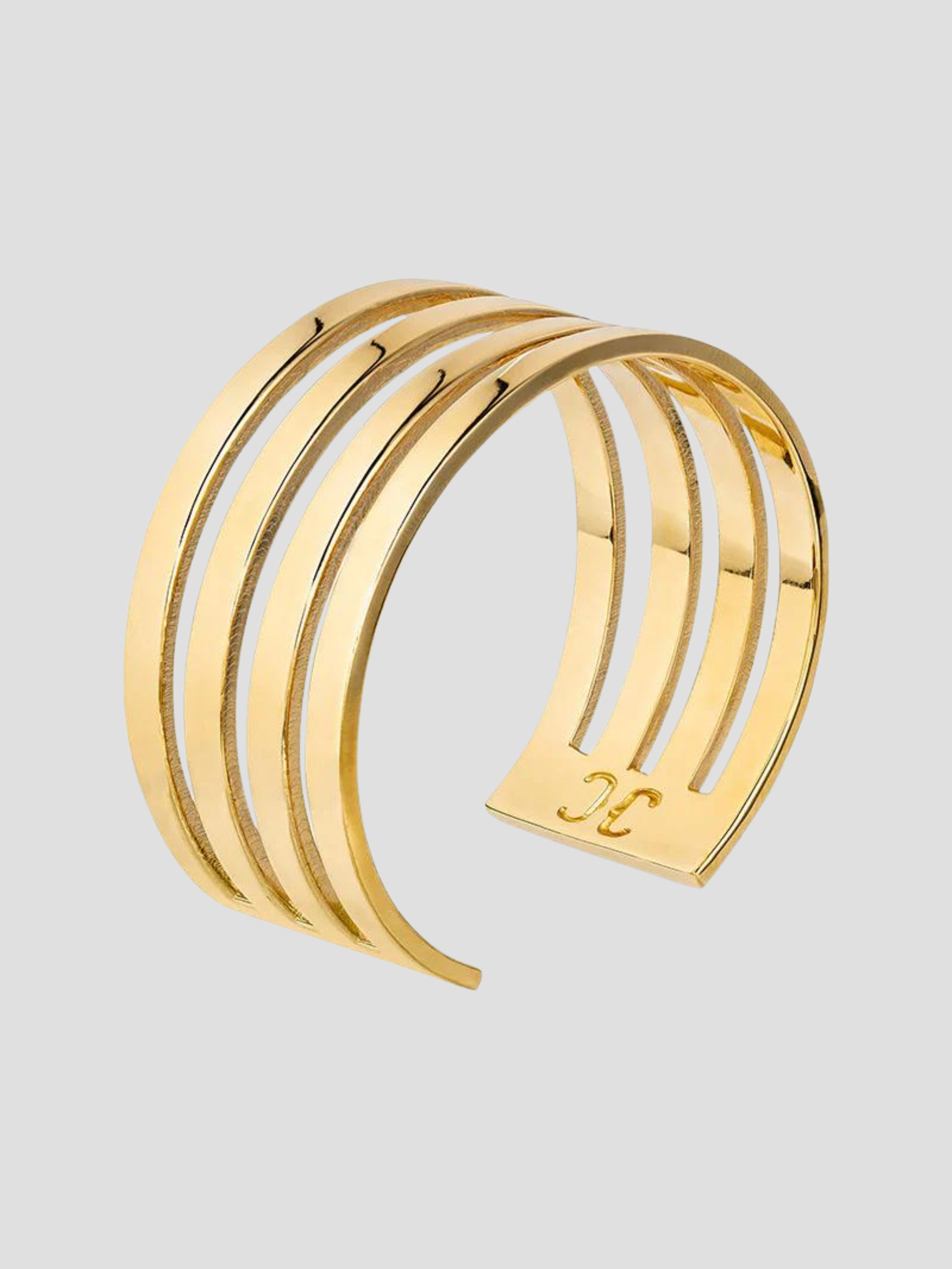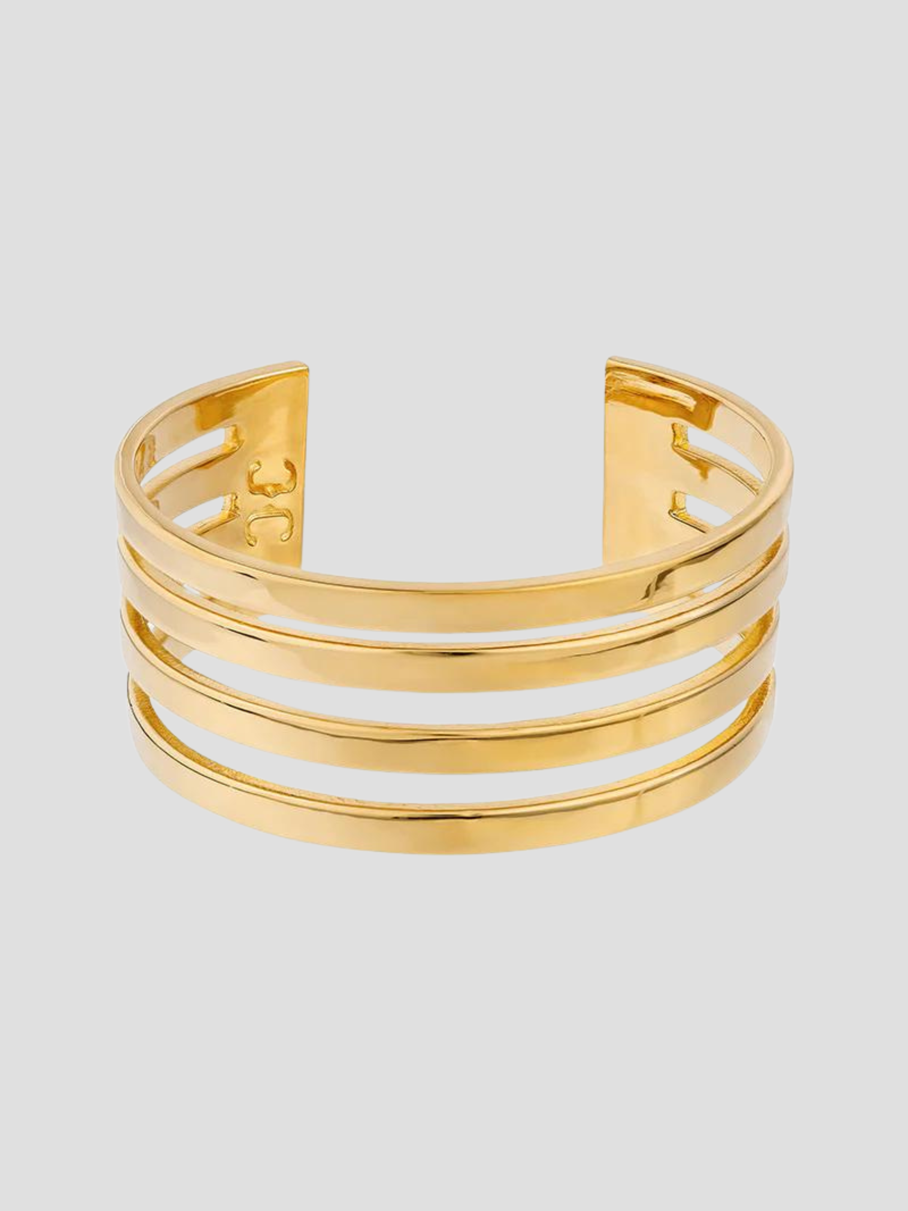Enhance your wrist game with the Line Cuff. The quadruple bar design, expertly crafted from 14k gold, adds a touch of elegance to any outfit. Perfect for styling with both casual and formal looks.