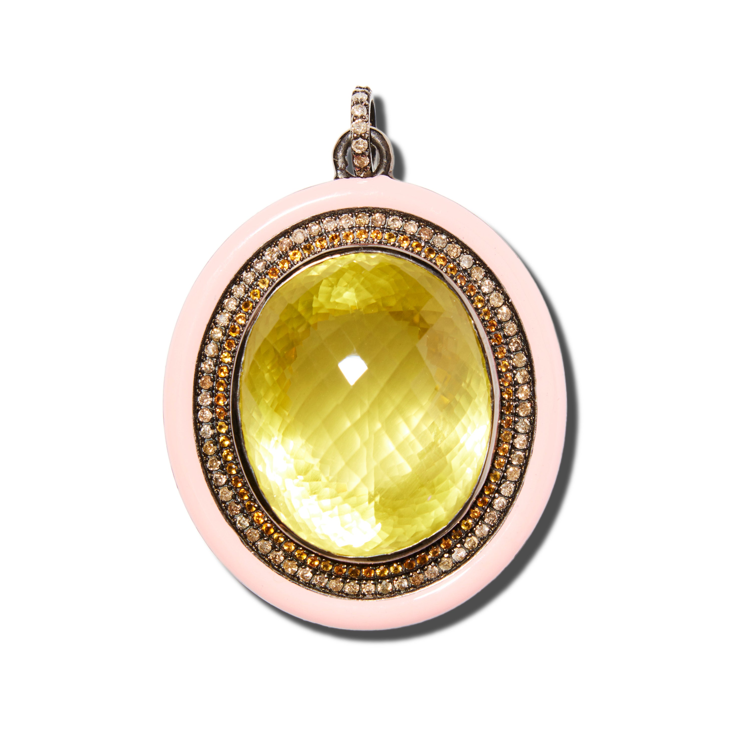 Lemon Topaz pendant lined with diamonds & yellow tourmaline cast in dusty coral enamel