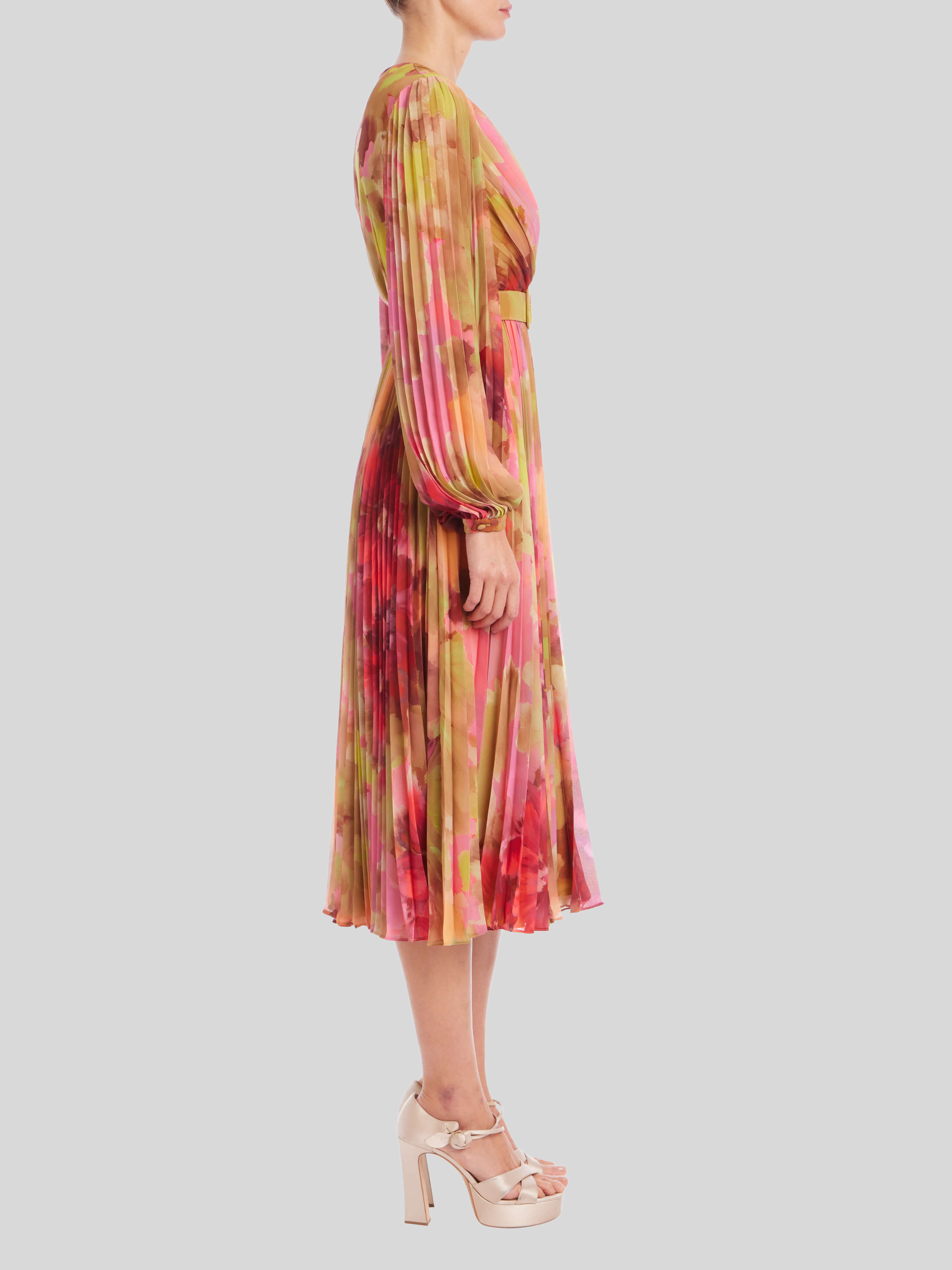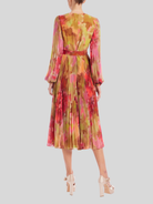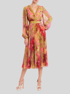 This Badgley Mischka midi dress features a flattering faux-wrap silhouette and a vibrant watercolor floral print. The pleated georgette fabric drapes beautifully, creating a sophisticated look perfect as a cocktail dress.