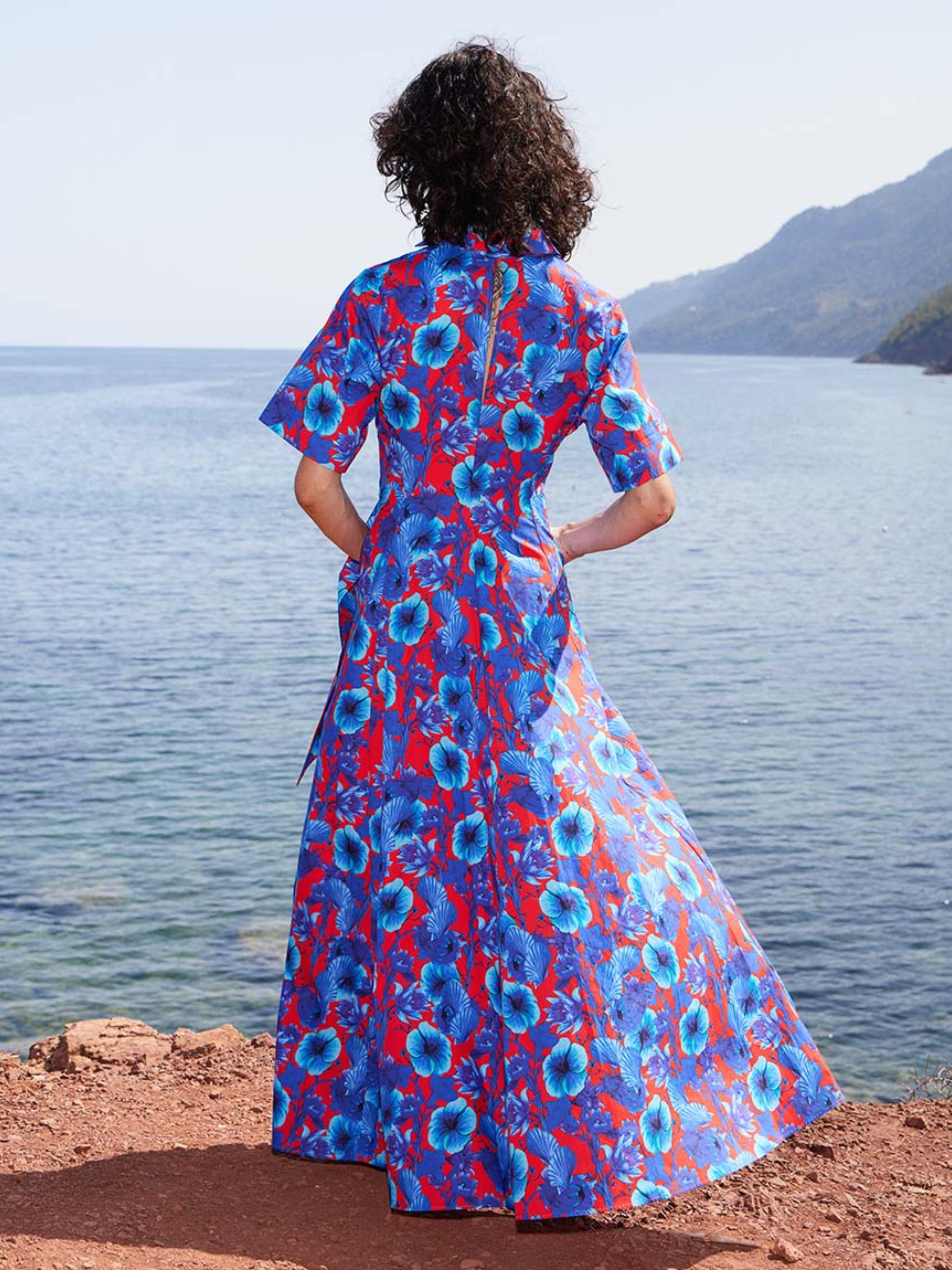 The Venus Shell print is quintessential Borgo de Nor: bold, feminine, and steeped in storytelling. Featuring an electrifying red and blue palette, this otherworldly design draws inspiration from the book Pasión del Tiempo by Salvadoran poet David Escobar Galindo, brought to life through surrealist illustrations by artists Benjamin Saul and Benjamin Canal. Mystical and evocative, the print dances between dream and reality—its swirling shells and celestial florals conjuring a world both fantastical and deeply feminine. Perfect for high summer, the vibrant color combination ensures you’ll turn heads wherever the sun finds you—whether on coastal promenades or city terraces at golden hour.