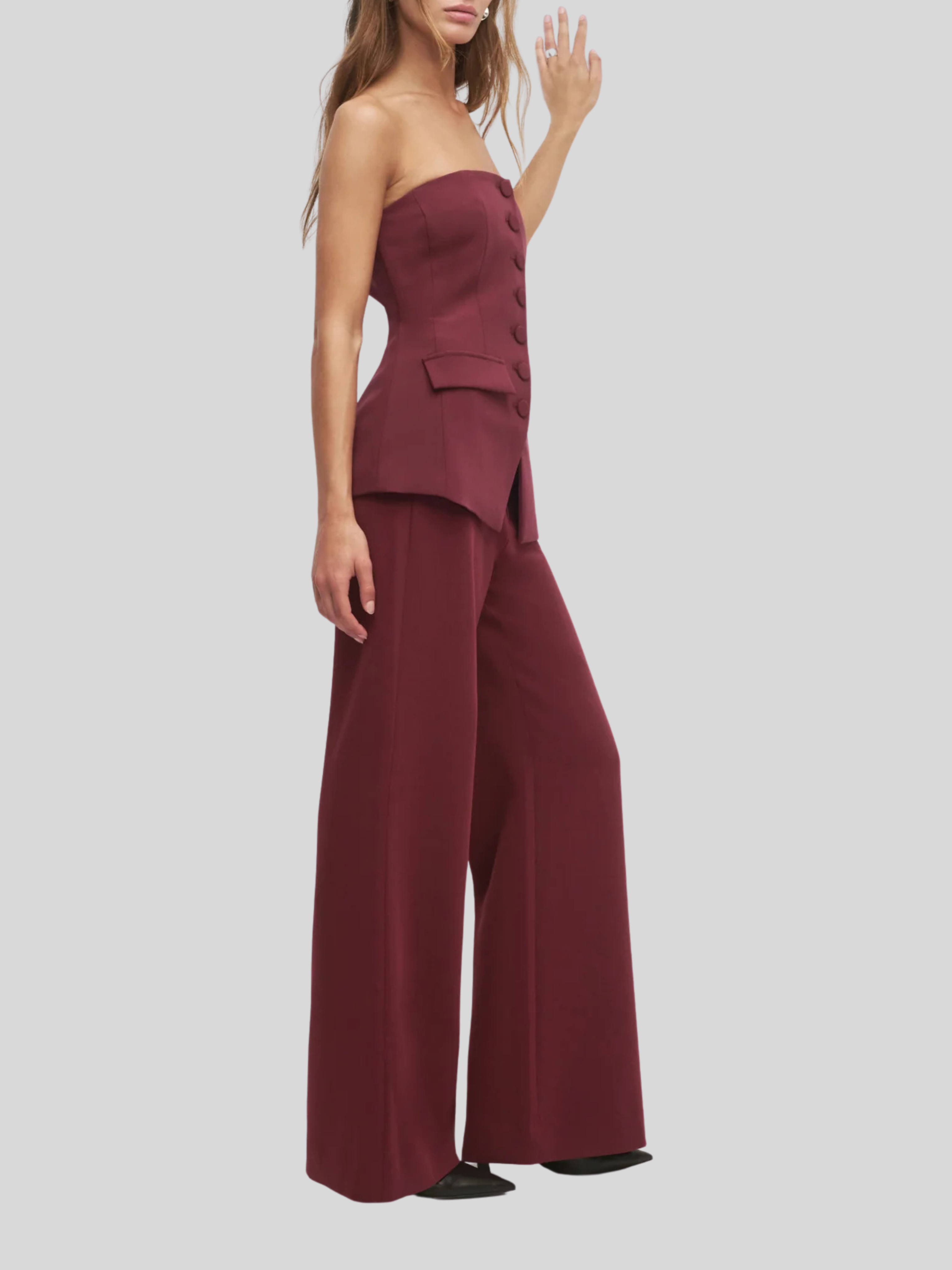 Borrowed from the boys, this bustier in a structured suiting blend Vino has classic menswear styling--structured shape, front buttons, and front flap pockets (plus, a comfortable elastic back!). The Dream Phoebe Bustier looks especially sharp paired with your favorite denim or styled as a set with The Jones Pant