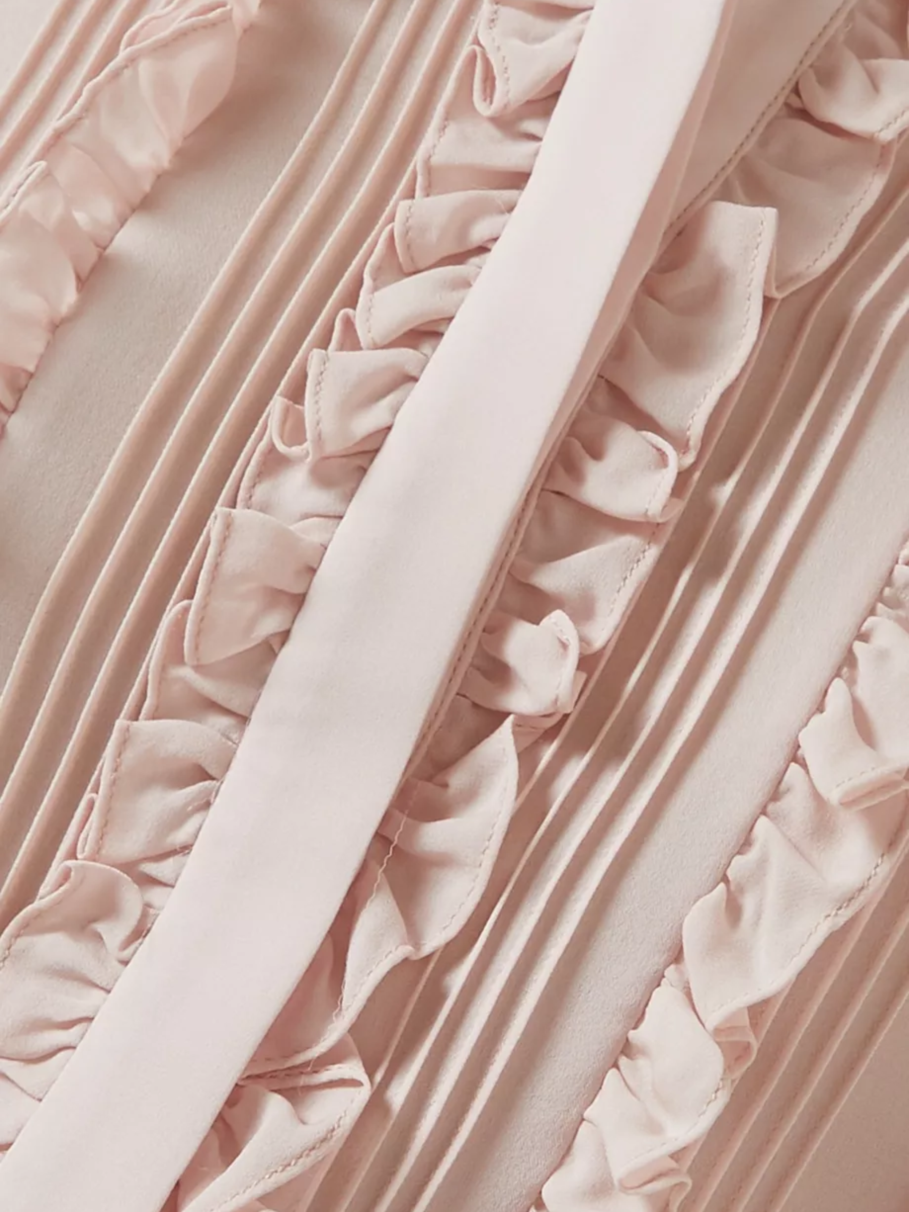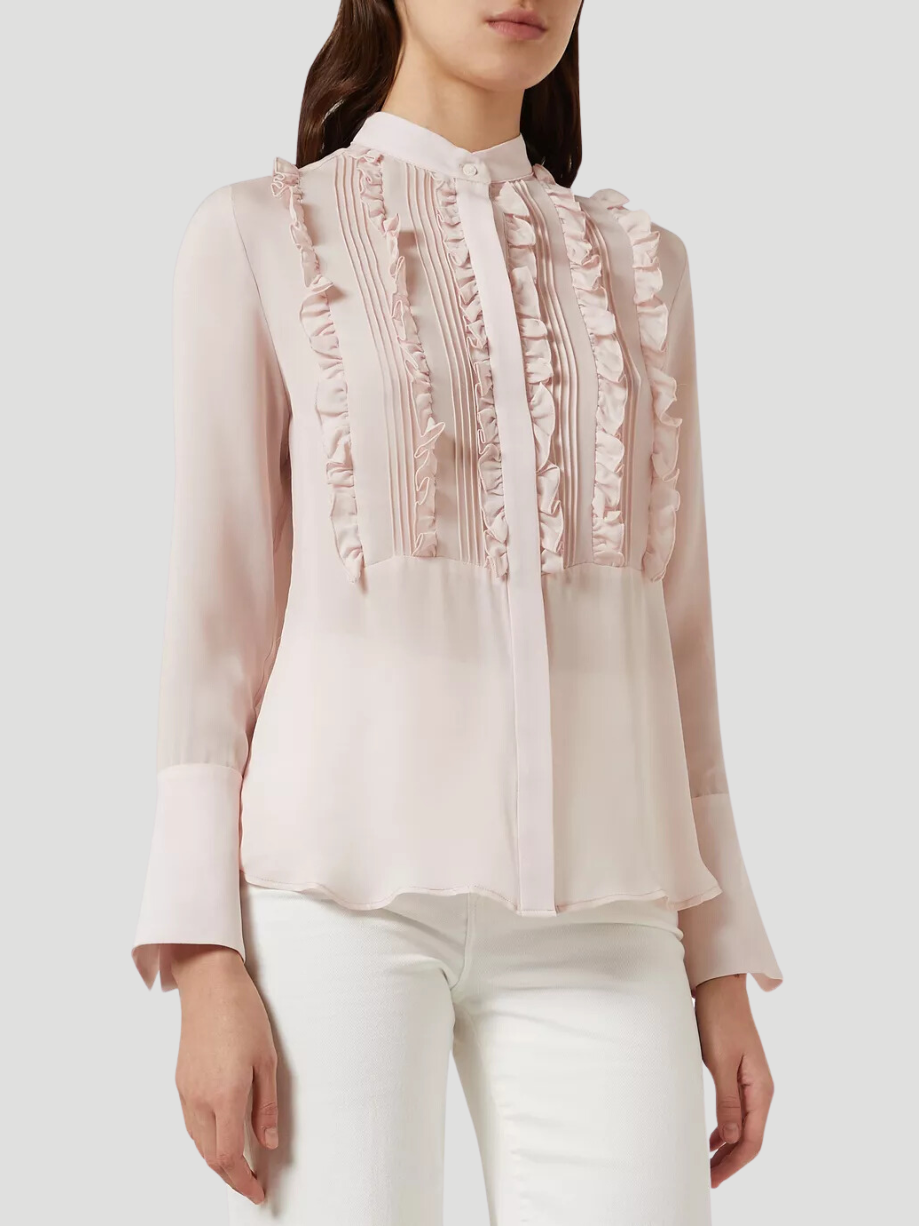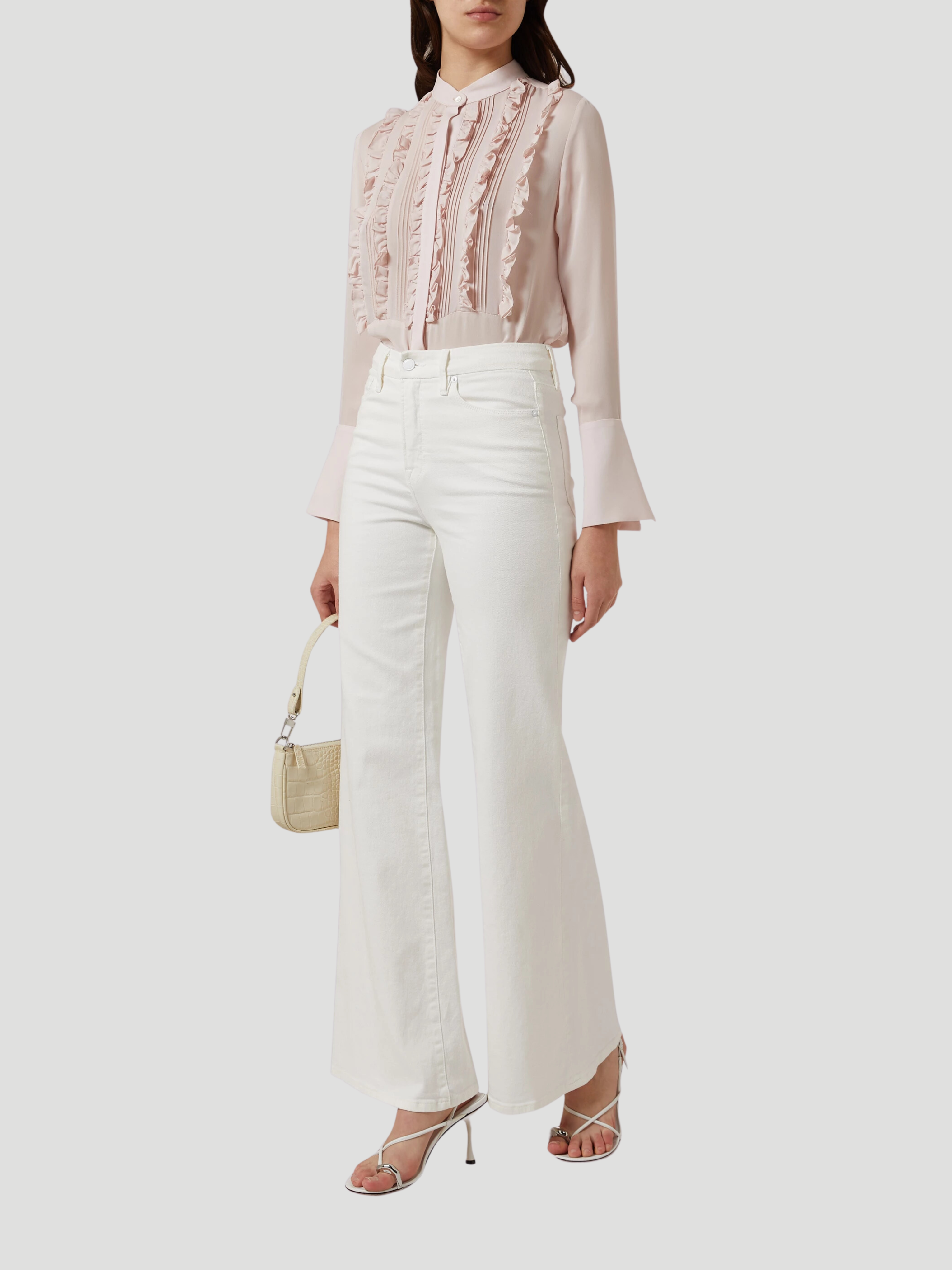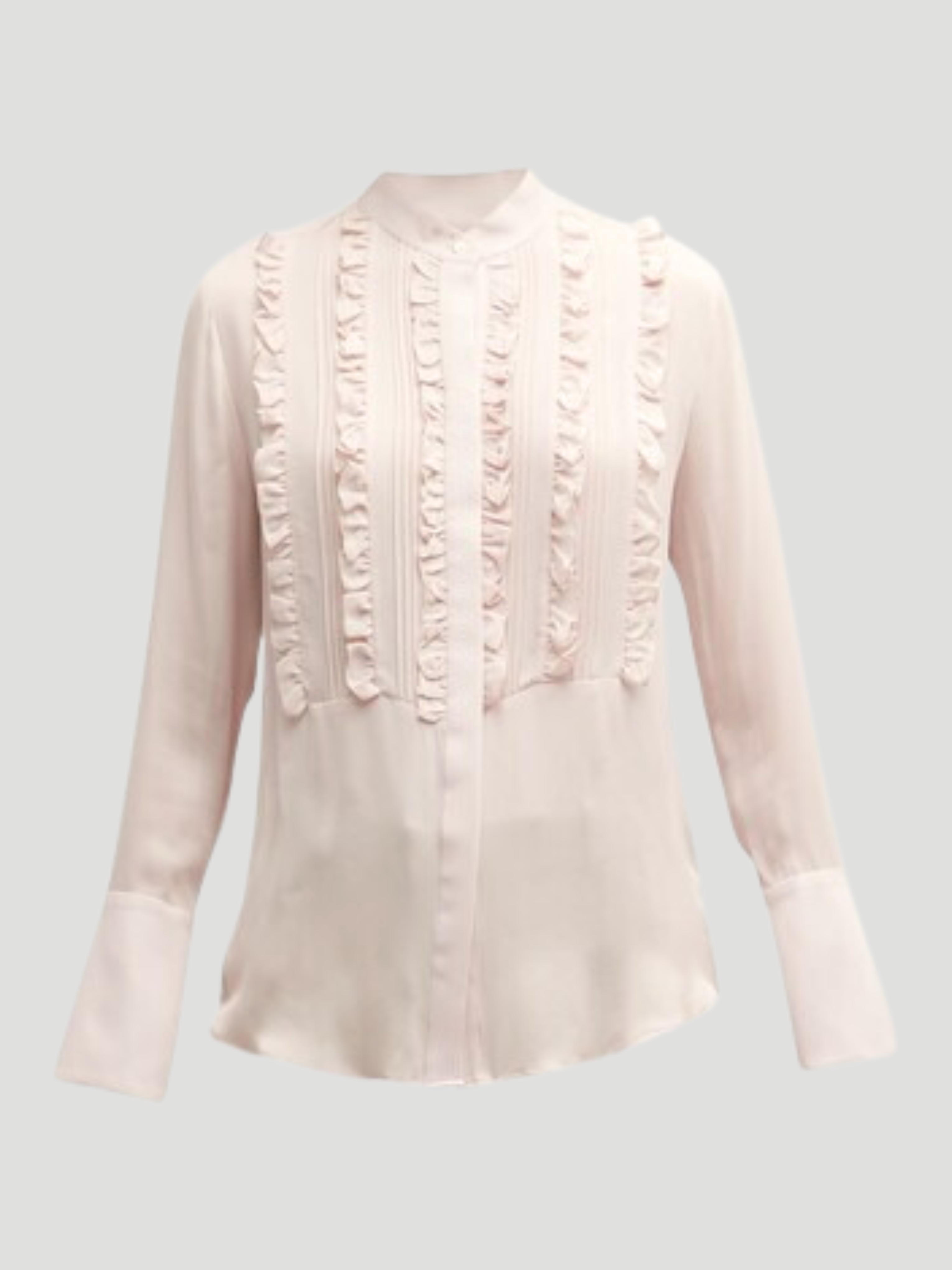 Indulge in the delicate femininity and elegance of TWP's Kimmie Silk Ruffled Shirt. Adorned with delicate ruffles and crafted from sheer fabric, this blouse exudes sophistication and allure. Perfect for any occasion, dress it up or down for a timeless and flawless look.