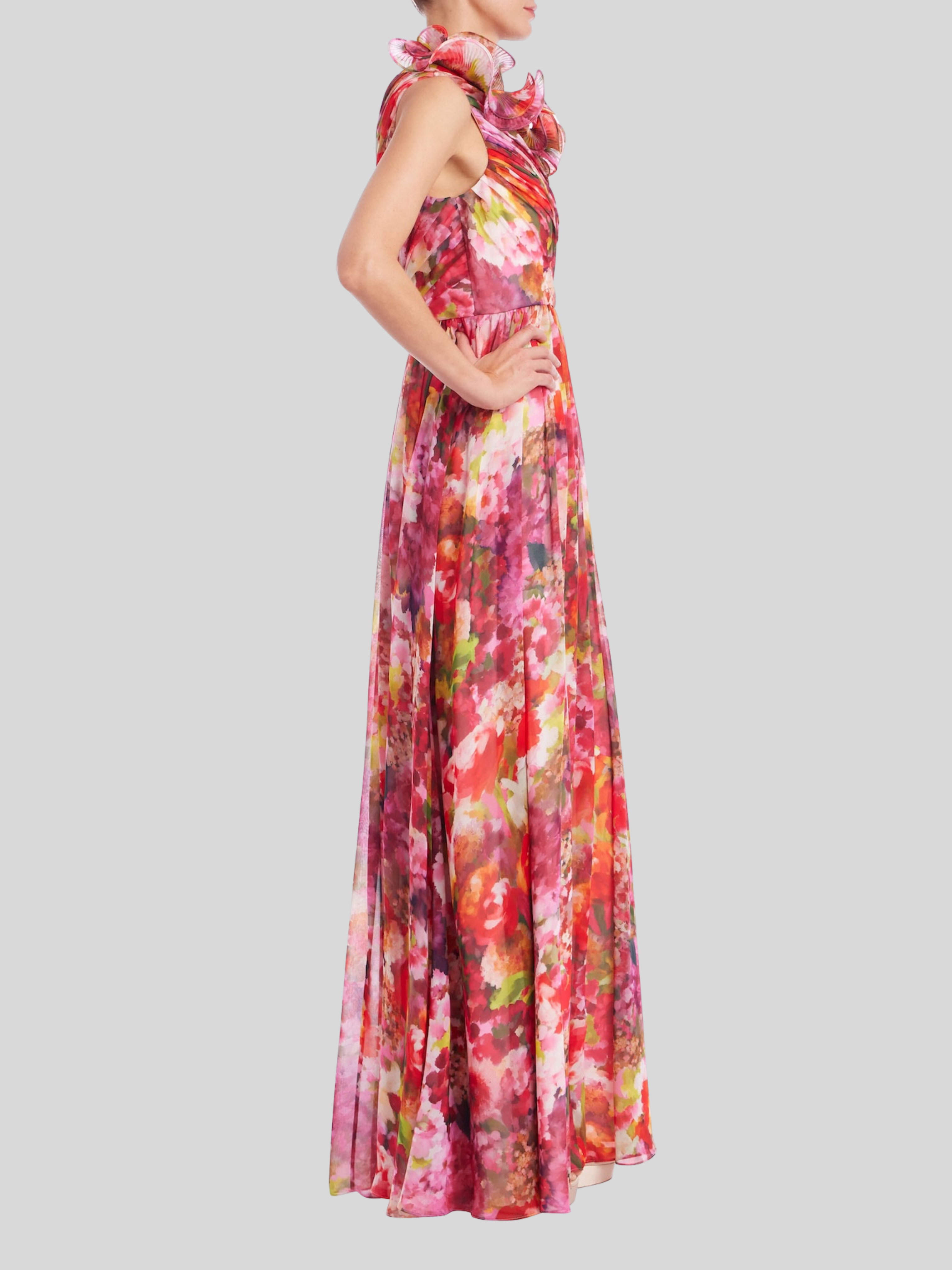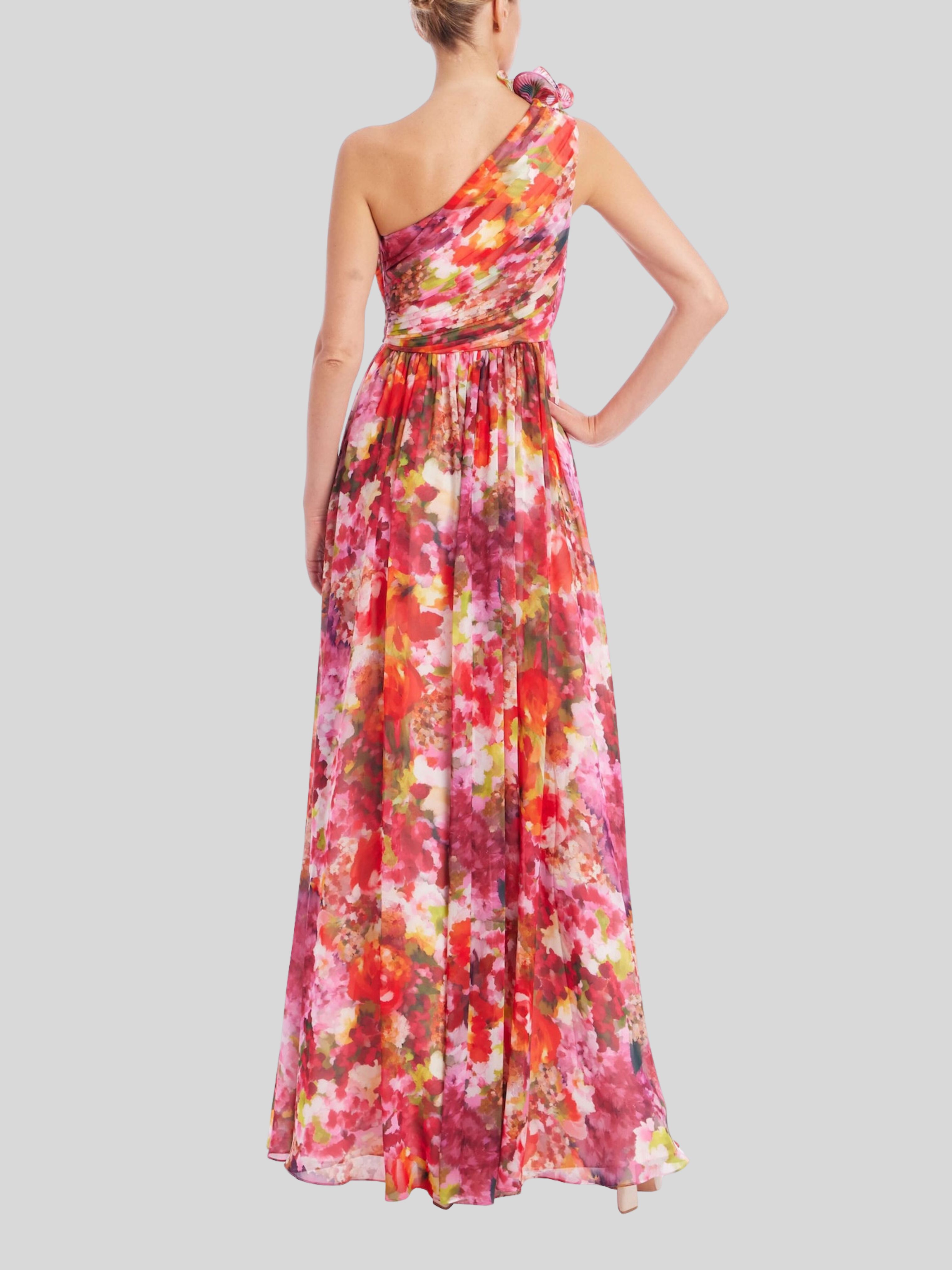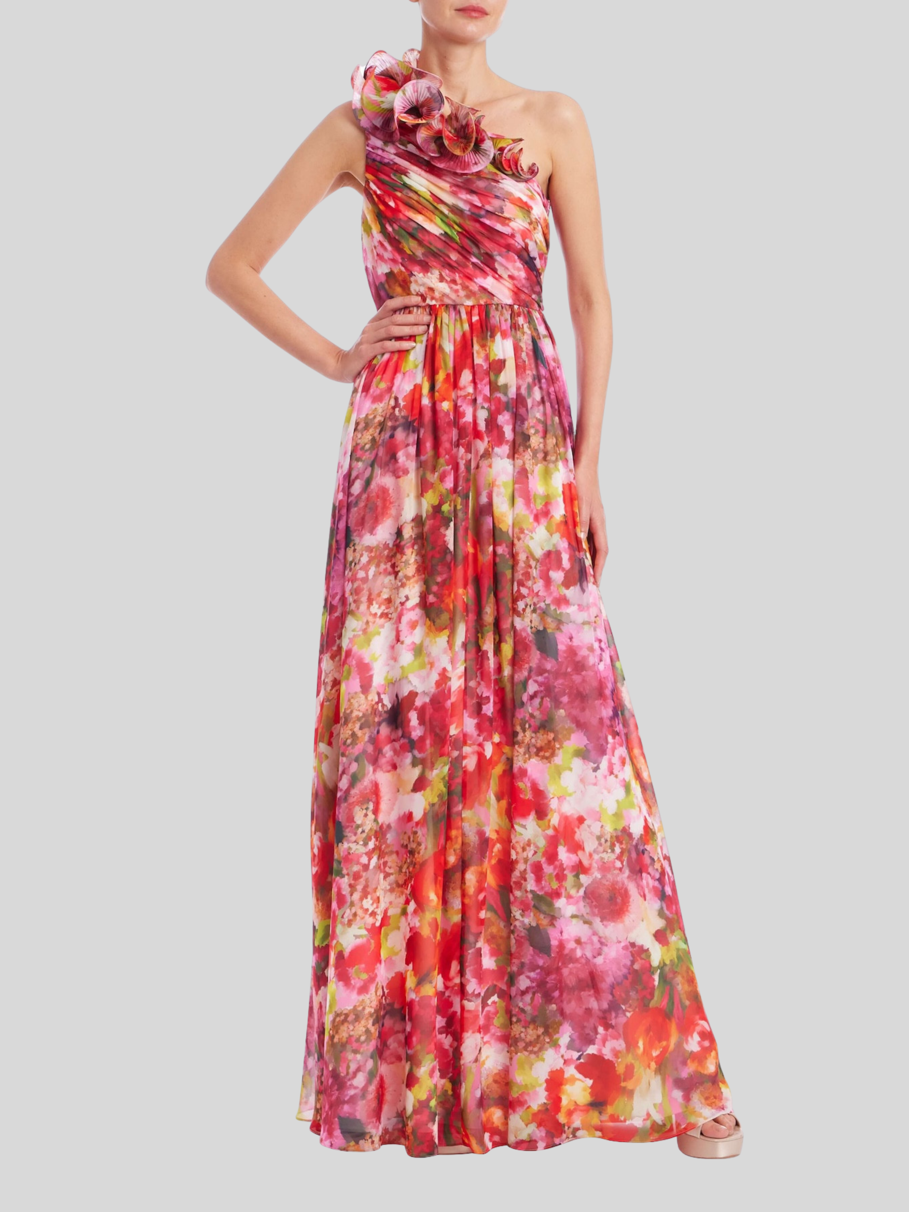 The Badgley Mischka One-Shoulder Ruffle Floral Print Gown is a stunning choice for your next black-tie event. Crafted from lightweight georgette fabric, this maxi length evening gown features a vibrant burst of color watercolor floral print. The strapless, one-shoulder design is elevated by a dramatic 3D rosette ruffle trim. Flattering pleated bodice detailing completes this elegant, sleeveless silhouette. Perfect for making a statement.