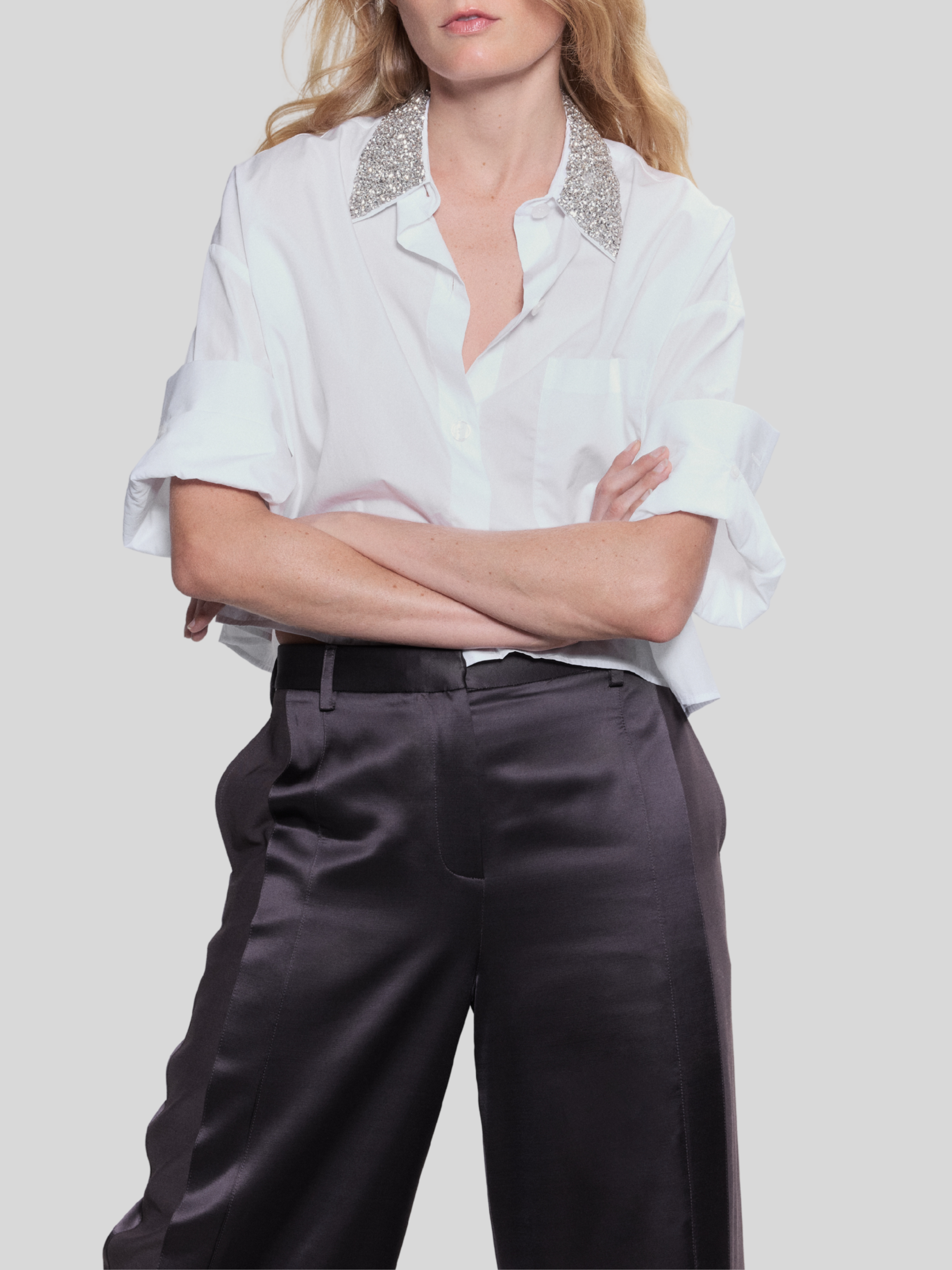 TWP’s signature short sleeve button down is crafted in superfine Italian cotton shirting and embellished with a sparkling prong set crystal collar. The Next Ex is a cropped, boxy silhouette complete with a chest patch pocket, button up placket, spread collar, and signature double roll button cuffs.