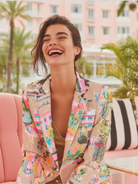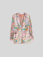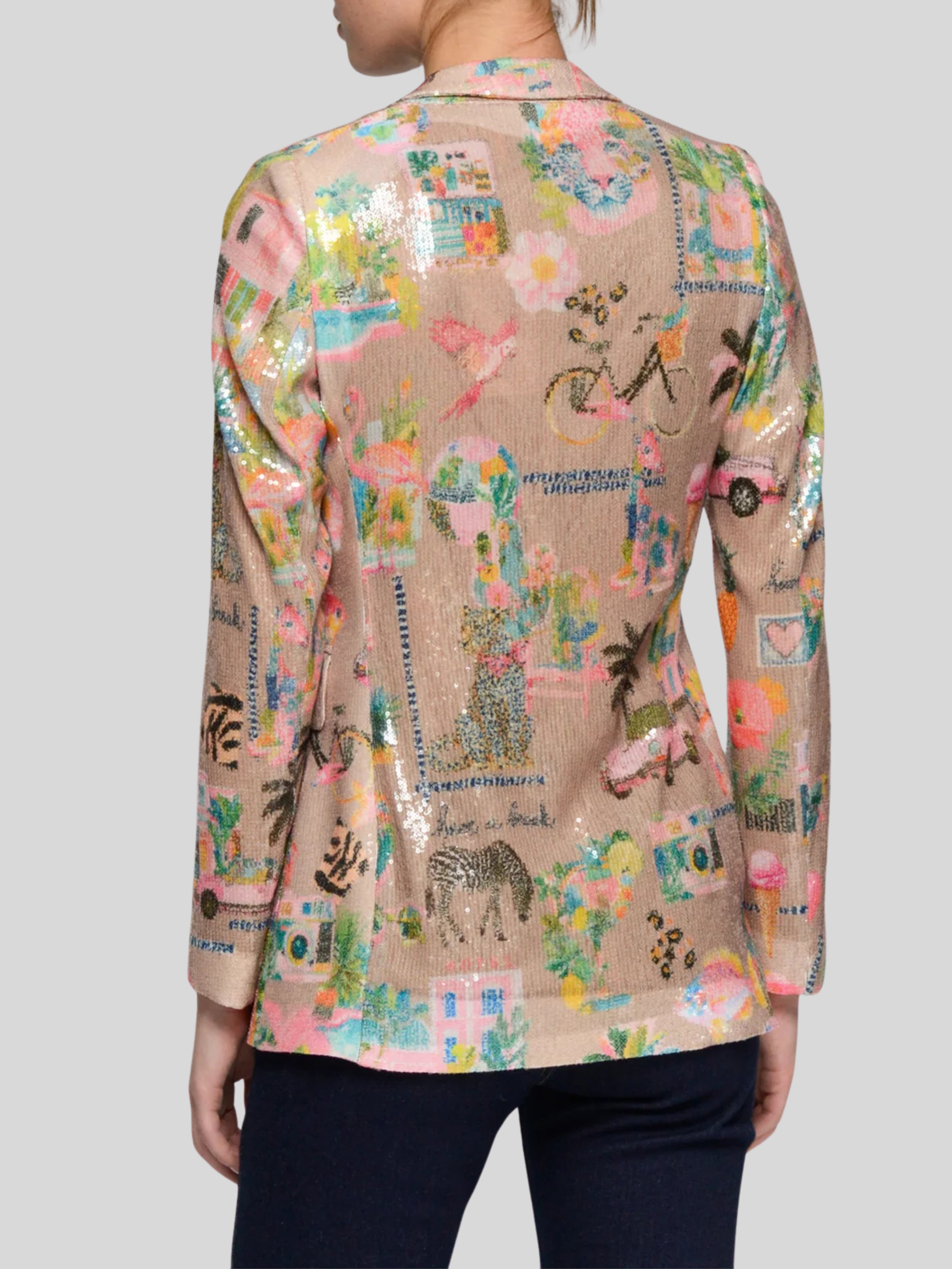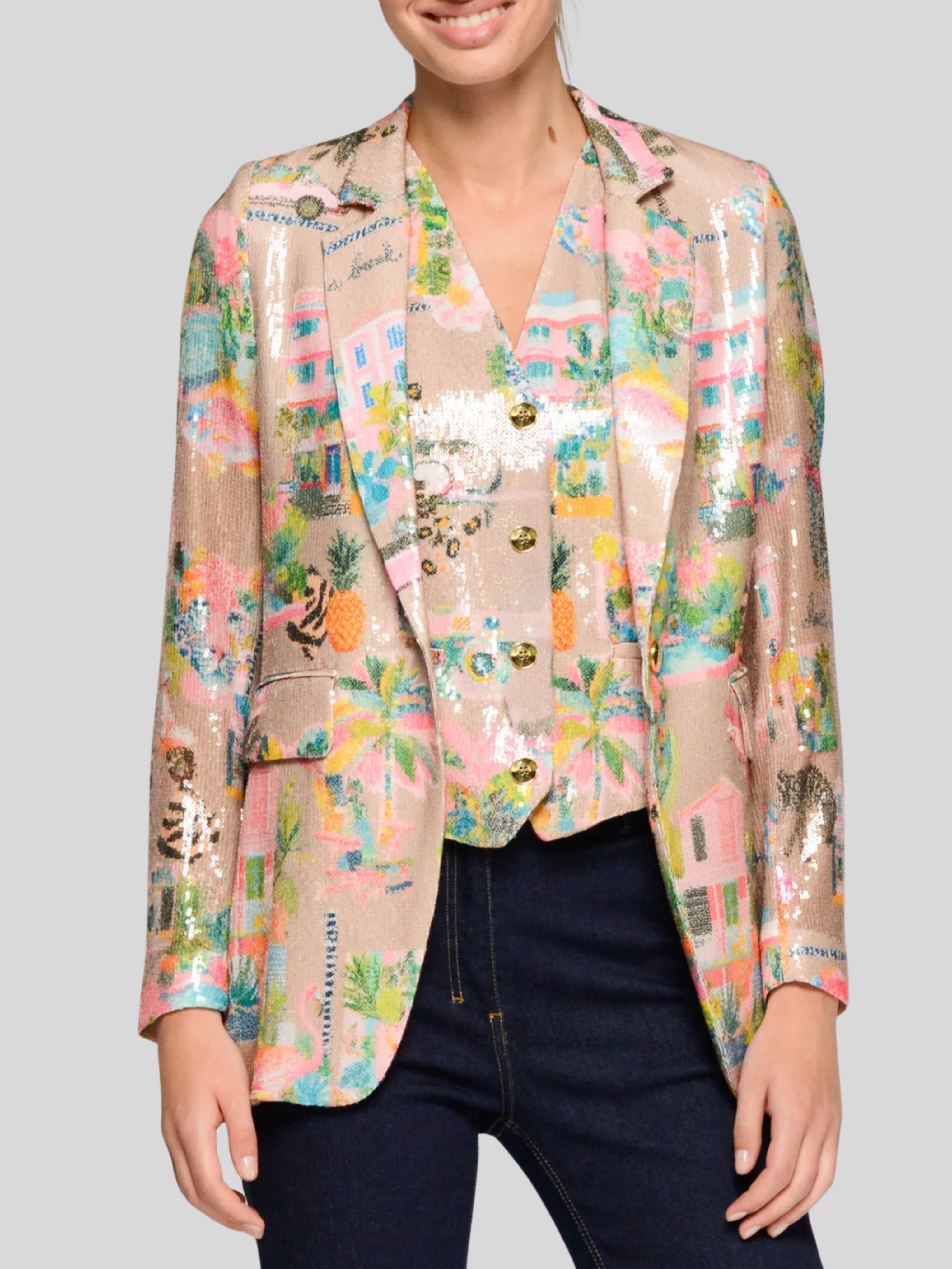 Multicolored California print sequin jacket on a beige background. Design with classic lapels and gold button front closure. Buttons with flaps at the front.