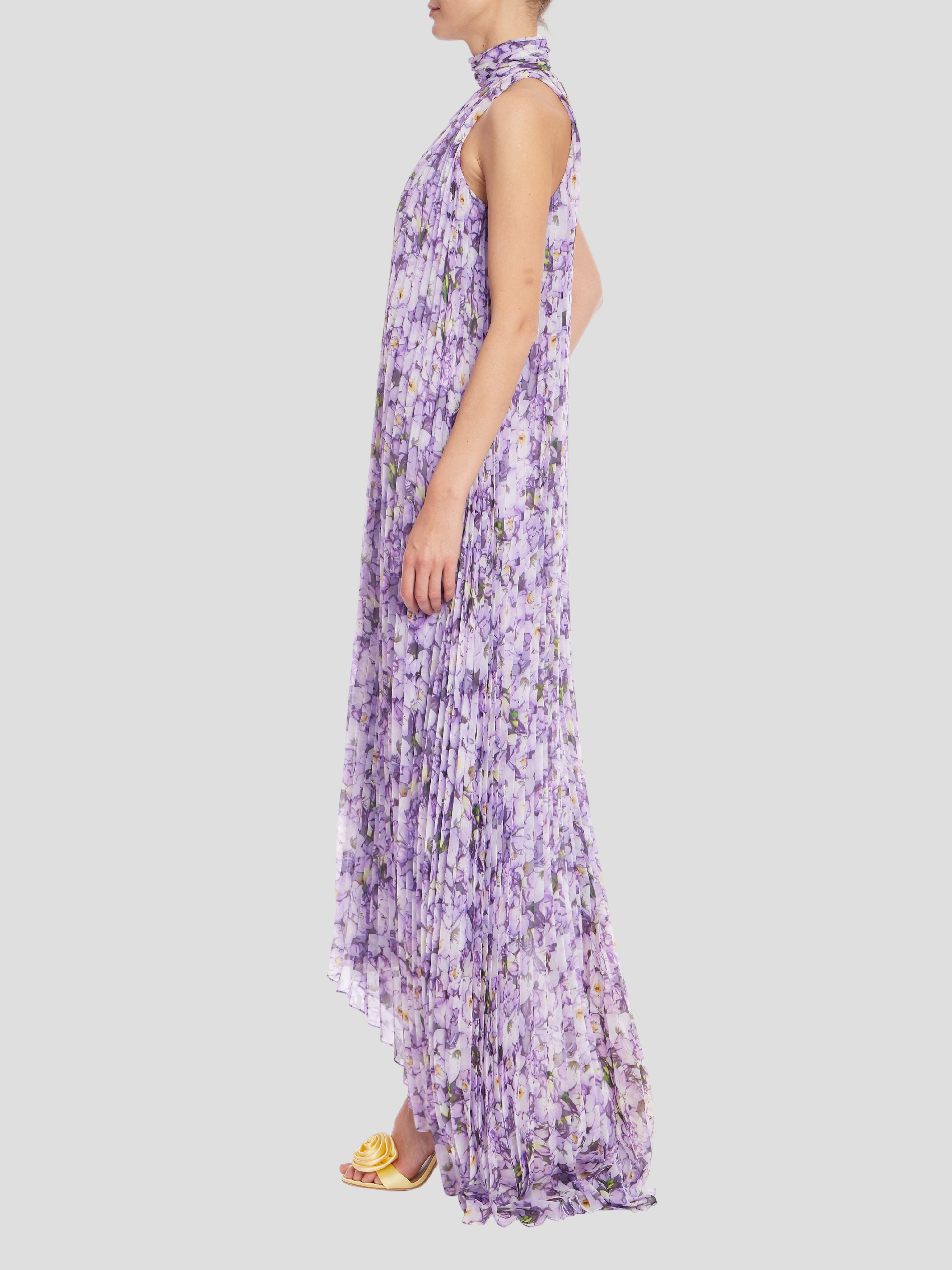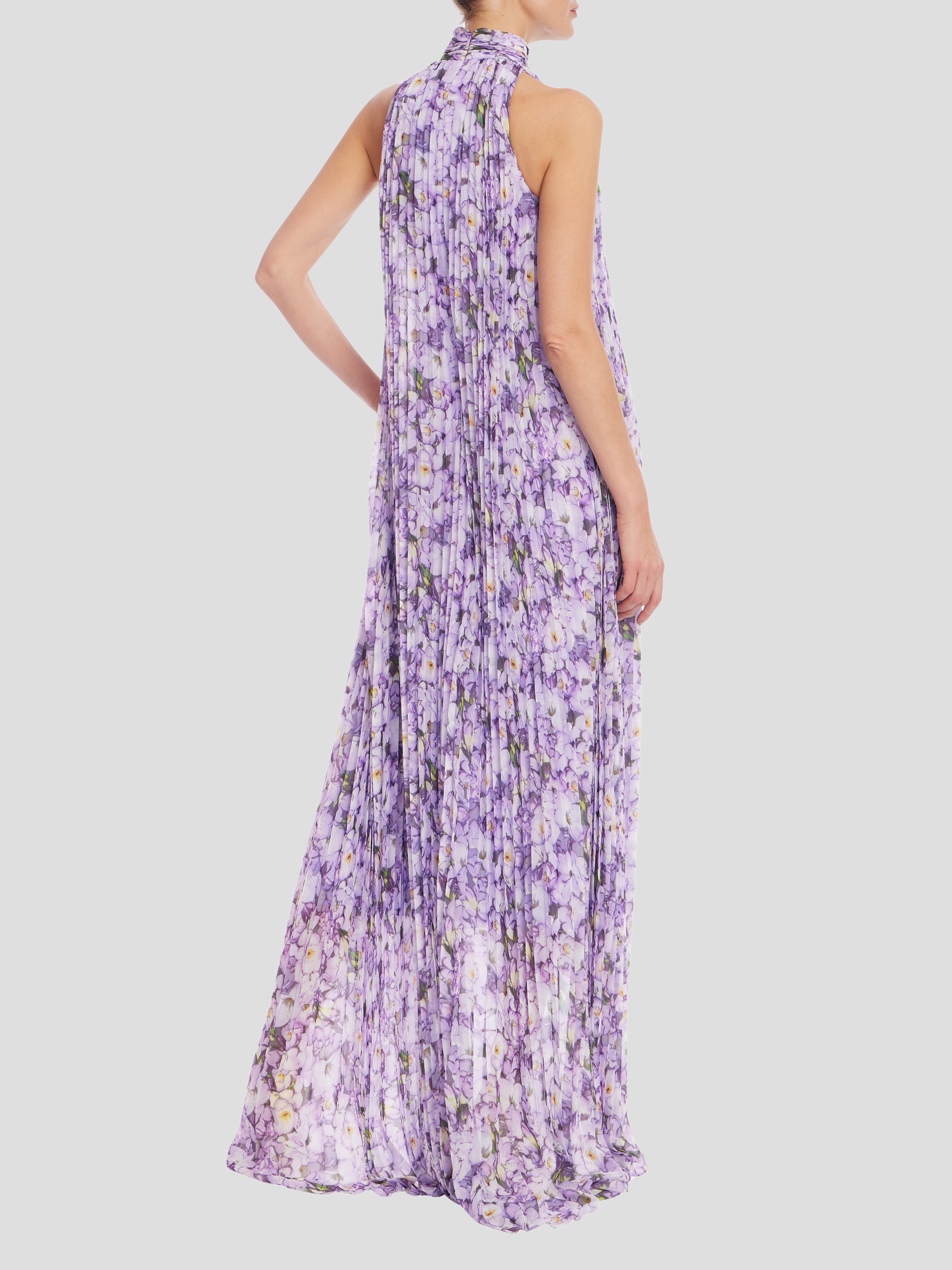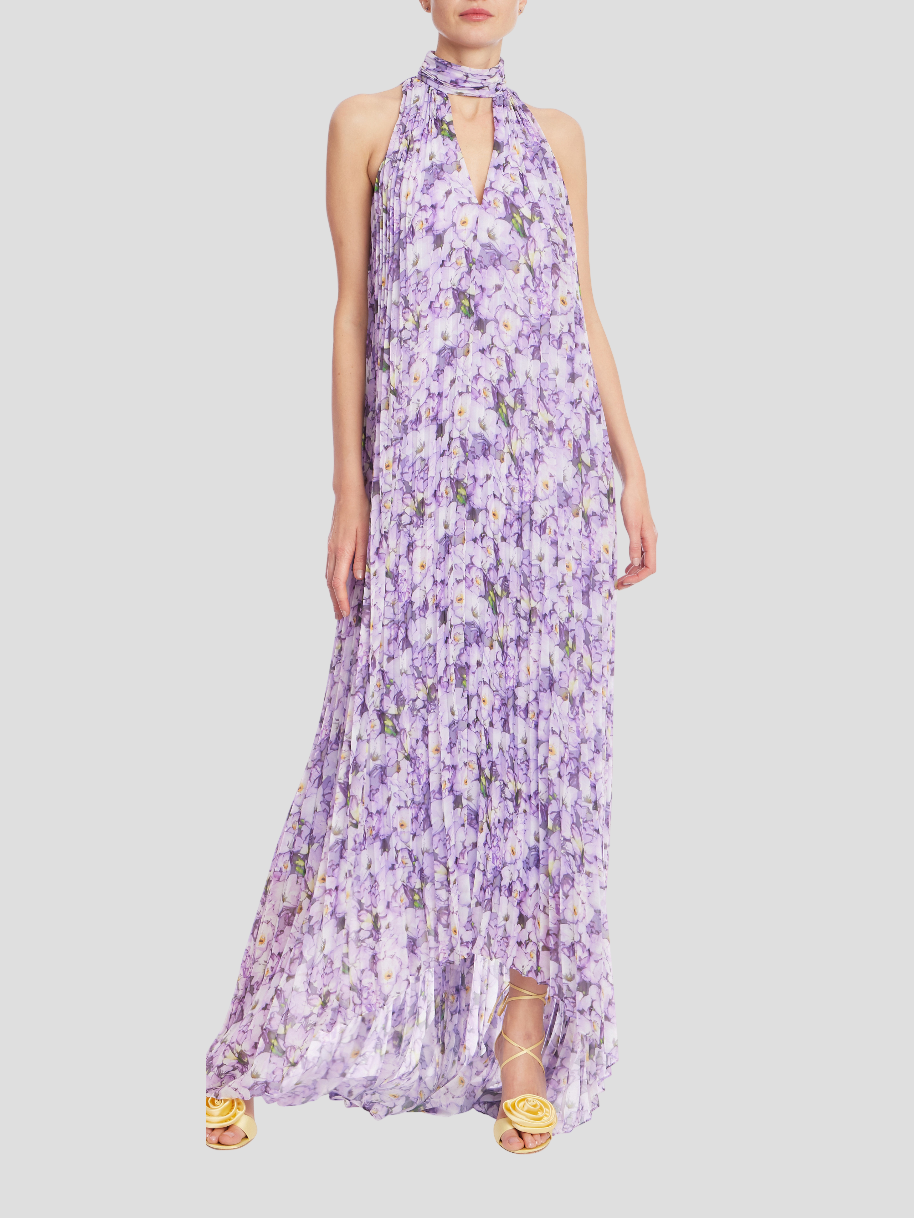 The airy, pleated georgette fabric is cut in a sleeveless, flowy silhouette that moves with you. The halter neckline ties at the neck with a soft keyhole detail, and that laid-back shape drapes into a high-low hemline that sways with every step. Then there’s the all-over lilac waterlily print, pulling it all together with a garden-fresh, spring-ready edge.