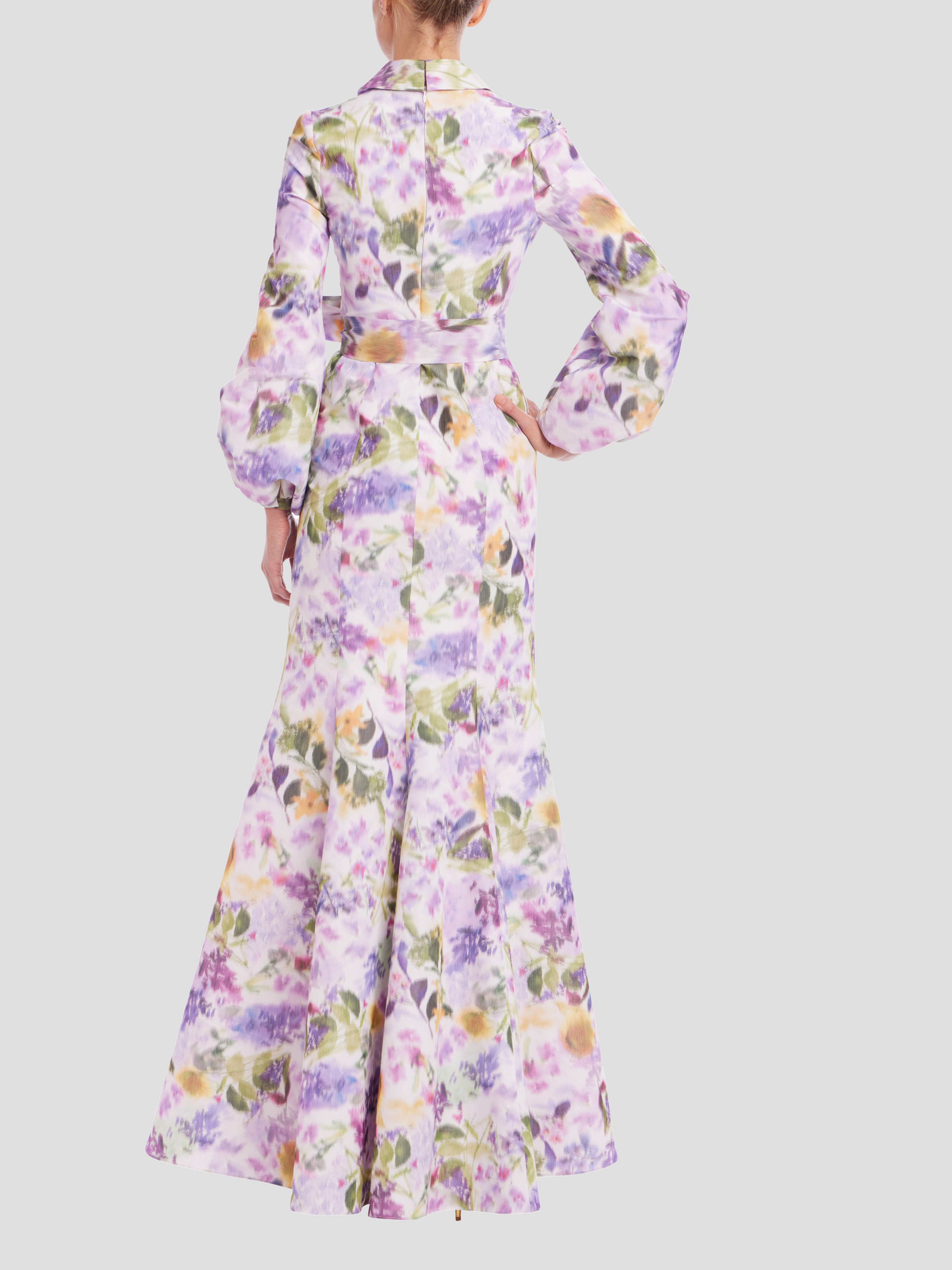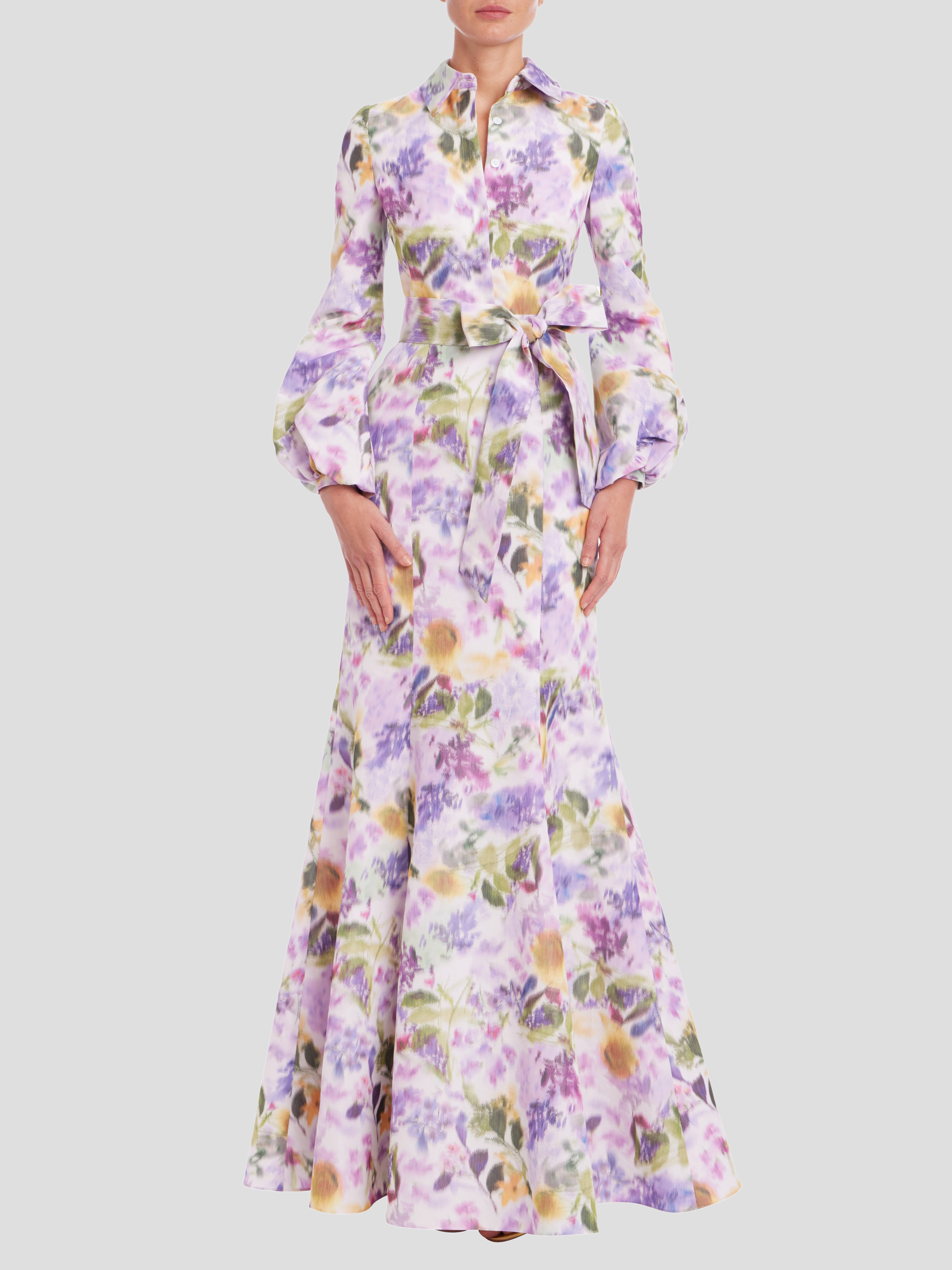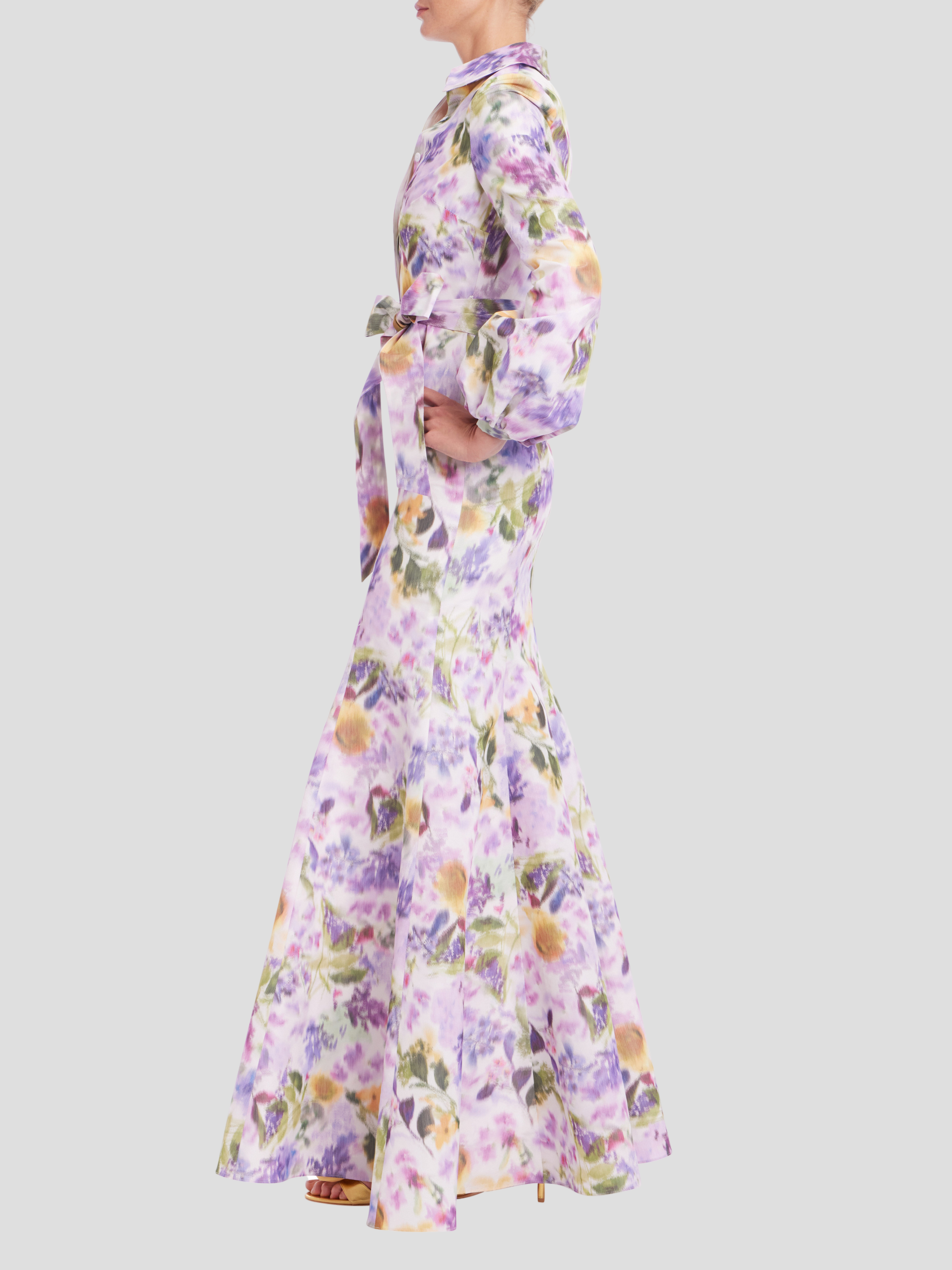The crisp-yet-soft feel comes from the silkomo taffeta, skimming all the way down to a graceful, full-length finish. The sharp shirt collar and button-down front keep it structured, while those billowy long sleeves with gathered cuffs play perfectly with the easy, flared sweep of the mermaid skirt. Then there’s the wide, waist-cinching self-tie belt that brings the whole thing together and makes you feel put-together without trying too hard.