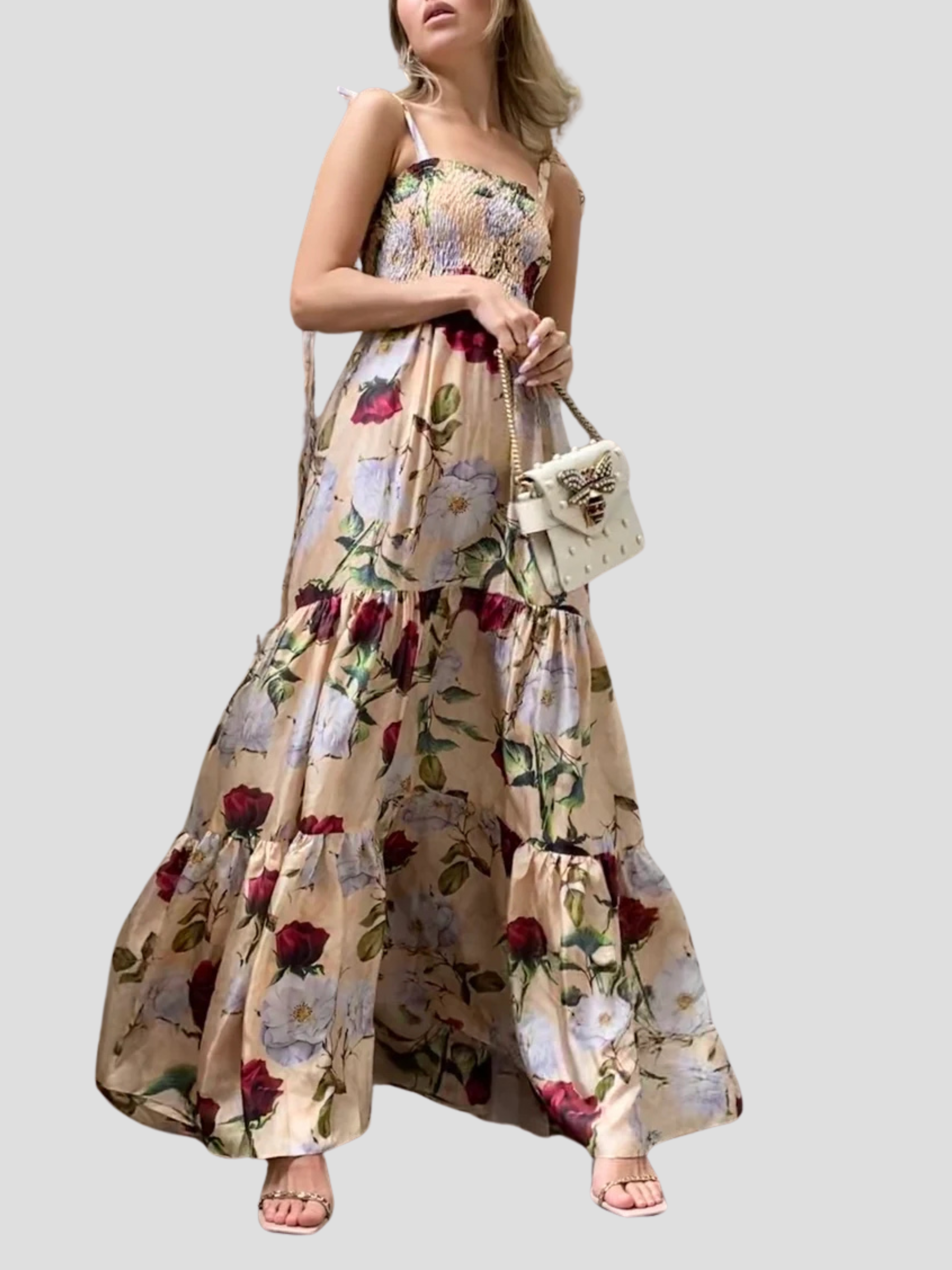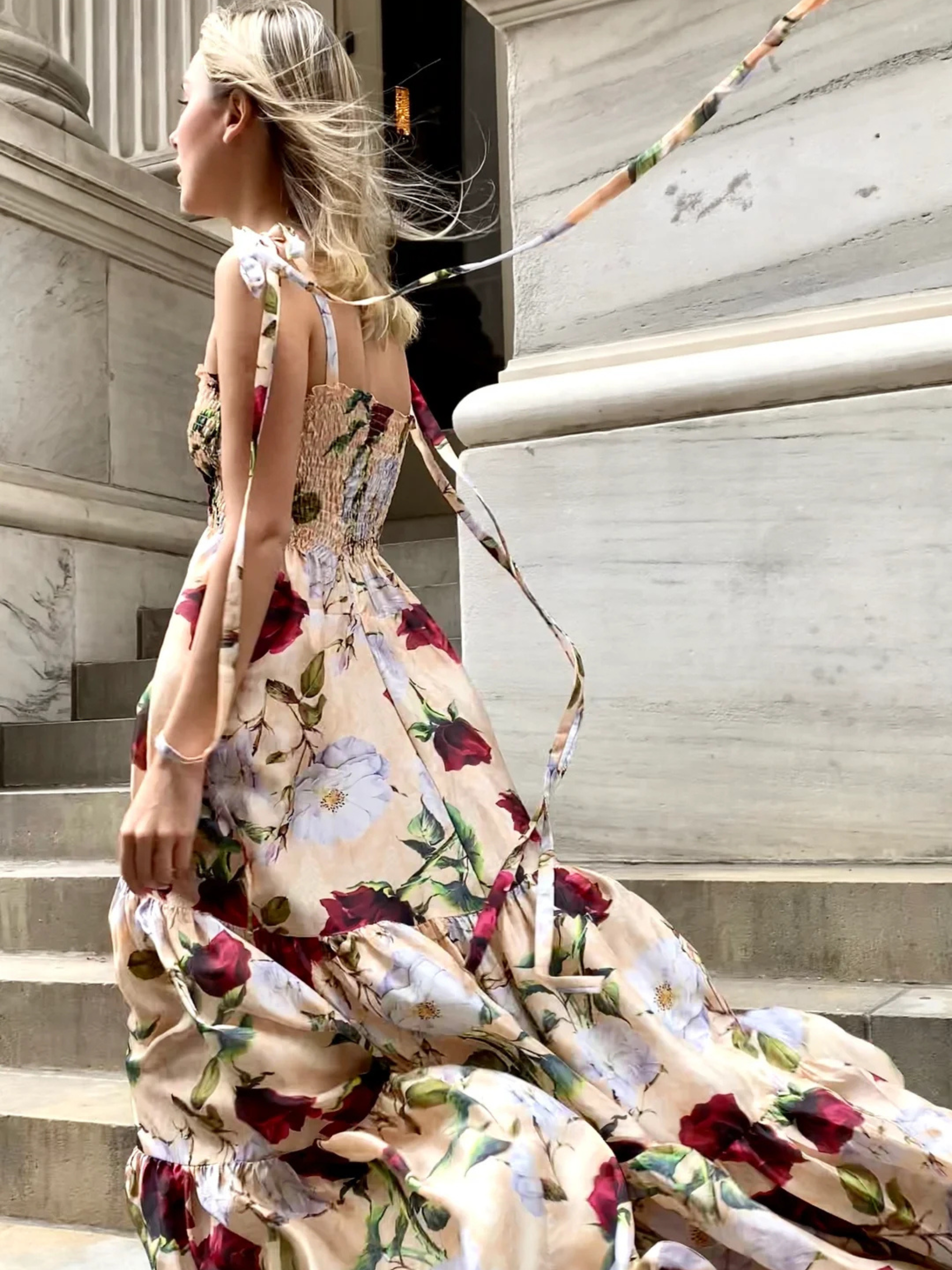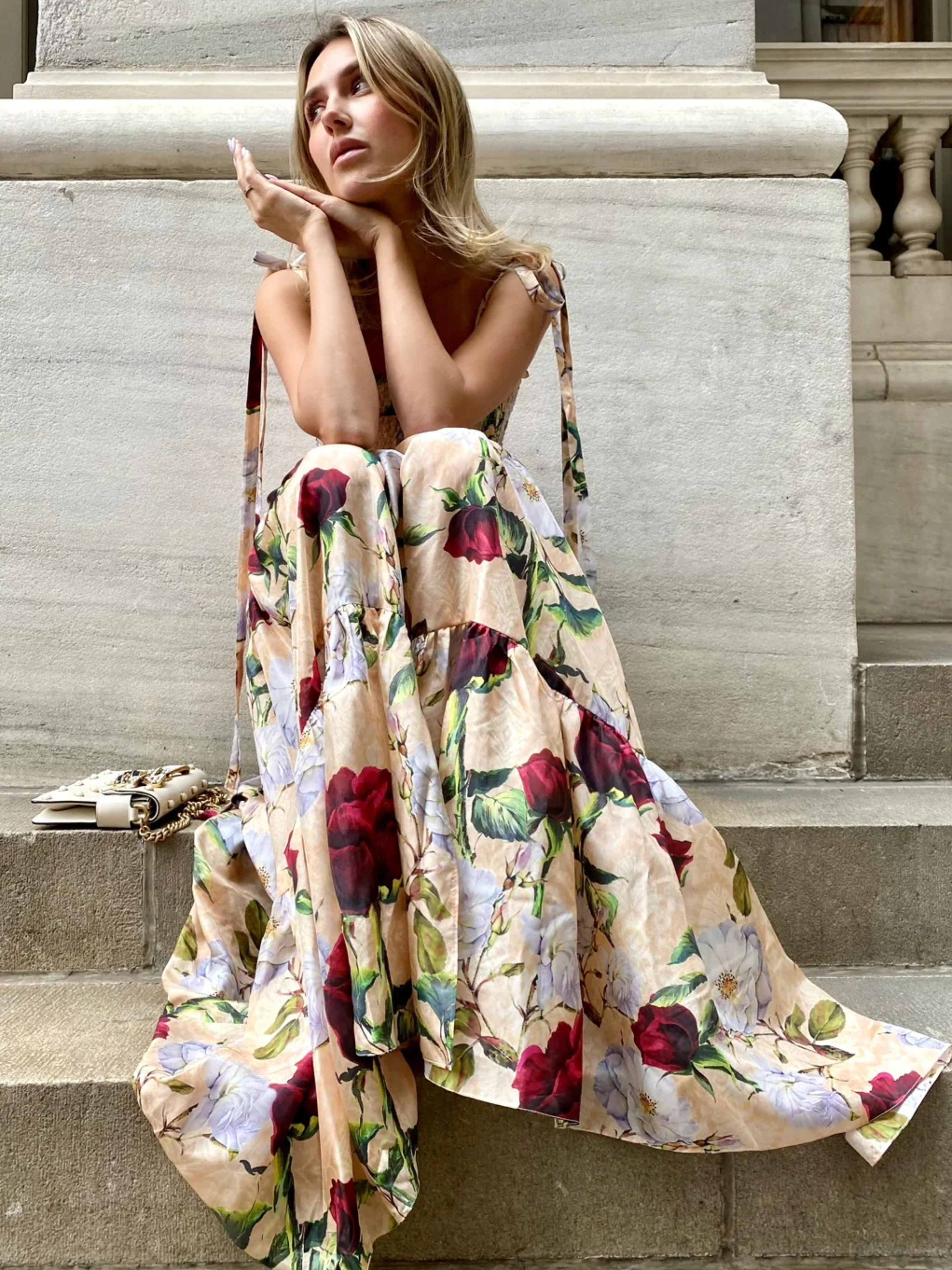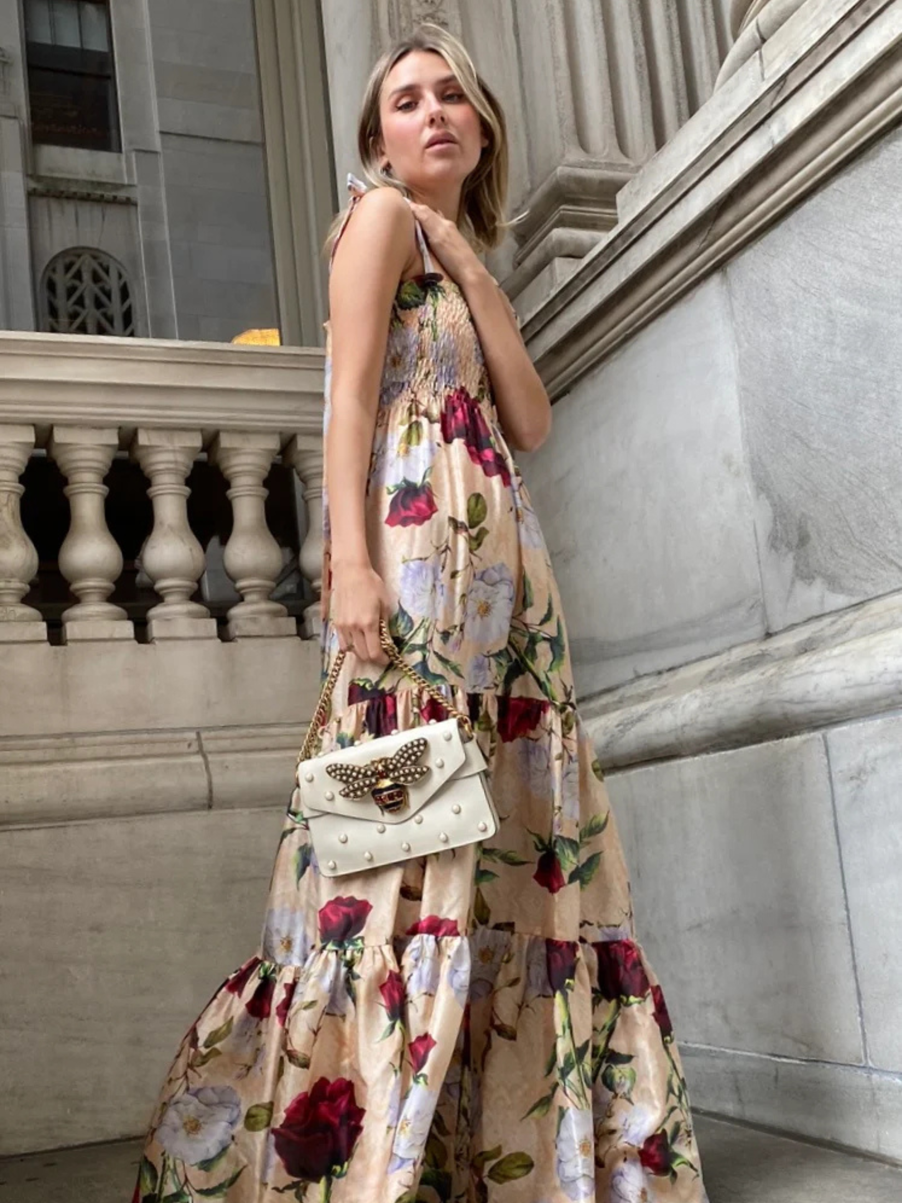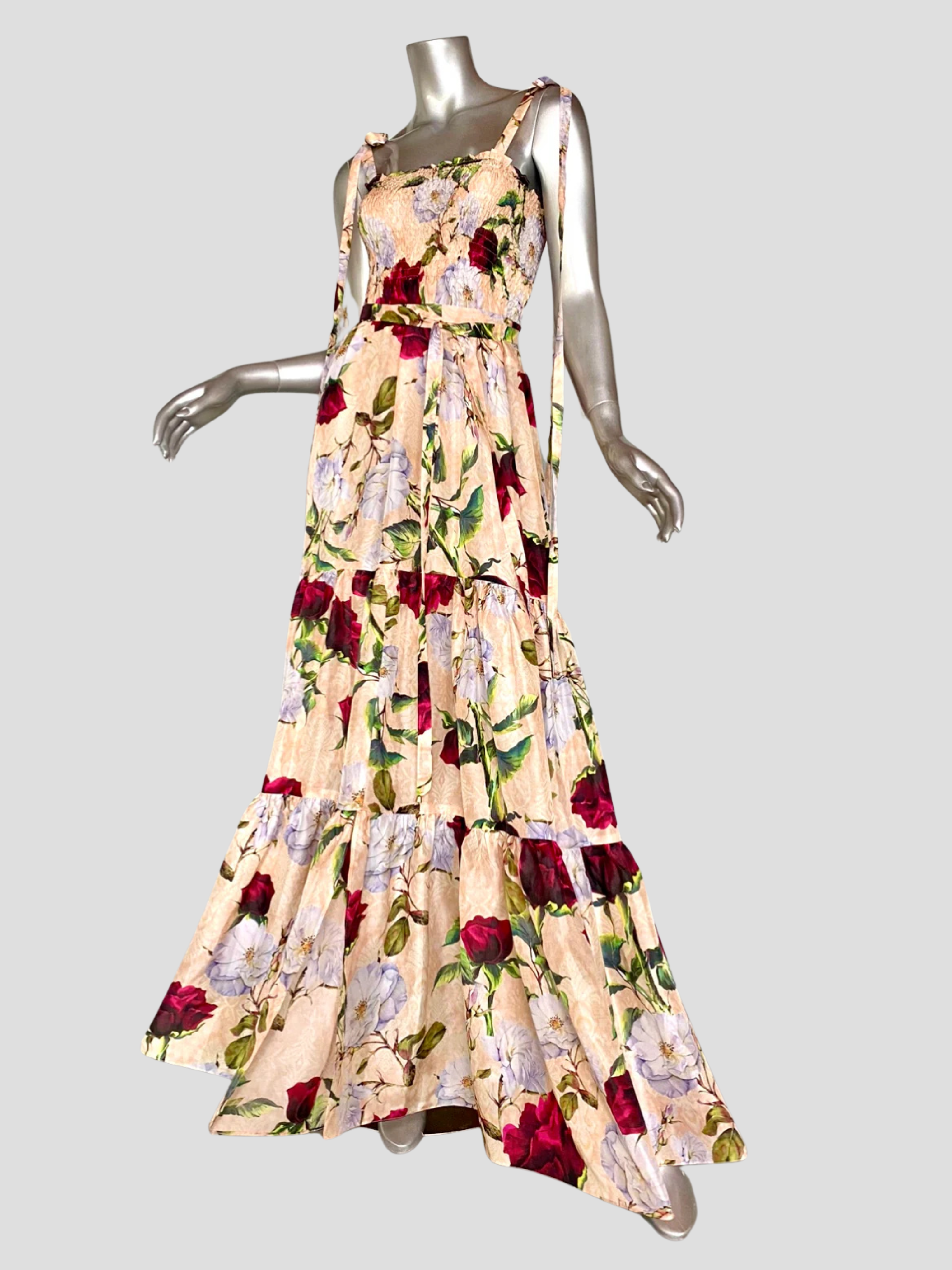 This light weight Silk maxi is the perfect effortless cic Summer piece. The dress has an easy fit , due its smocked top with adjustable ties and tiered full skirt. The light as air dress is perfect for your travels and can be enjoyed for seasons to come . This dress comes with a desperate slim self belt.