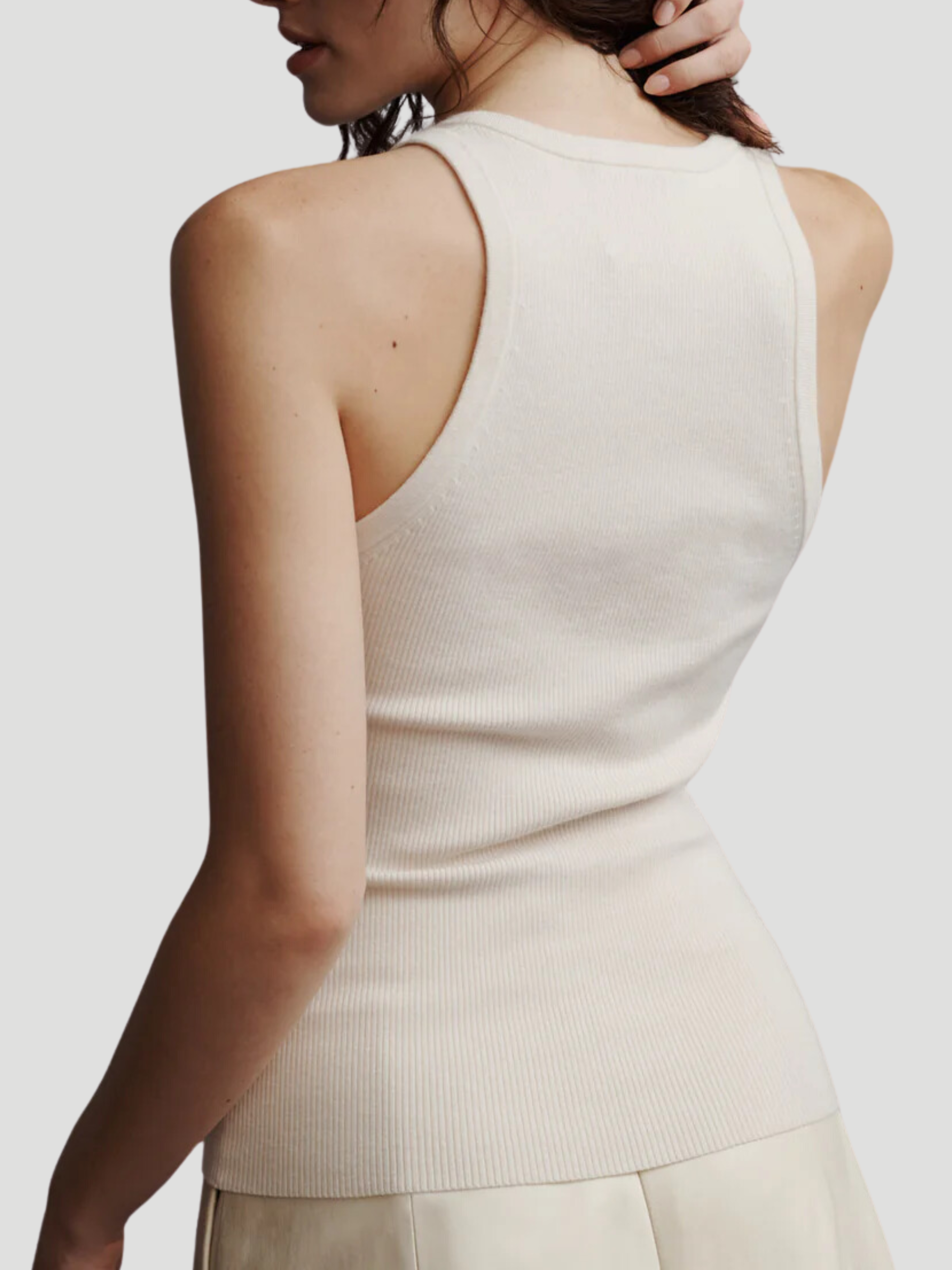 Stay stylish and comfortable with our Perfect Cashmere Tank in Ivory. Made with soft 18-gauge Mongolian cashmere, this scoop neck racerback tank enhances your natural silhouette. Its fully fashioned banded finishes at the neckline and arm holes provide a polished look.
