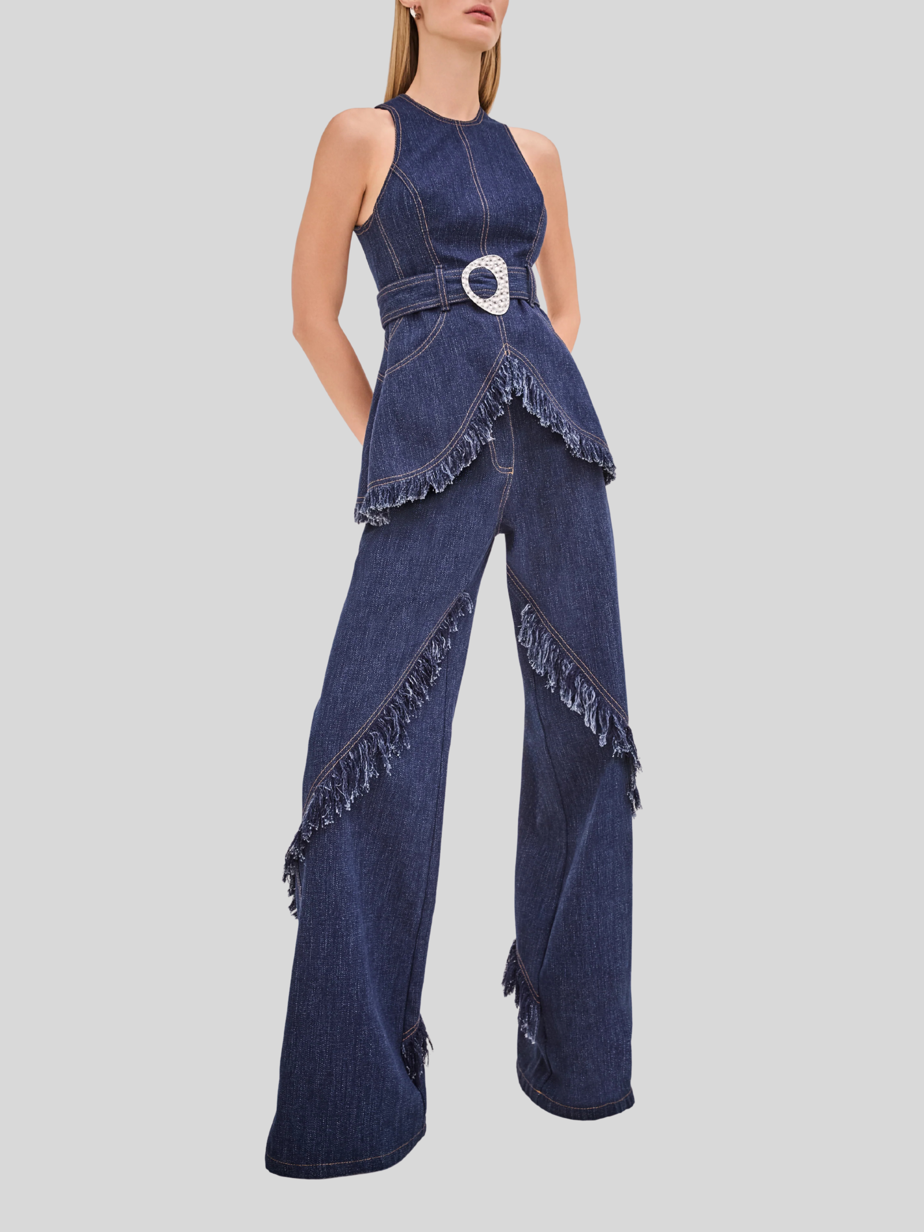 The Reed Top is a fitted sleeveless design featuring fringe detailing, paired with the Braxten Pant.