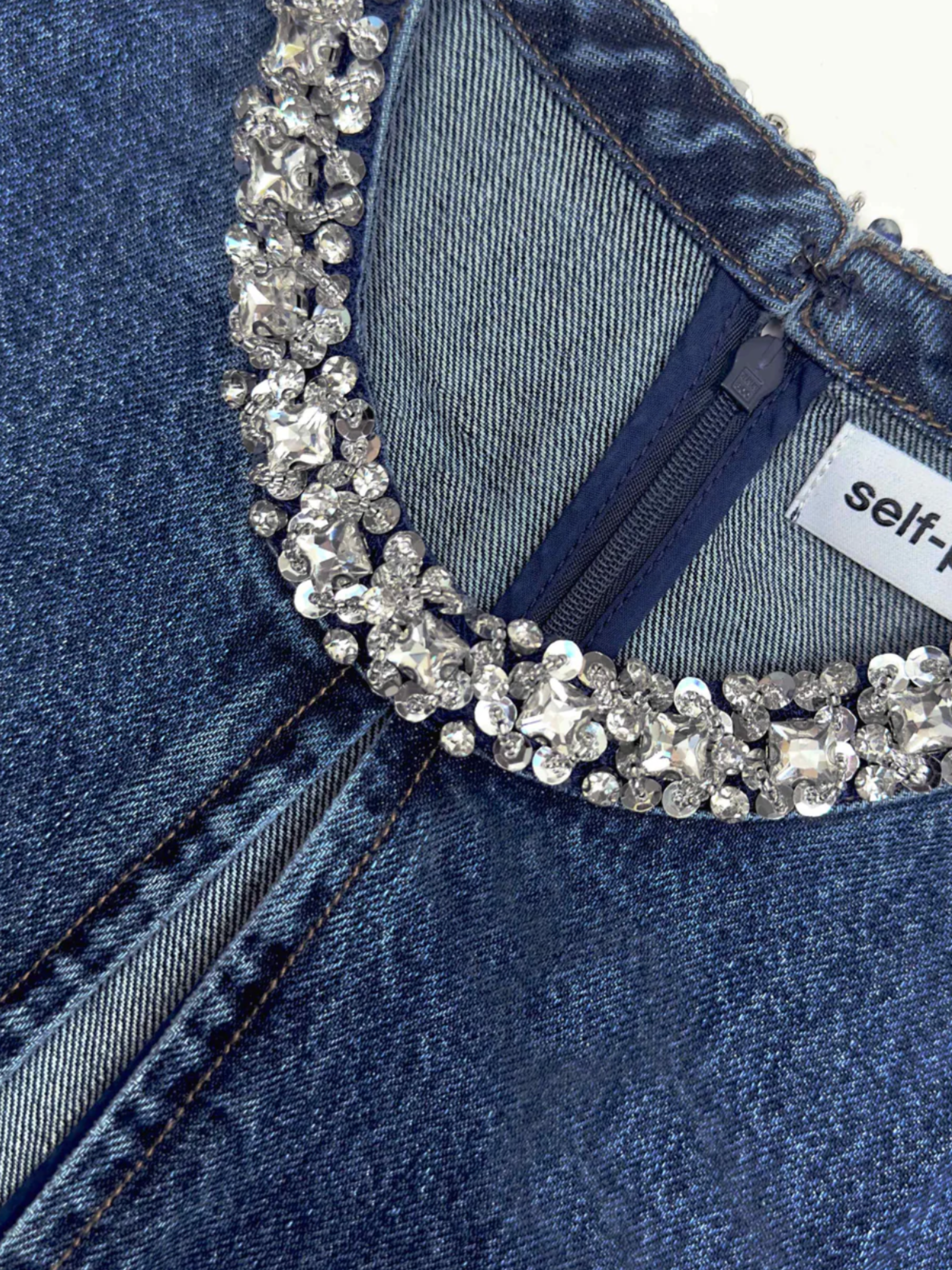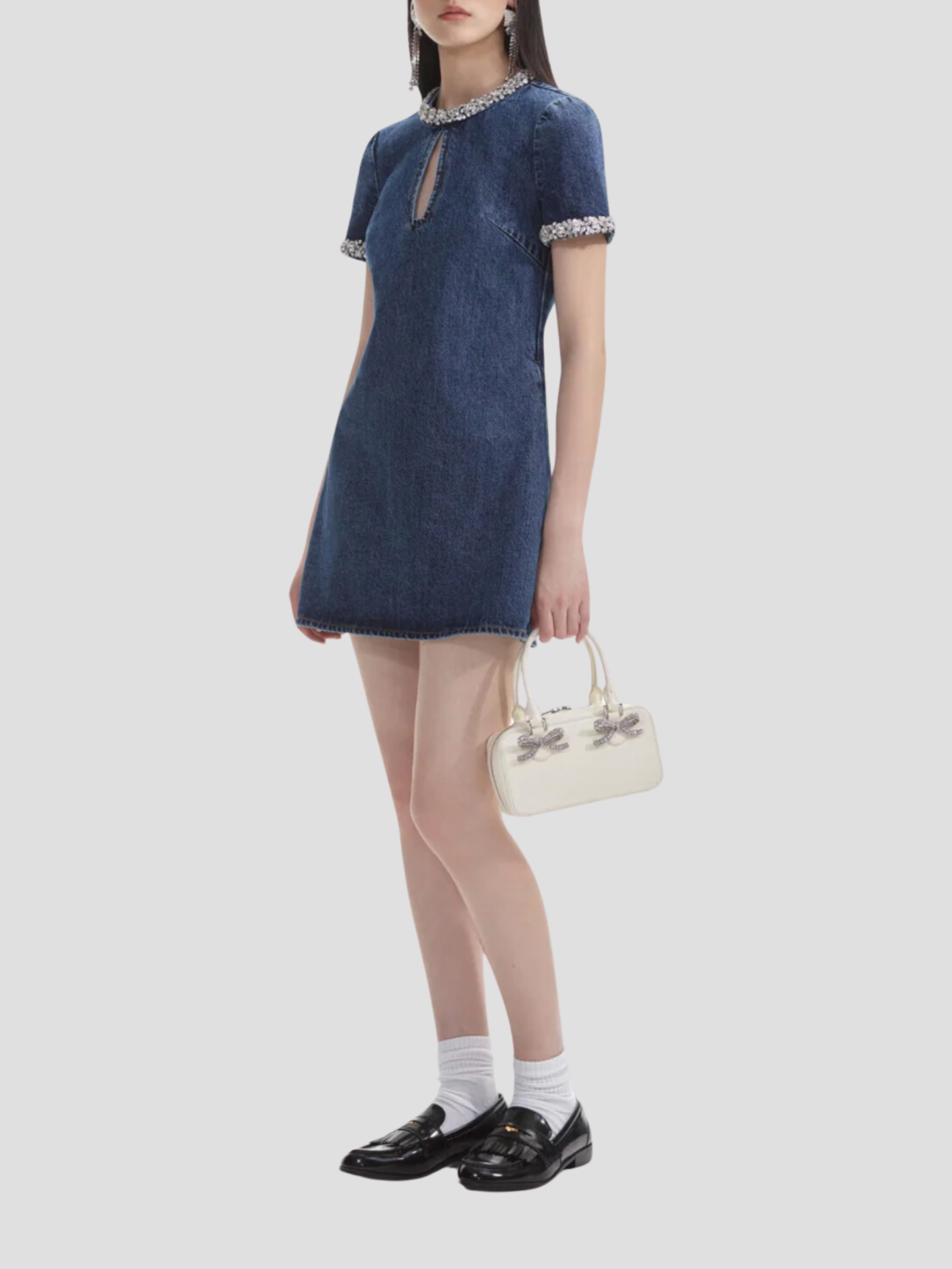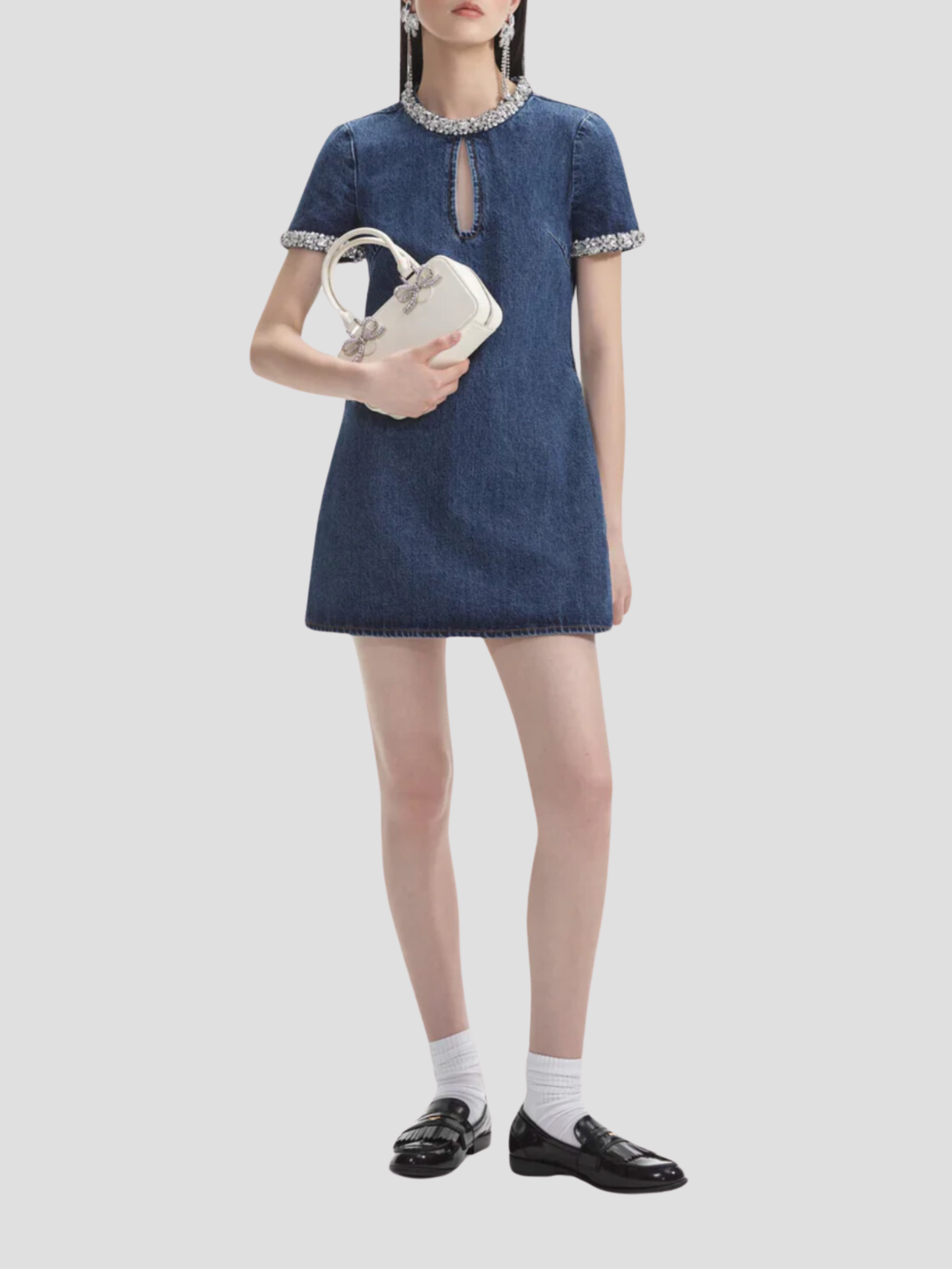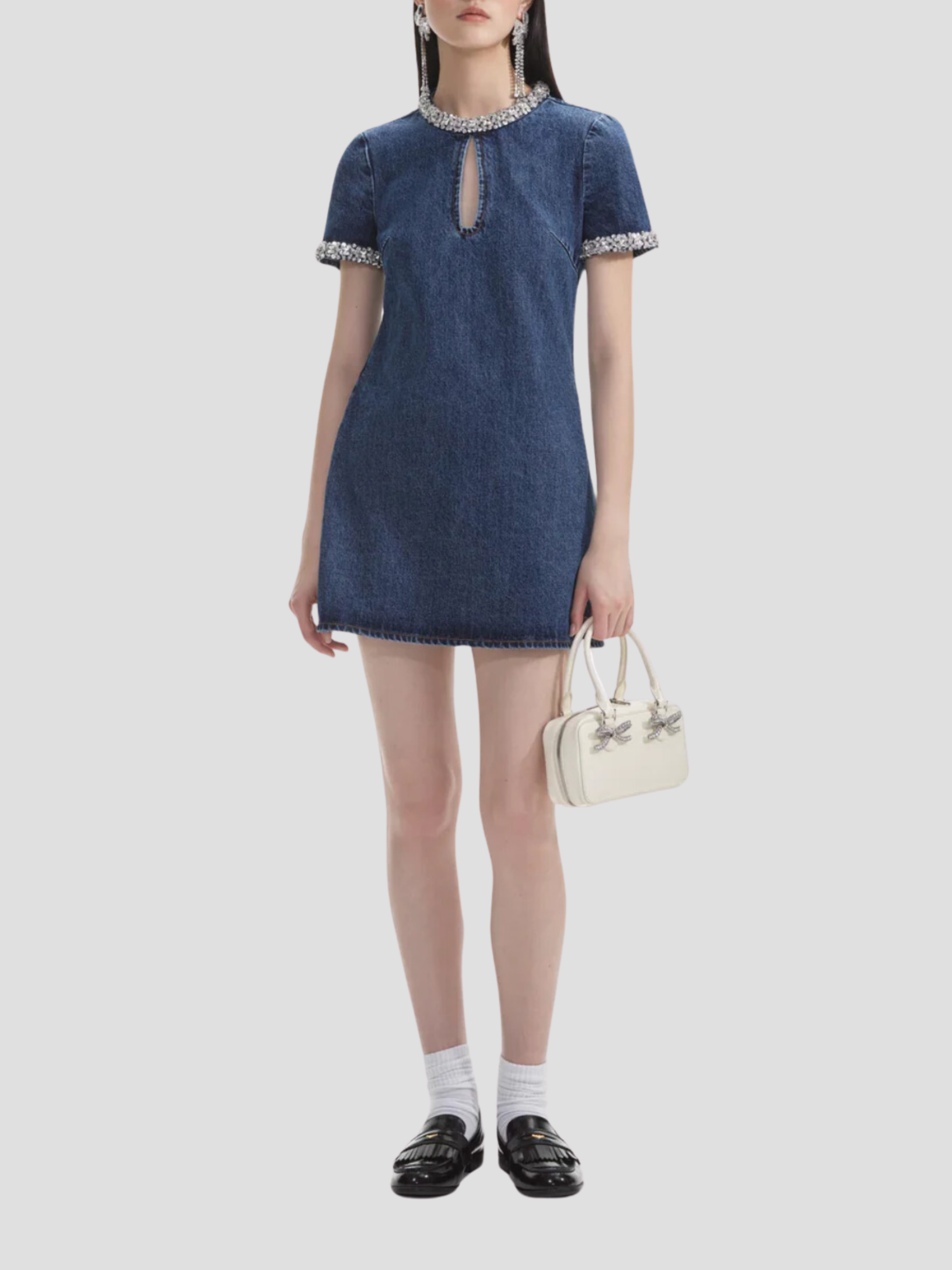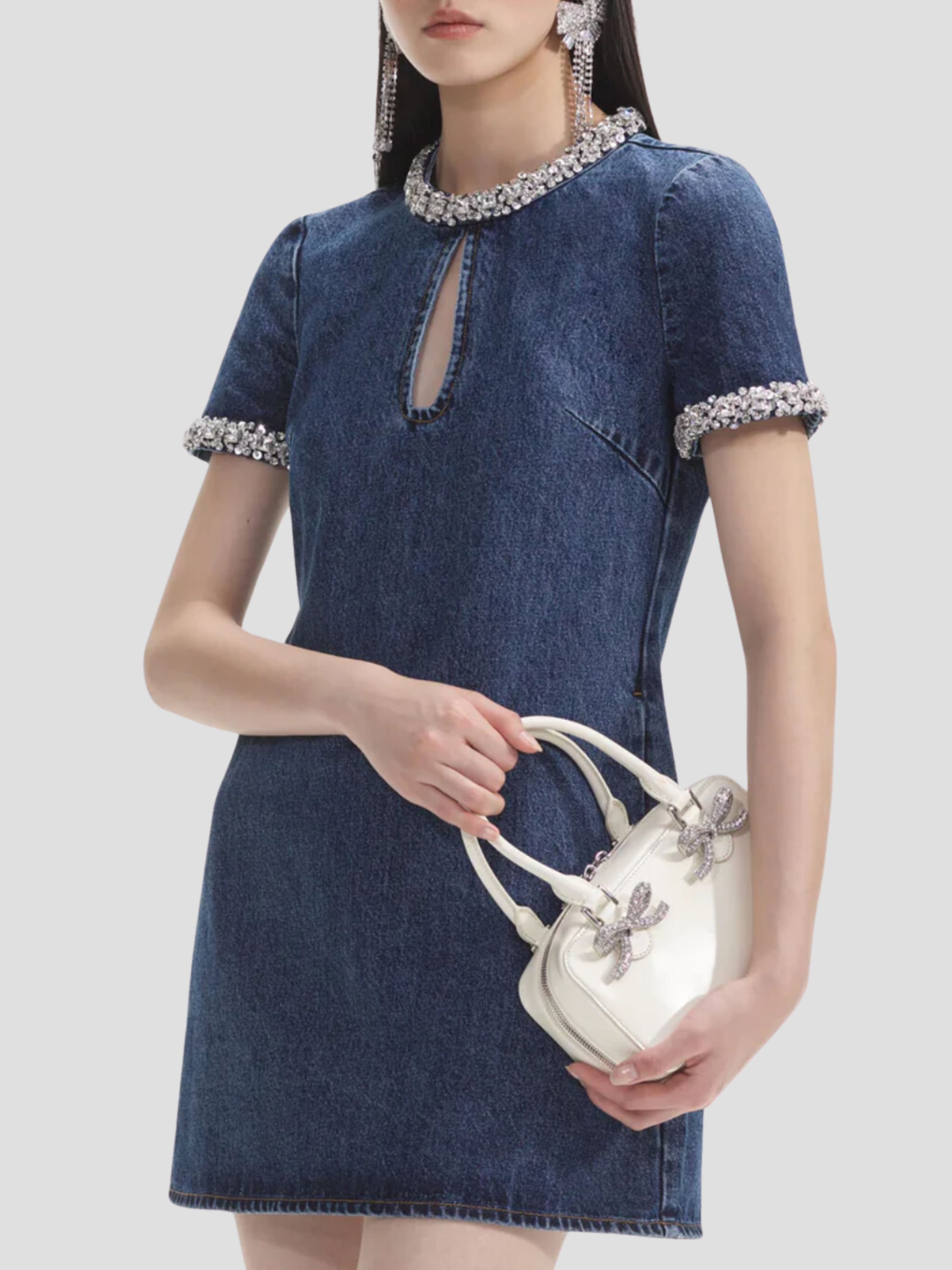 This dress' polished silhouette and embellished trims pair perfectly with timeless true blue denim. Match its diamanté trims with our statement earrings and add sky-high heels for date night.