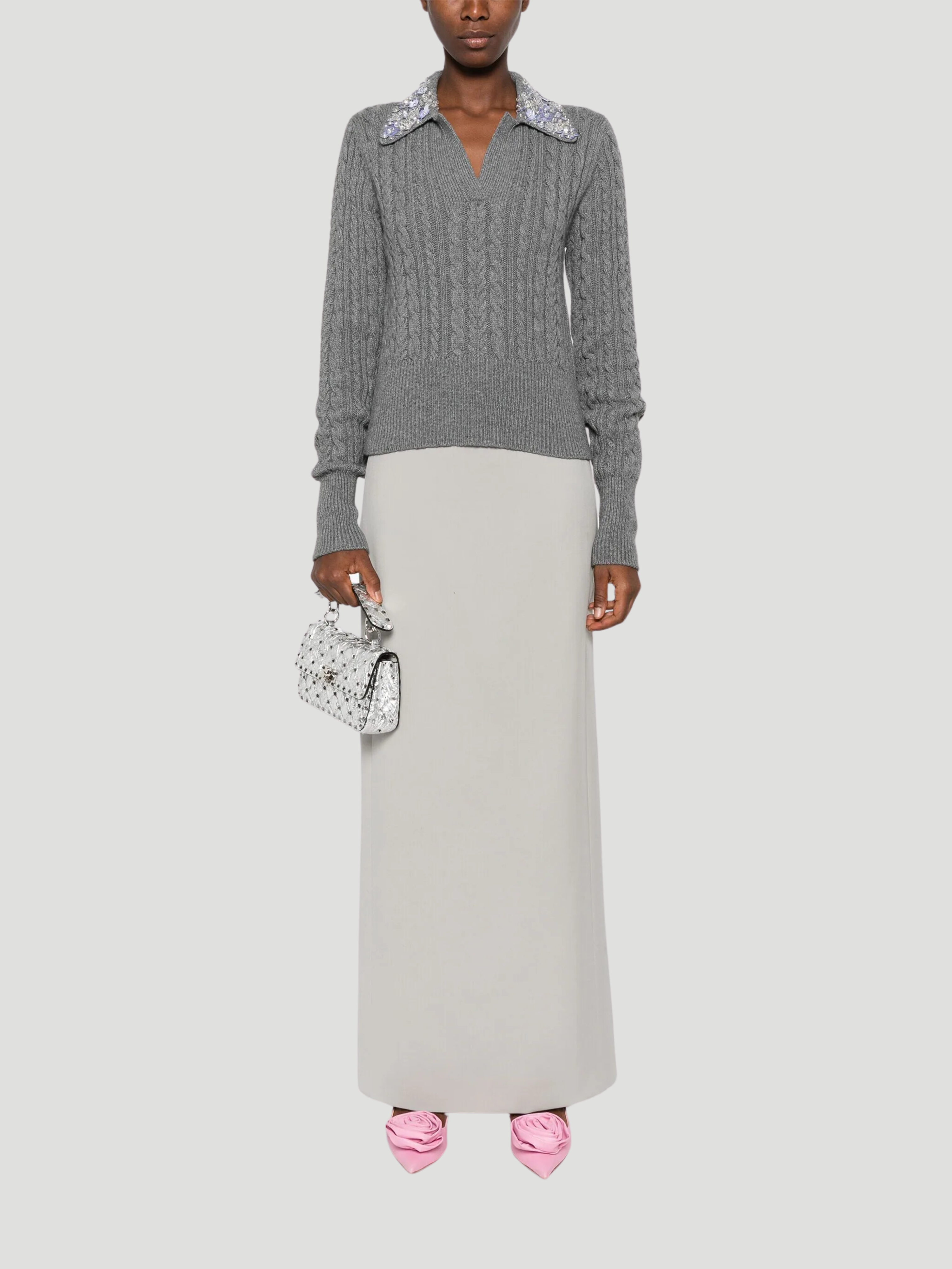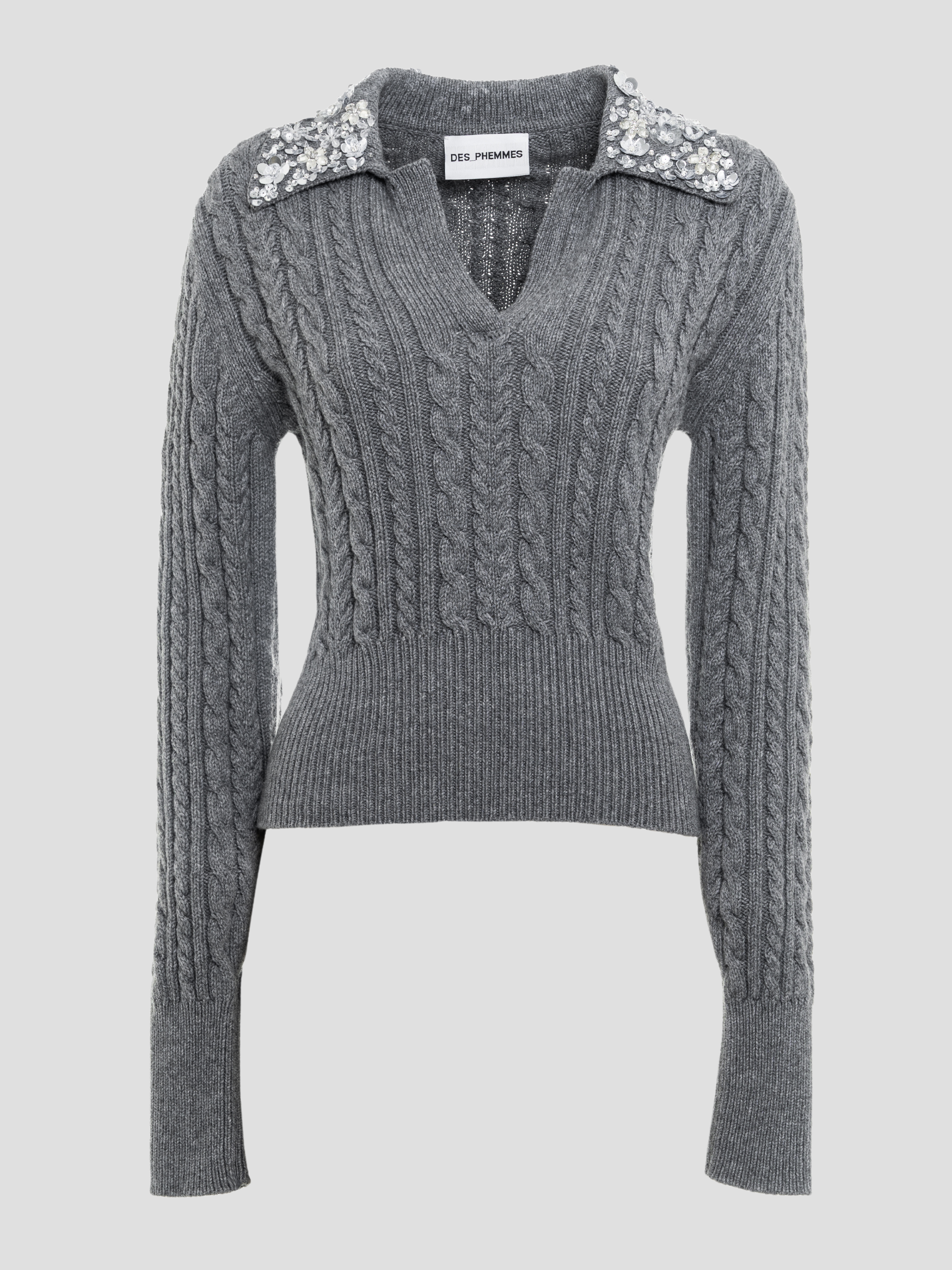 Elevate your party style with Salvo Rizza's cable-knit wool-blend polo sweater from Des Phemmes. The Milan-based designer's hyper-embellished and three-dimensional vision brings a ‘90s sex appeal to this impeccably crafted piece. Featuring a crystal-embellished point collar and split V neckline, this sweater is the perfect blend of Italian craft and statement fashion.