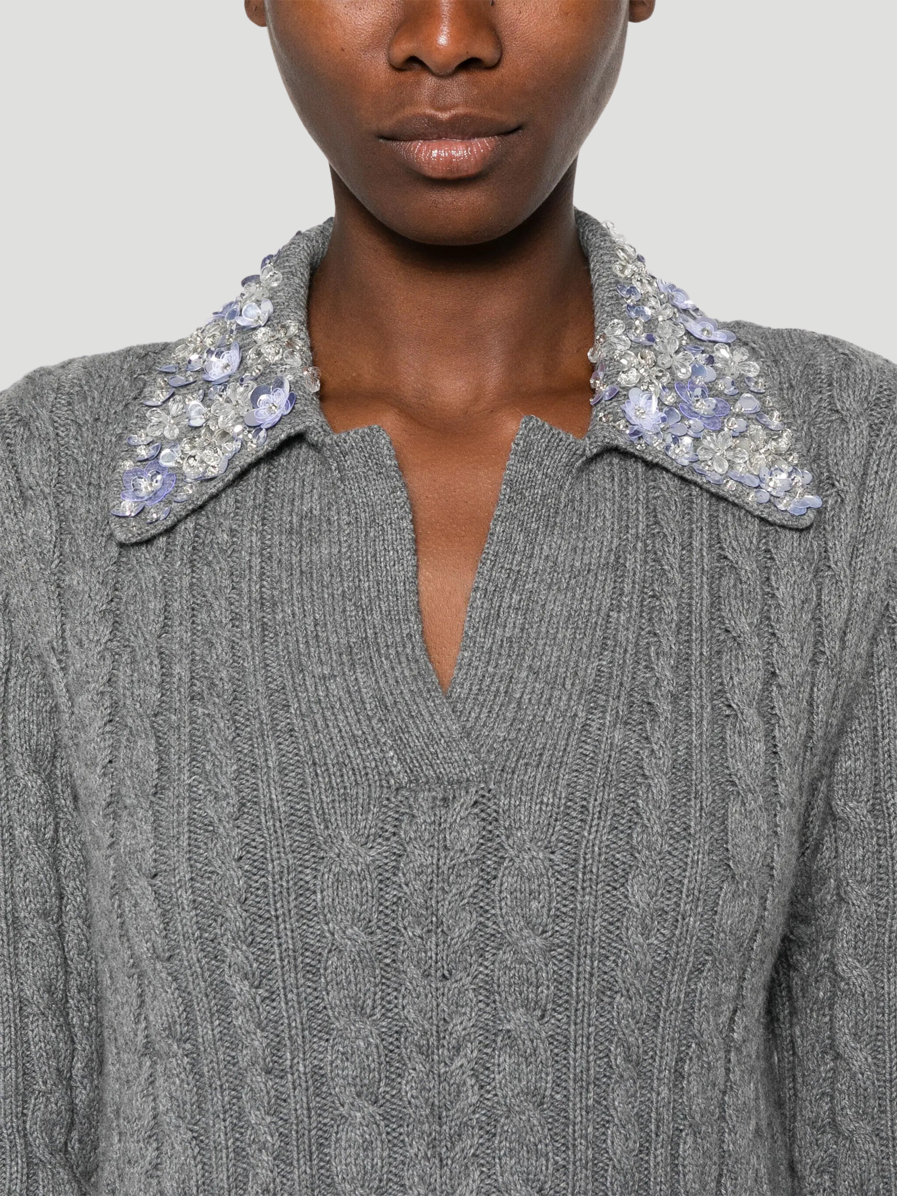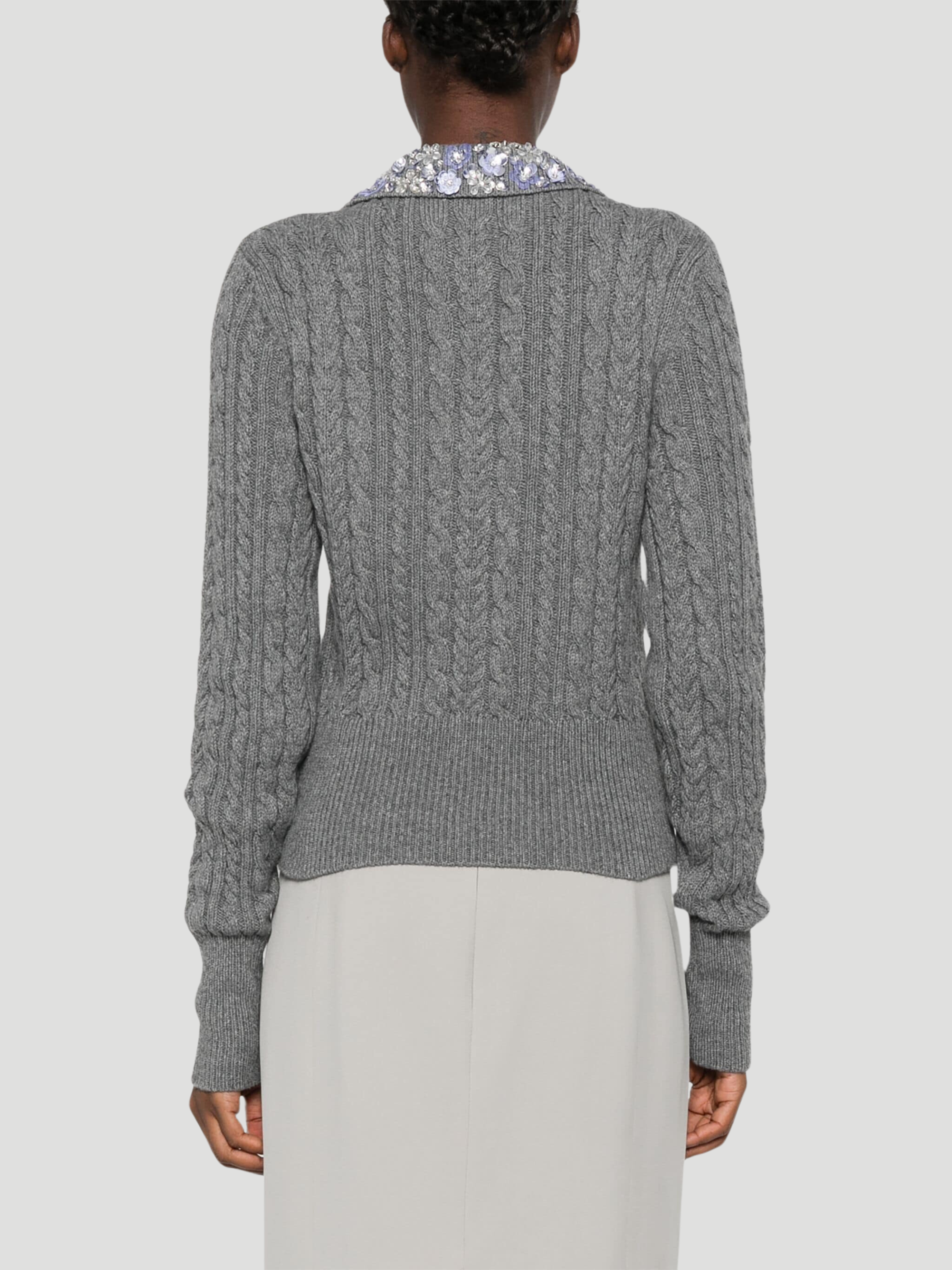 Cable-Knit Wool-Blend Polo Sweater with Crystal Embellishments
