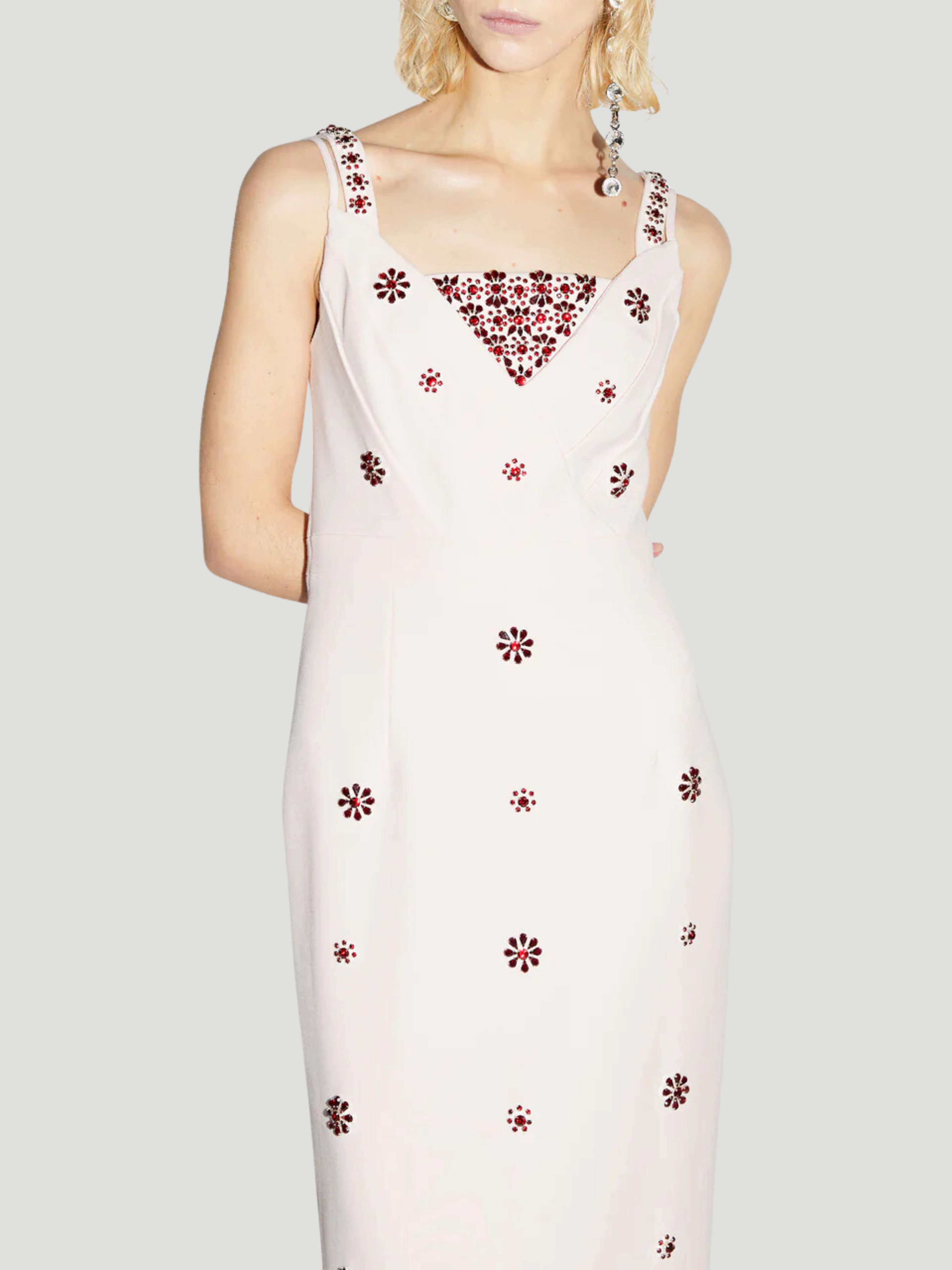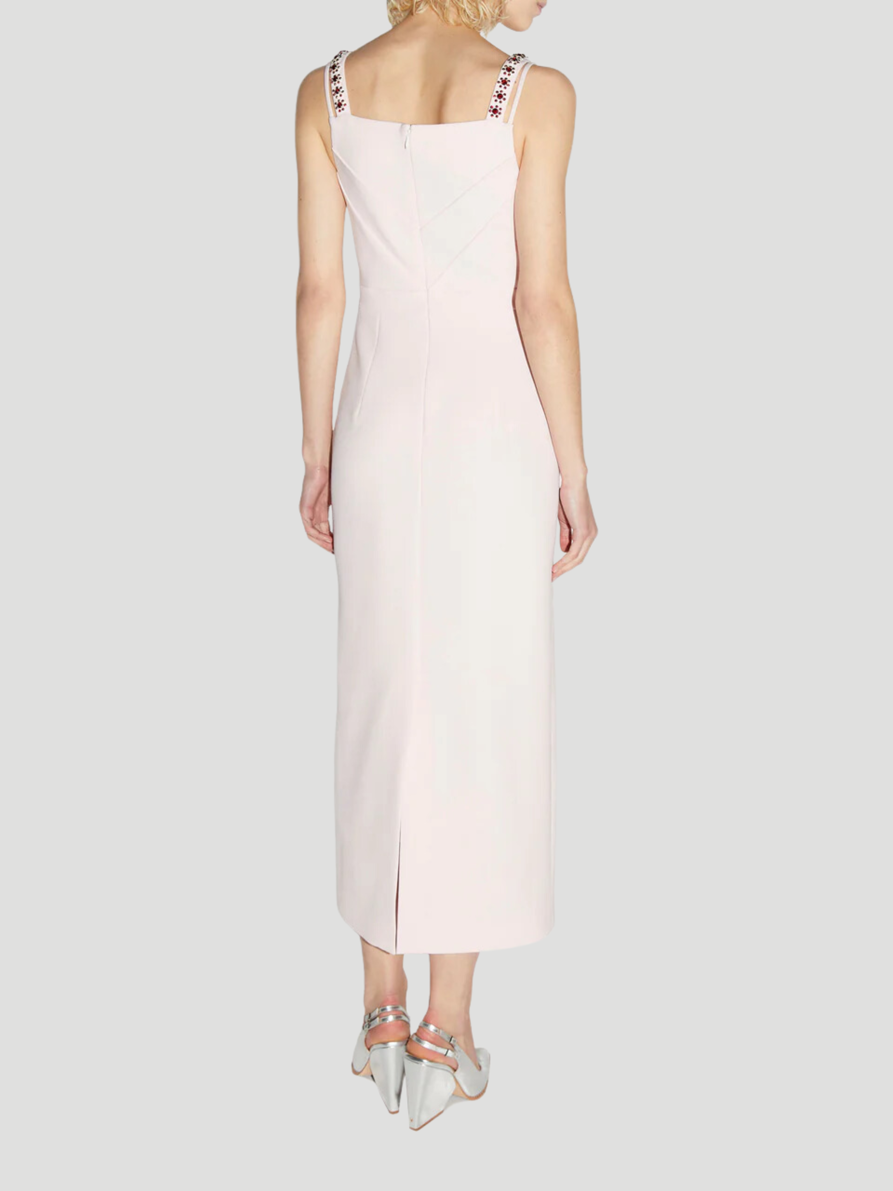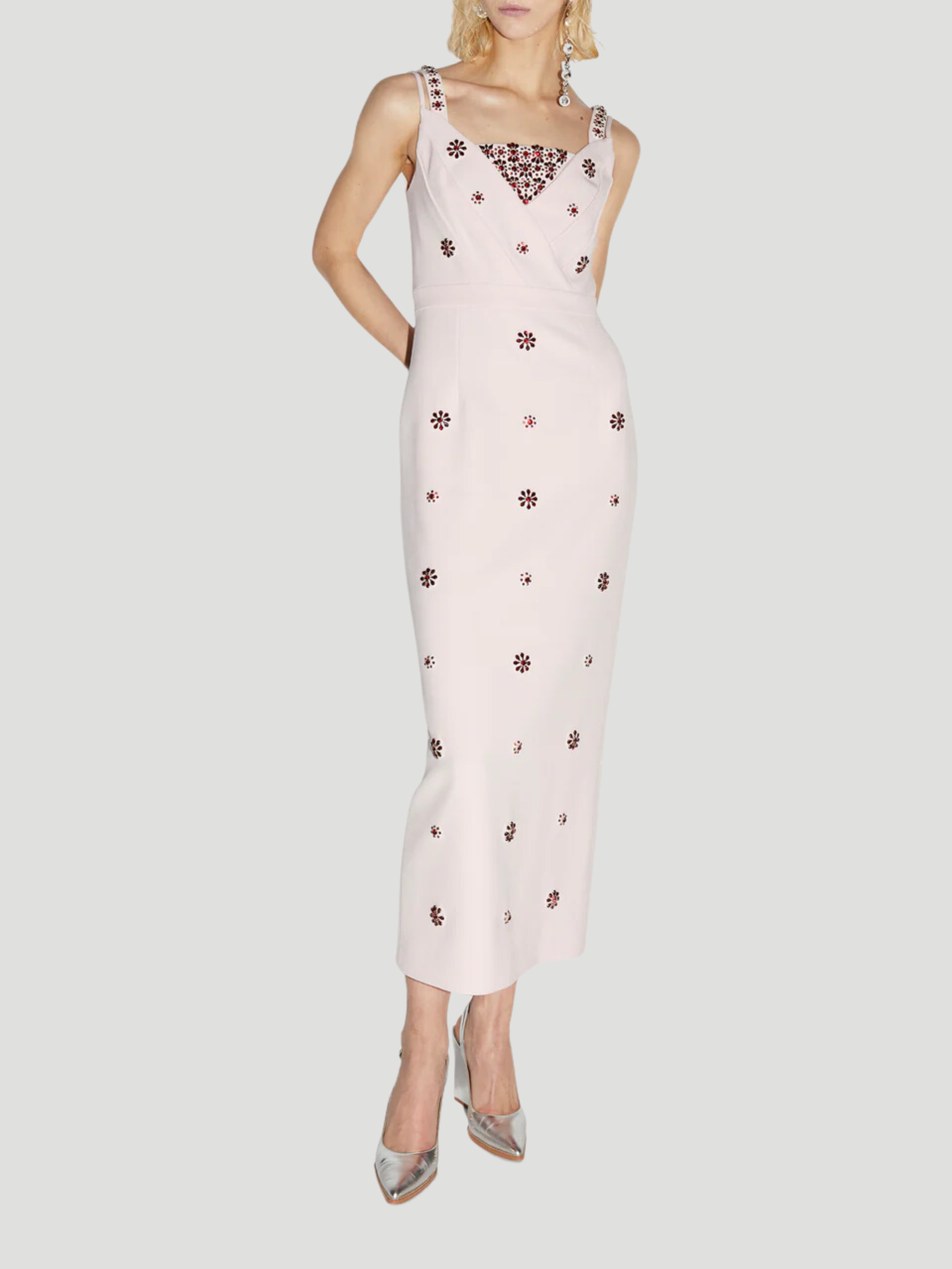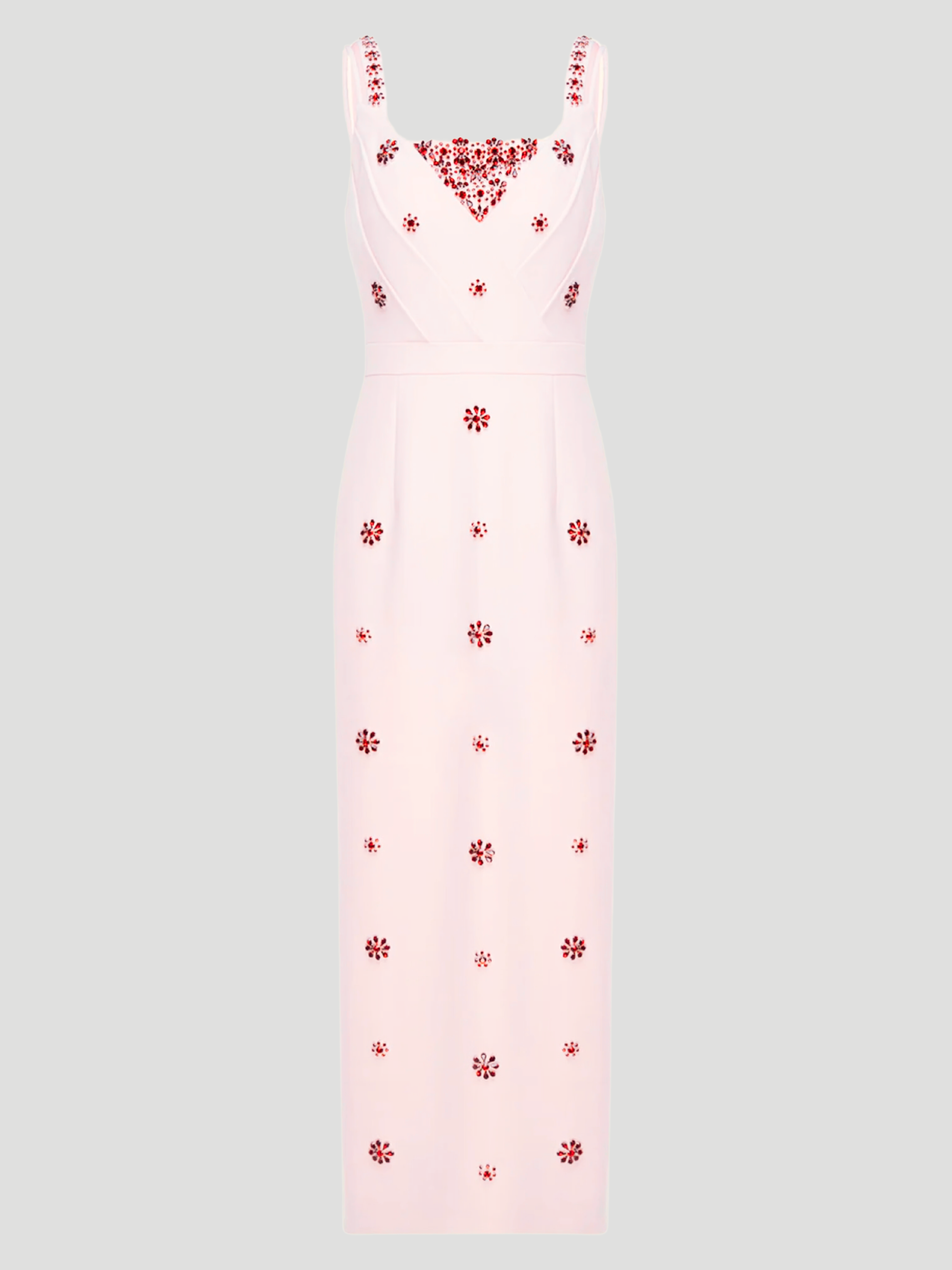 The Arlene dress exudes opulence and elegance with its delicate pale pink canvas and intricate crystal embellishments. Designed with darted seams and a fitted waistline, it offers a slim and flattering silhouette. Perfect for formal occasions, this dress is a must-have for any fashion-forward individual.